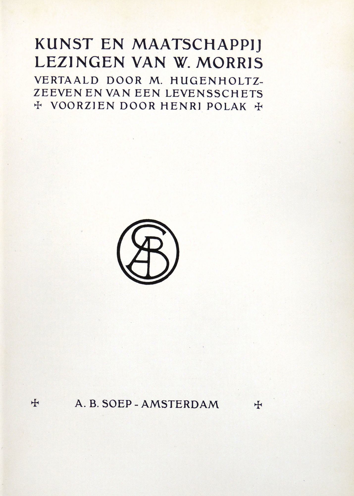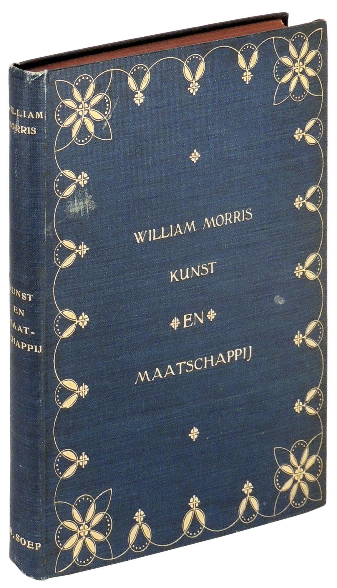 Amsterdam: A.B. Soep, 1903. Hardcover. Very Good. Hardcover. In Dutch. Includes chapters on the life of Morris, his craft art, art in Socialism, and more. Bound in dark blue cloth covered boards with gilt title to spine and front board. Decorative gilt floral border to front board. Minor wear to edges of boards and spine ends. A few spots of rubbing / discoloration to front board. Includes frontispiece portrait of Morris. 159 pages. MOR/011623.