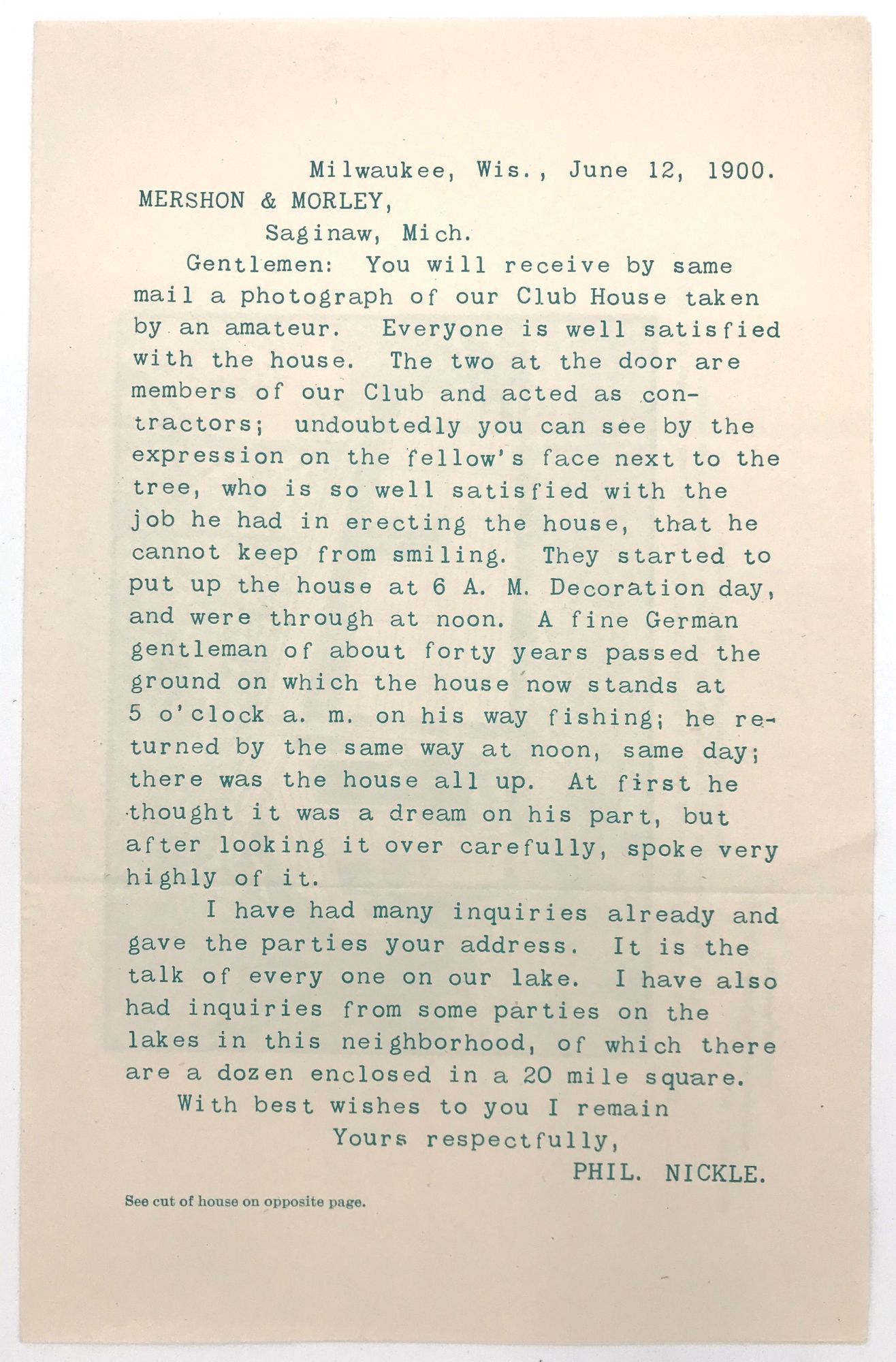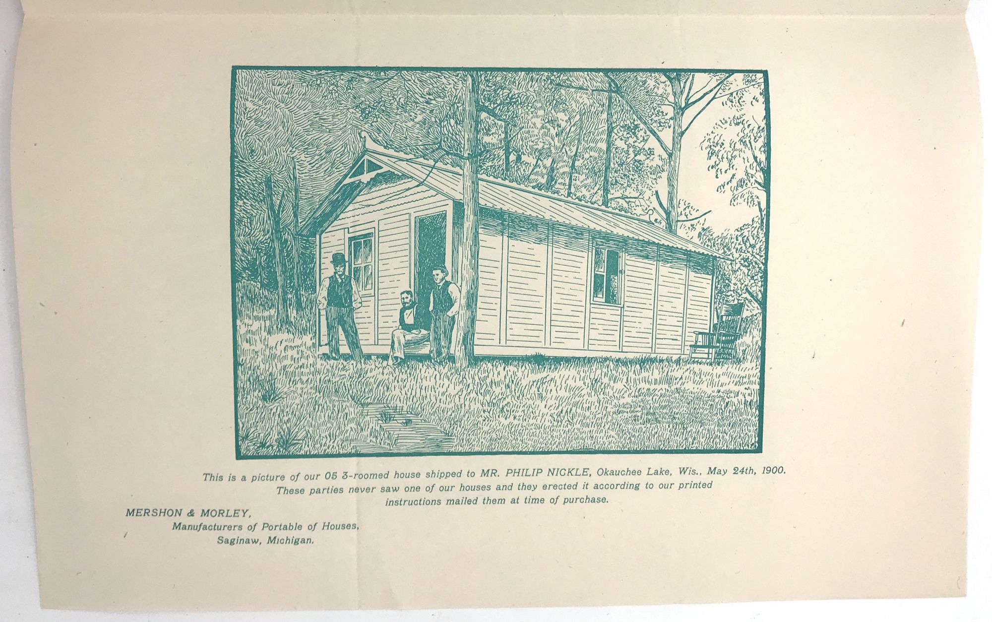 Saginaw, Michigan: Mershon & Morley, 1900. Fine. Letter folds.. Printed bifolium advertisement (8.5" by 5.5") for "Portable Houses" produced by Mershon & Morley of Saginaw, Michigan. First leaf features a printed testimonial letter from a happy customer, promoting the ease of the structure's assembly; the second leaf features an illustration of the fully erected home with three gentlemen admiring their handiwork.