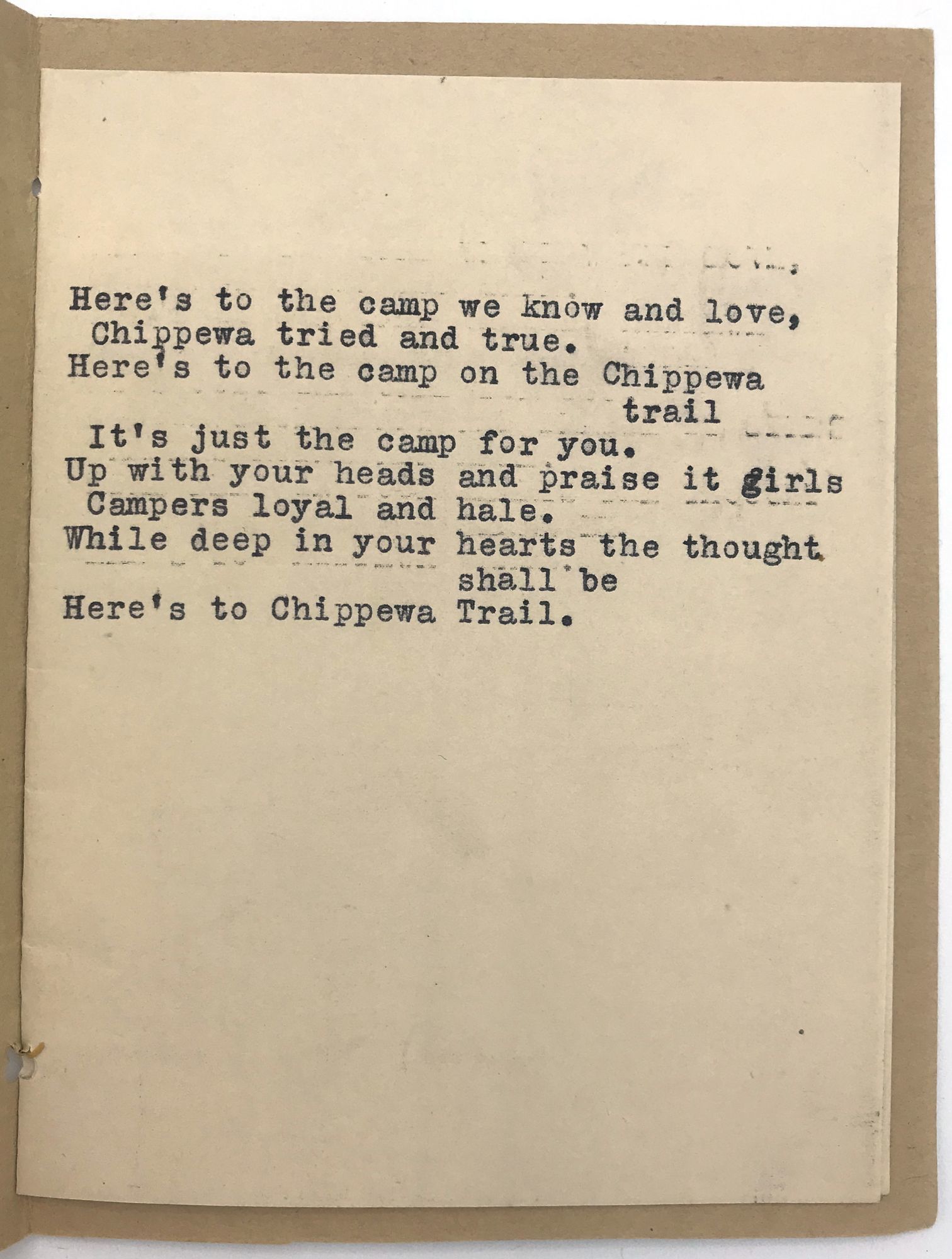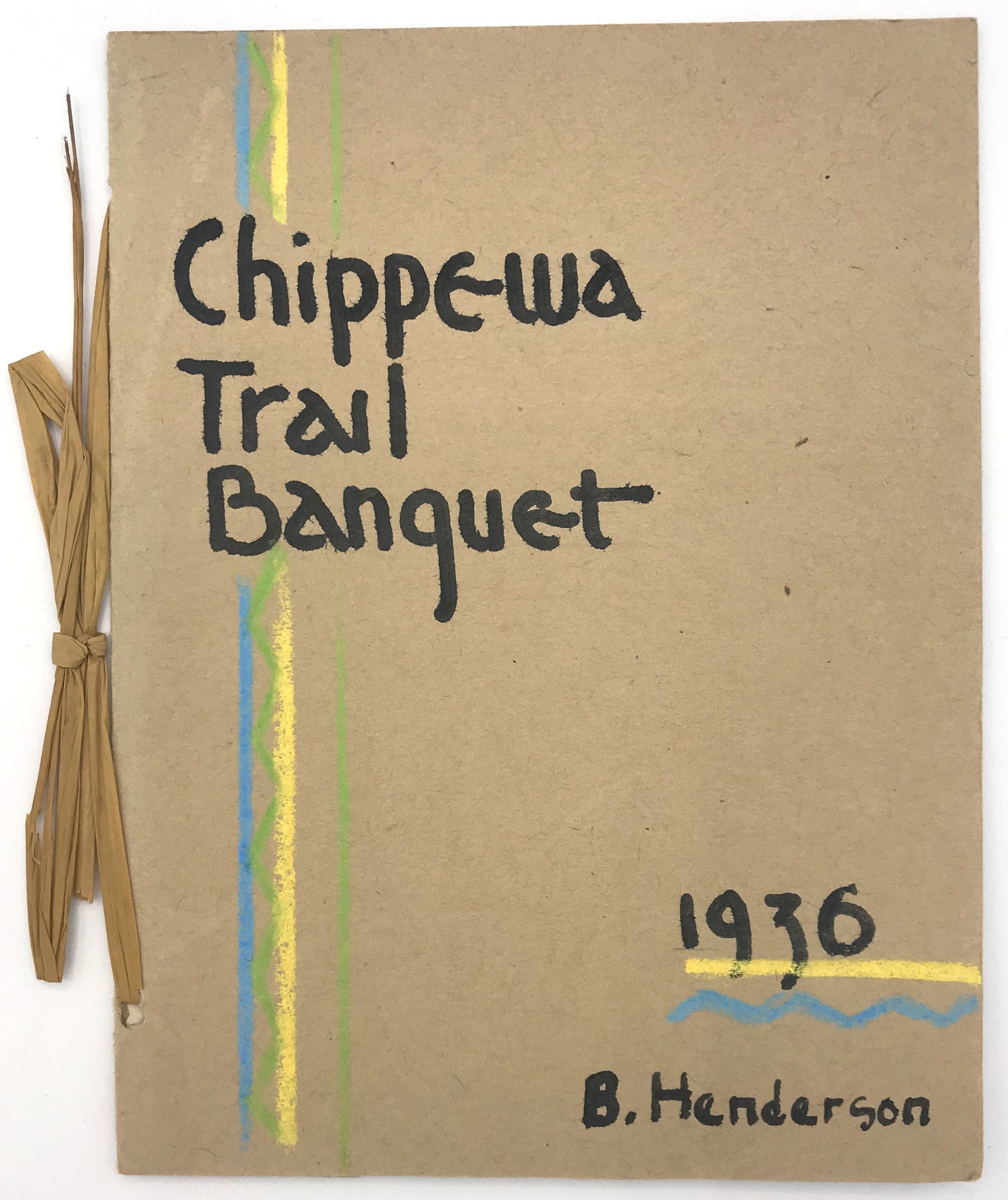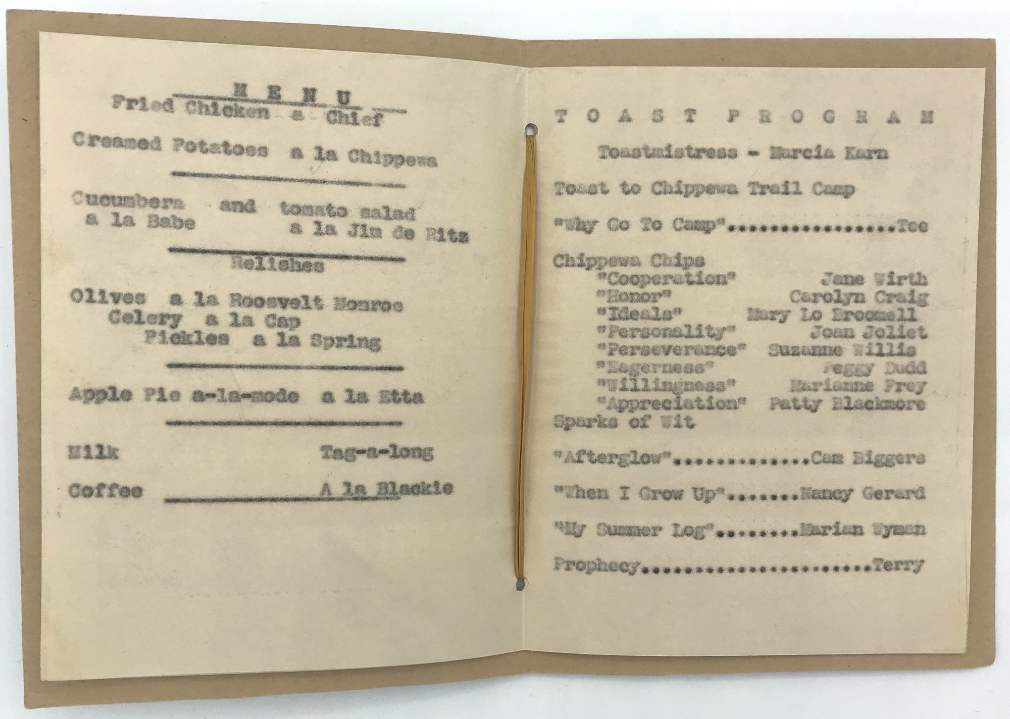 Elk Lake, Michigan: Chippewa Trails Camp for Girls, 1936. Fine.. Typewritten/mimeographed menu and toast program for the 1936 Chippewa Trail Banquet, held by the Chippewa Trails Camp for Girls in 1936. The wrappers have been hand-lettered and decorated with colored pencil, with the attendee's name in the lower right-hand corner: B[arbara] Henderson (presumably of Pleasant Ridge, Michigan). Includes a very charming camp rhyme on the first page that reads, "Here's to the camp we know and love, Chippewa tried and true. Here's to the camp on the Chippewa trail, It's just the camp for you. Up with your heads and praise it girls, Campers loyal and hale. While deep in your hearts the thought shall be, Here's to Chippewa Trail."