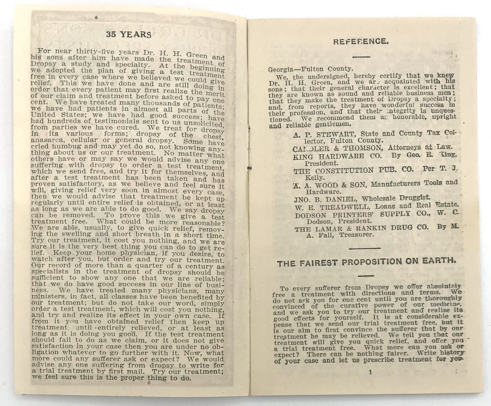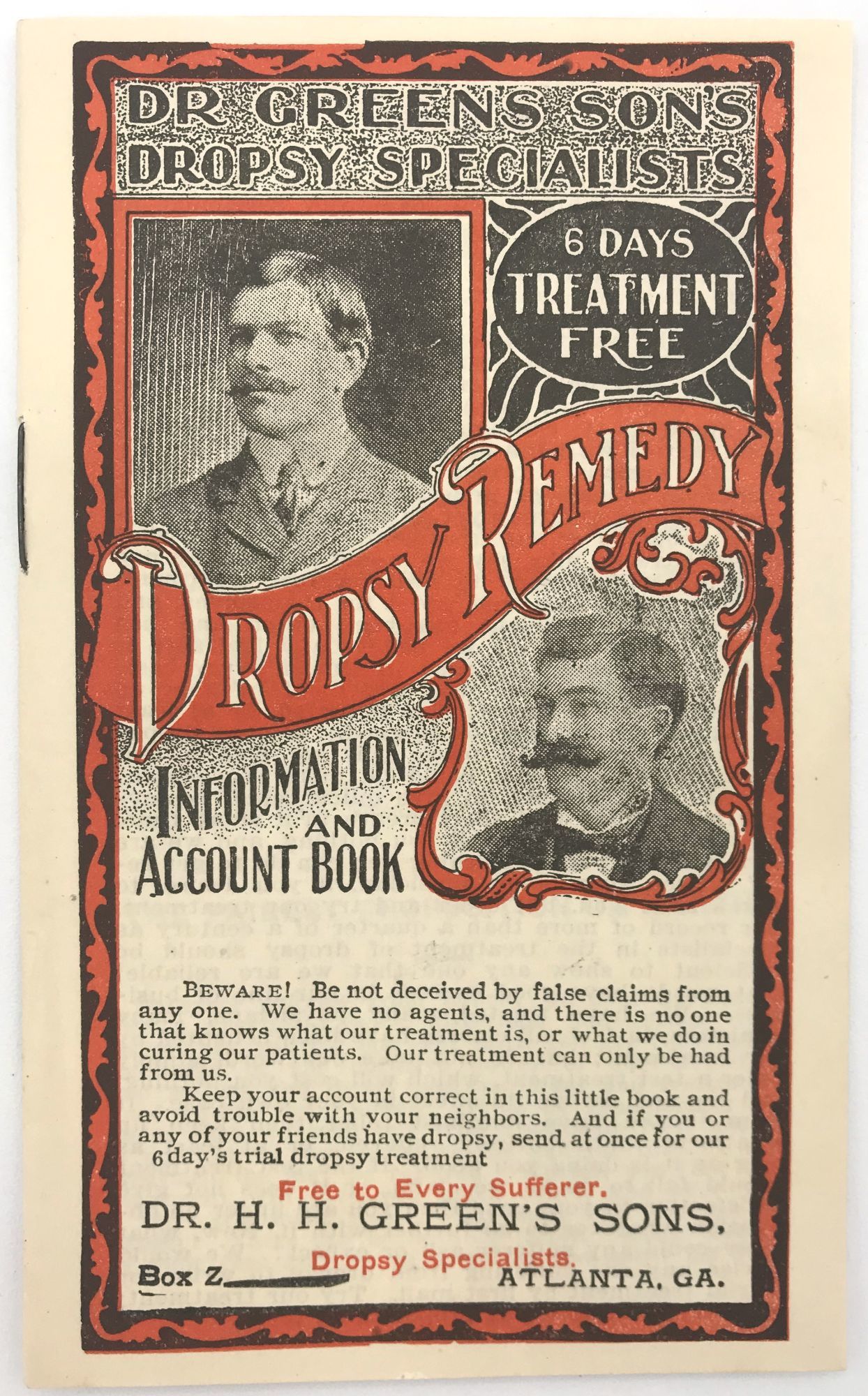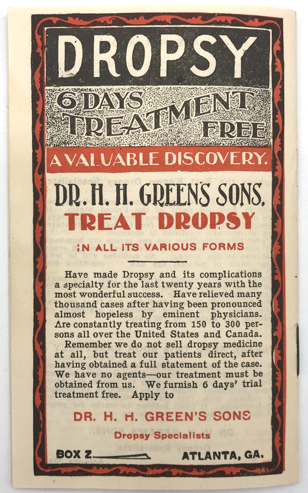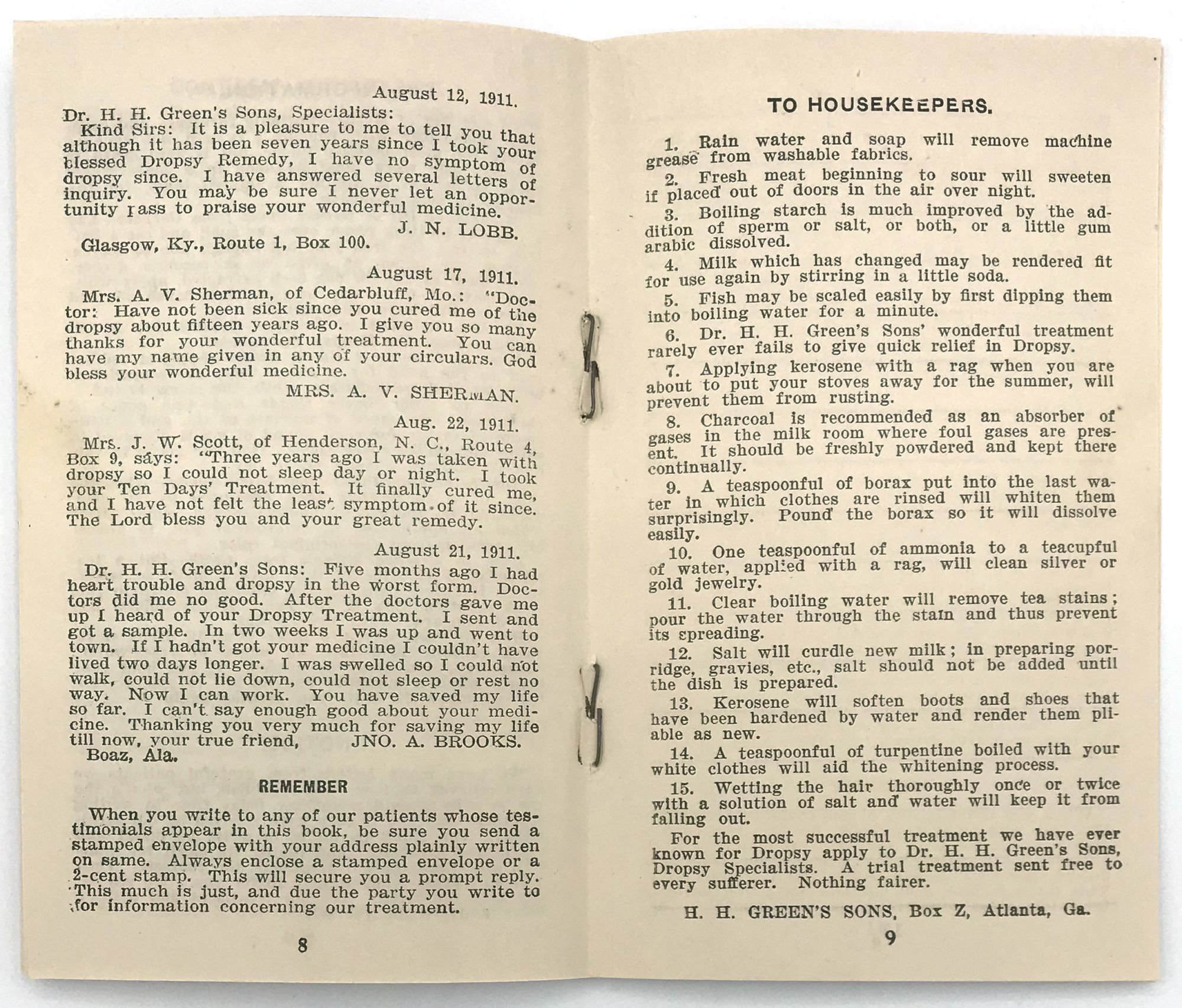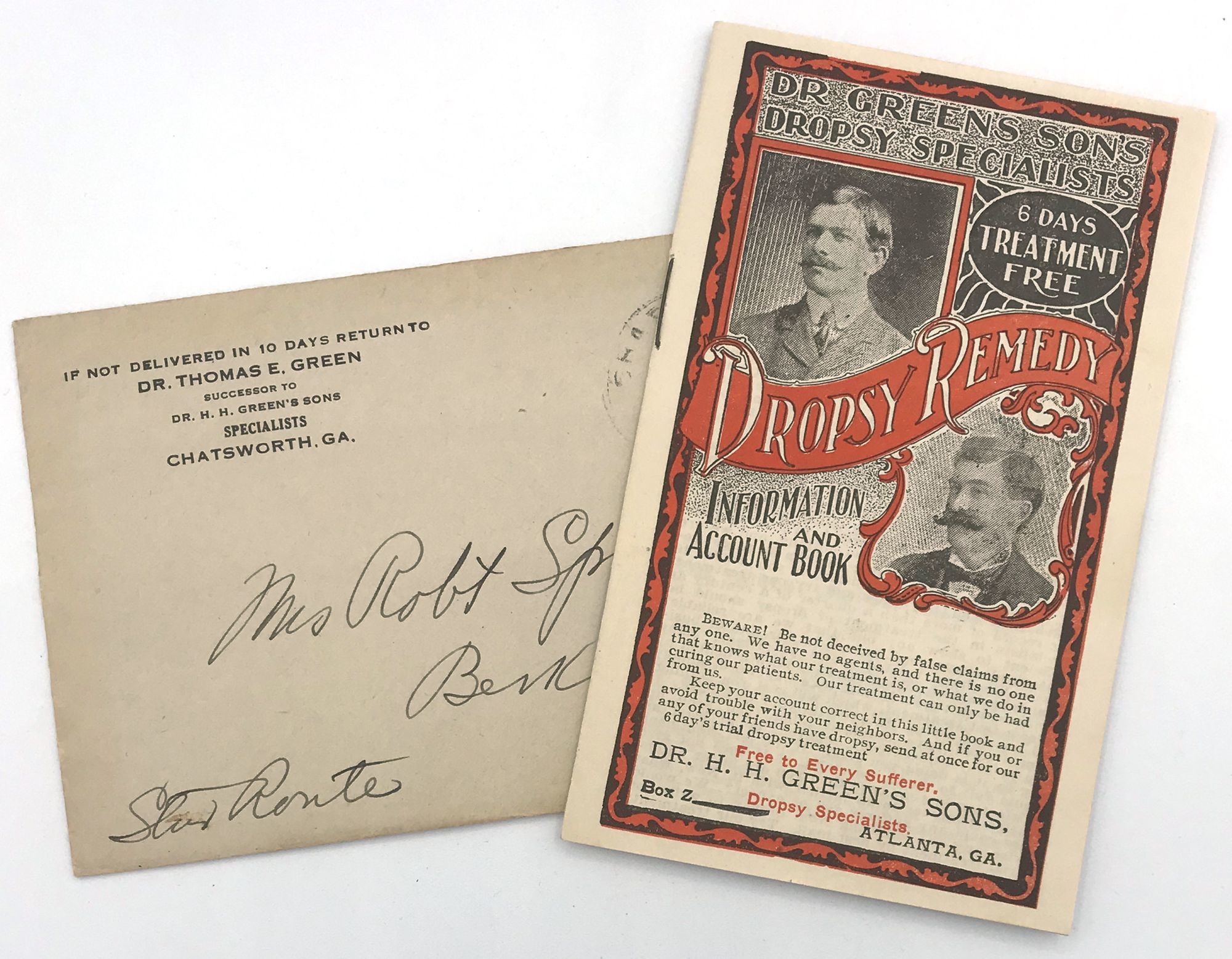 Atlanta, Georgia: Dr. H.H. Green's Sons, 1912. Very good to fine. Some dust soiling, tears to envelope,. Booklet advertising Dr. Green's Sons' remedy for dropsy, including a summary of the company, description of the affliction, several testimonials, and a mail-in order form with health questionnaire. Also includes several blank pages of lined paper for notes, and tips for domestic workers and housewives such as how to remove tea stains, or prevent hair loss. Much like an almanac, it contains a plethora of quick conversions such as how many square yards are in an acre, or how many pounds a bushel of oats weighs.