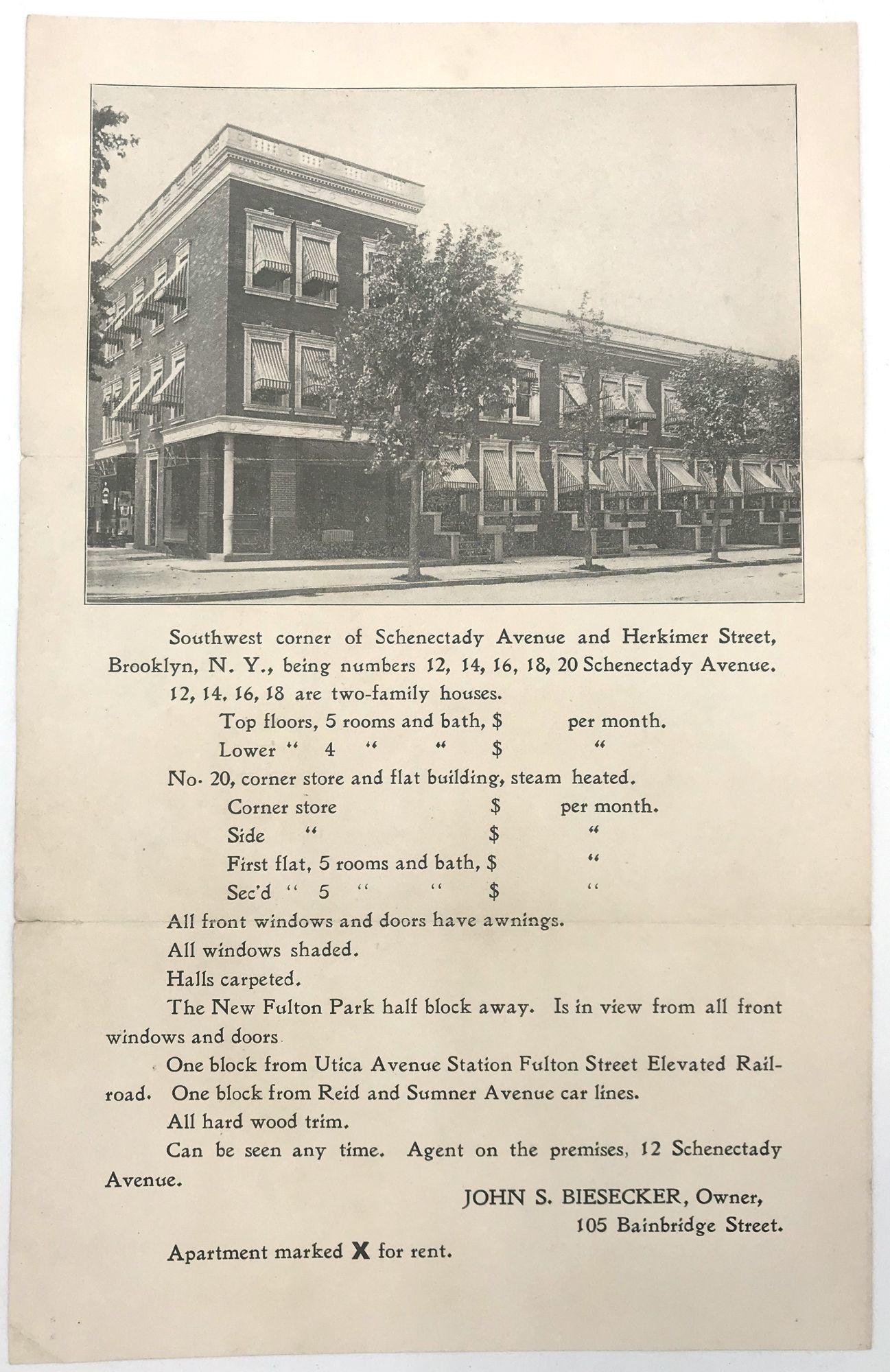 Brooklyn, New York, 1911. John Stokes Biesecker (1860-1915) was a Pennsylvania native who moved to Brooklyn and made his fortune in the dairy business, splitting his time between his residence at 105 Bainbridge Street and his farm in Pennsylvania.. A window into the ever-shifting built landscape in Brooklyn, New York, in the first half of the twentieth century: an illustrated circular advertising the sale of a large building at the southwest corner of Schenectady Avenue and Herkimer Street in Stuyvesant Heights, circa 1911, owned by local businessman John S. Biesecker. Includes large photograph of the building, and lists the number of units, as well as nearby landmarks. The building appears to have been demolished and replaced by newer units since.