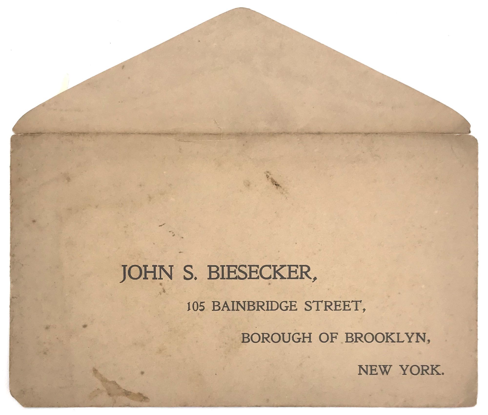 Measures 9.25" by 6"; verso blank. Housed in printed stationary envelope with the name and address of John S. Biesecker.