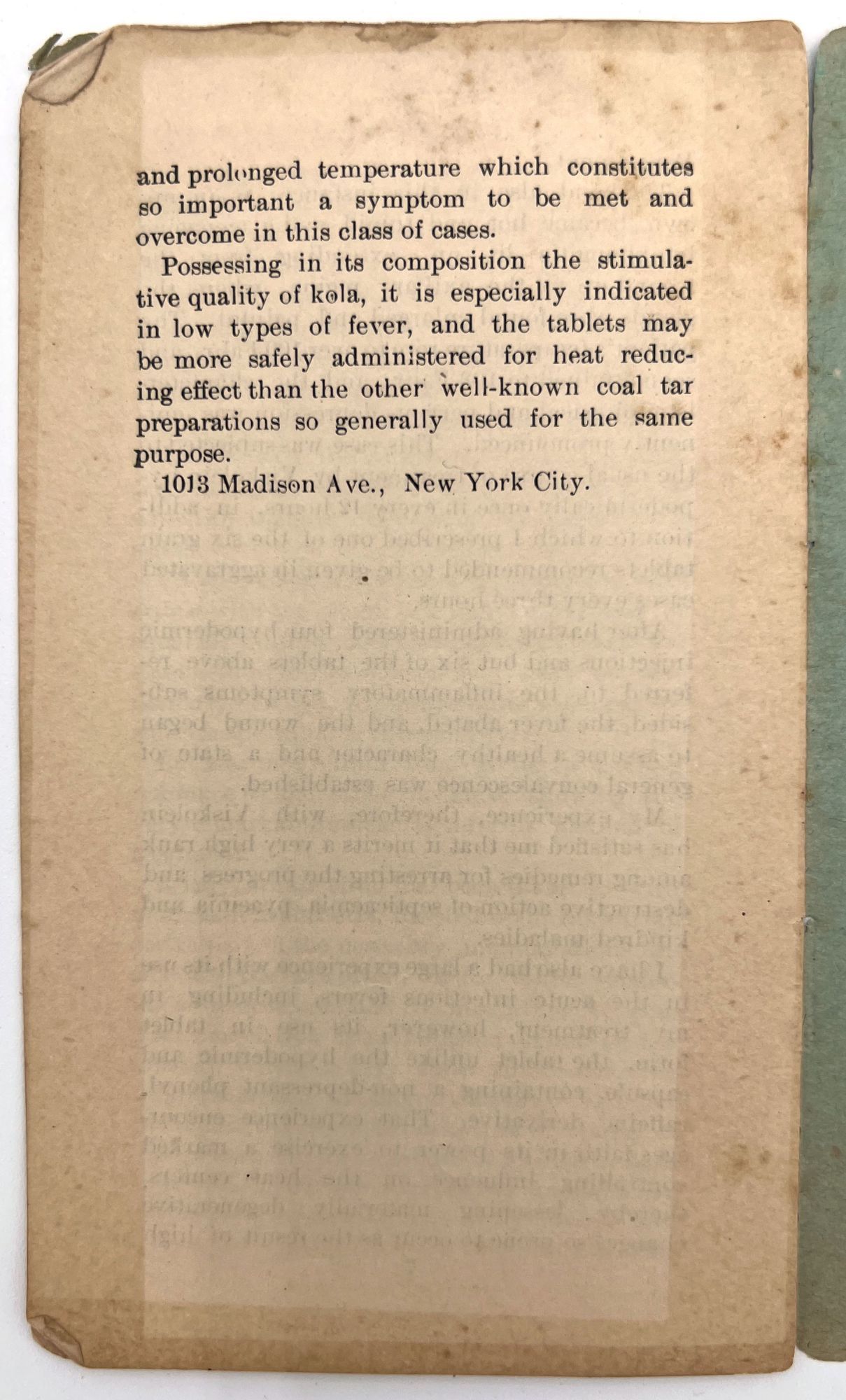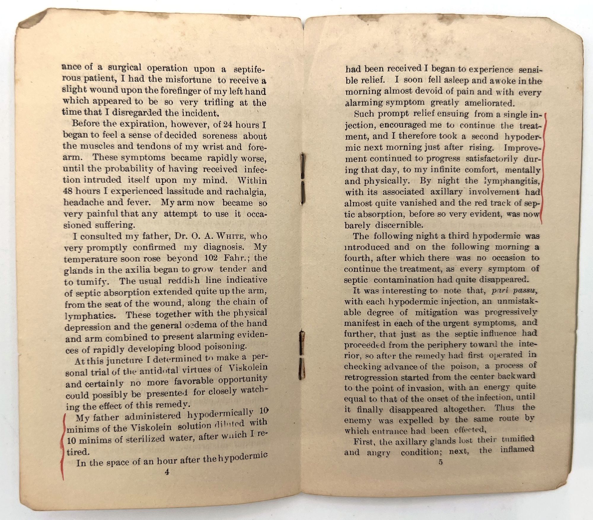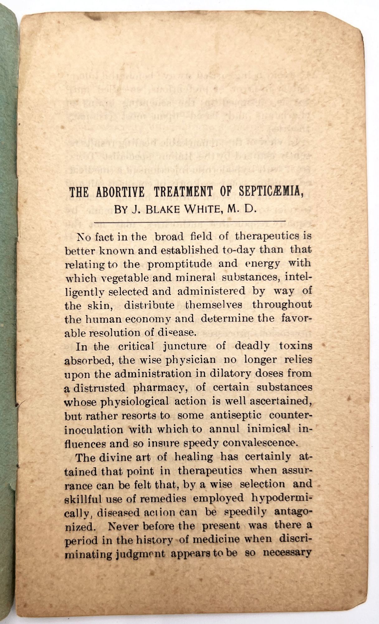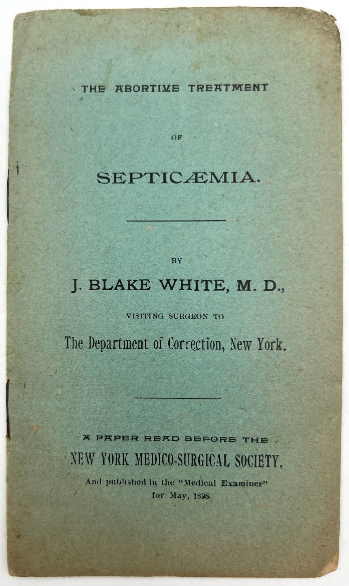 1898. Very good. Minor toning, chipping to extremities.. Offprint of the May 1898 issue of the "Medical Examiner", reprinting a paper read before the New York Medico-Surgical Society by Dr. J. Blake White, "Visiting Surgeon to the Department of Correction, New York". Within, White advocates for the use of Viskolein in the treatment of sepsis, pyaemia, and "kindred maladies" (p. 7).