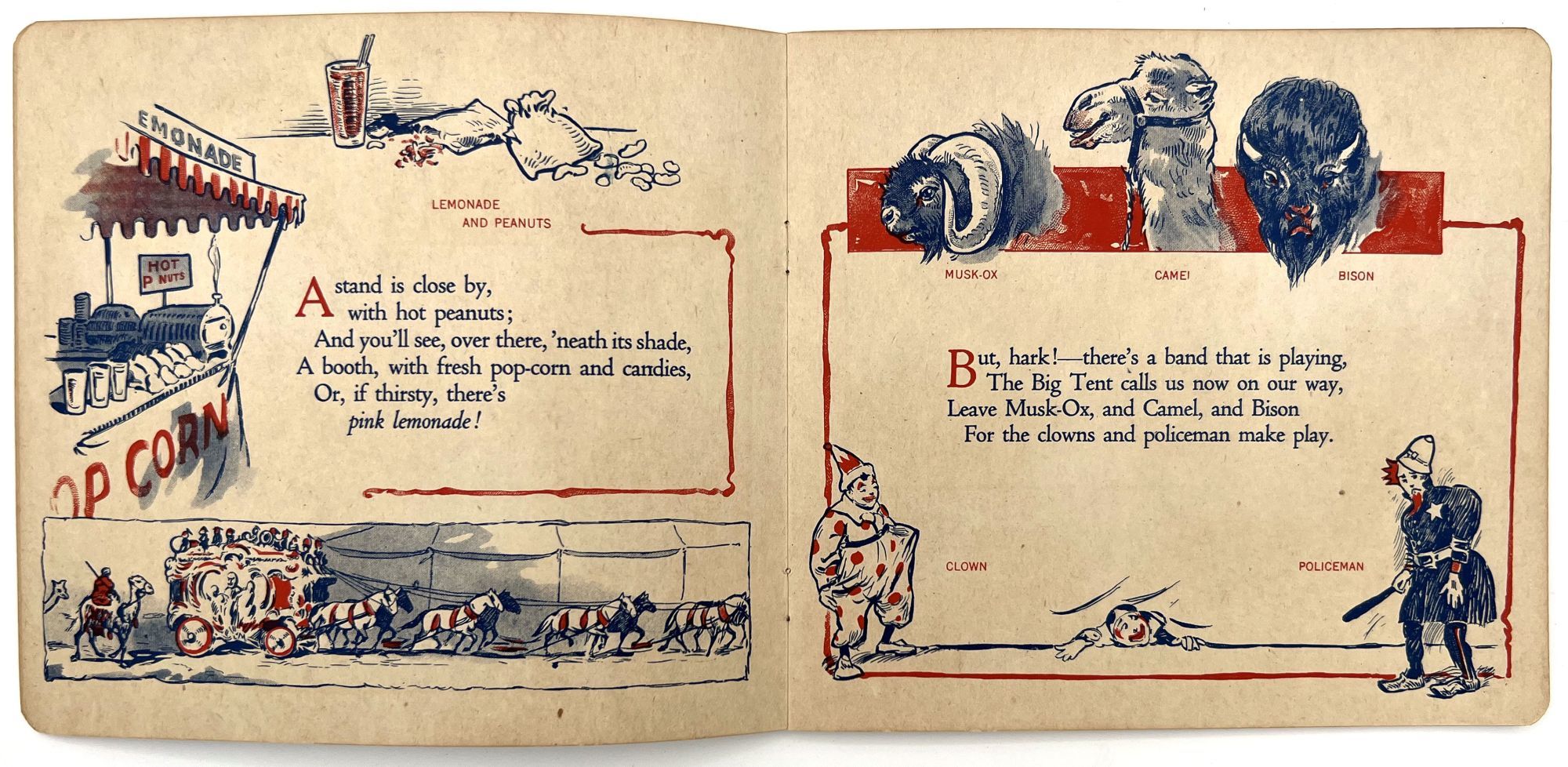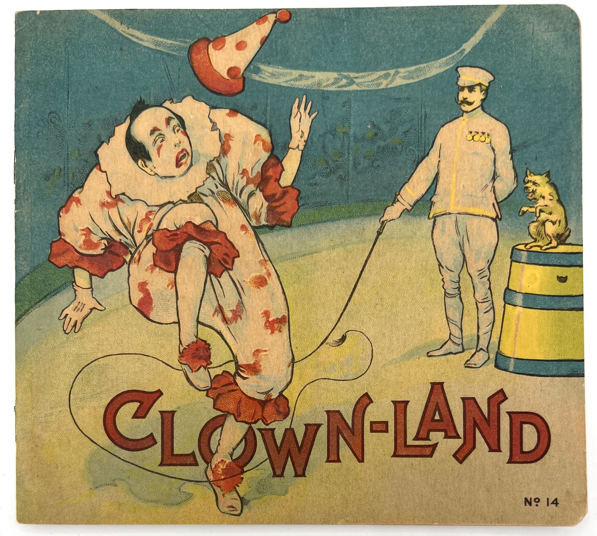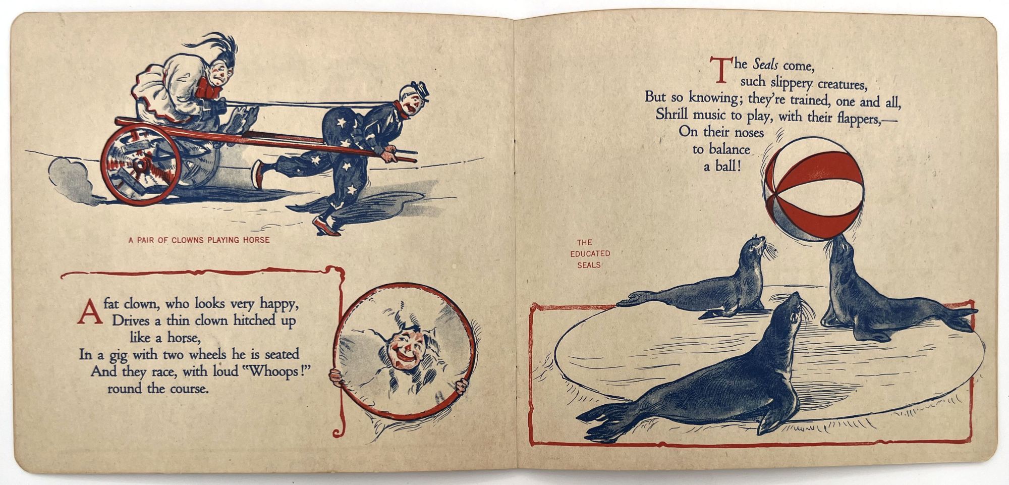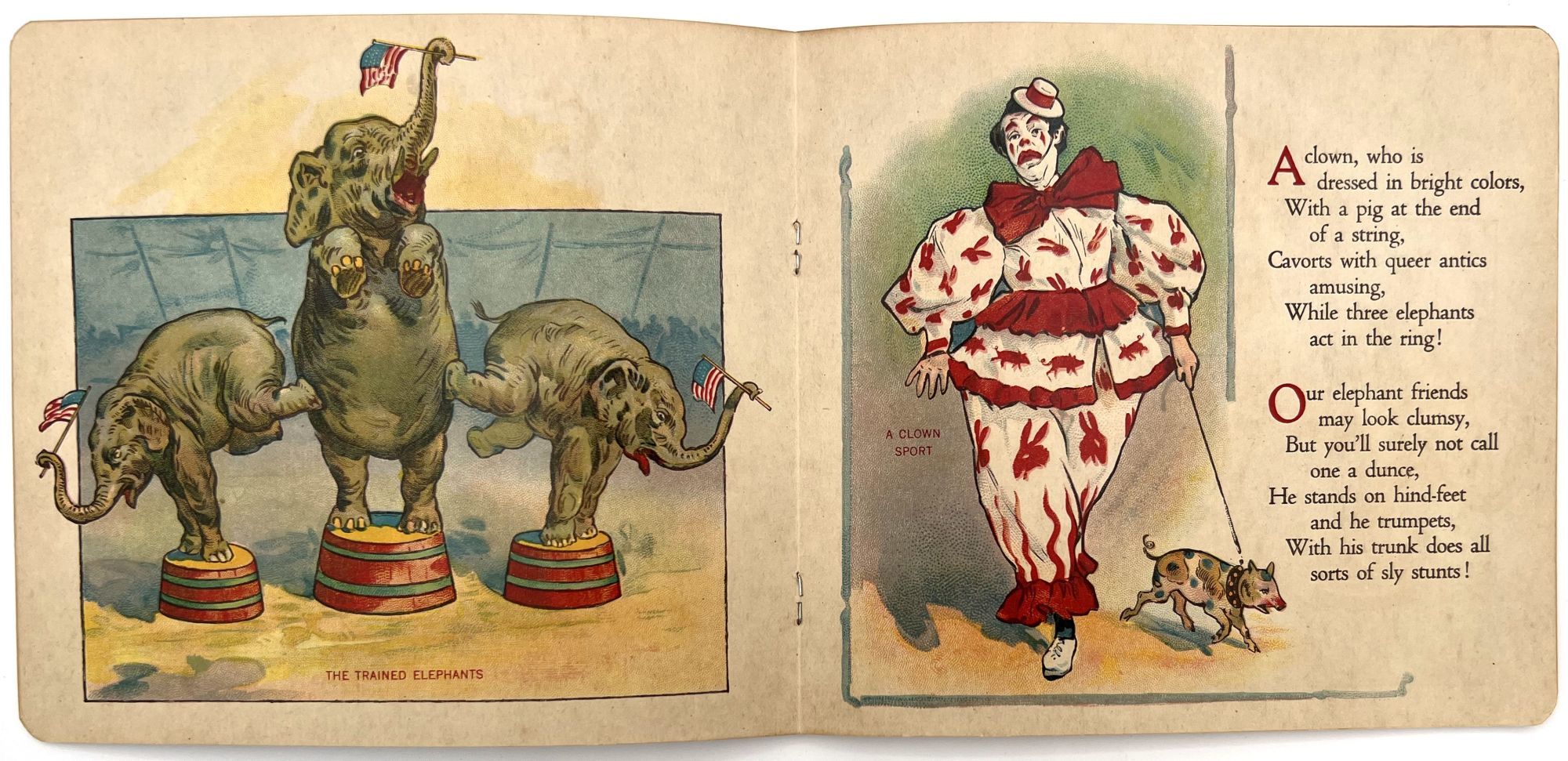 Rochester, New York: Stecher Lith. Co, 1916. Very good to near-fine. Light toning, minor shelf wear.. A whimsical flight through "Clown Land", with large chromolithographed illustrations of circus acts including a donkey and clowns, a polar bear on a slide, trained elephants and "educated seals", chariot races, and the "Queen of the Arena" balancing on the back of a grand white horse. No. 14 in an unidentified children's series.