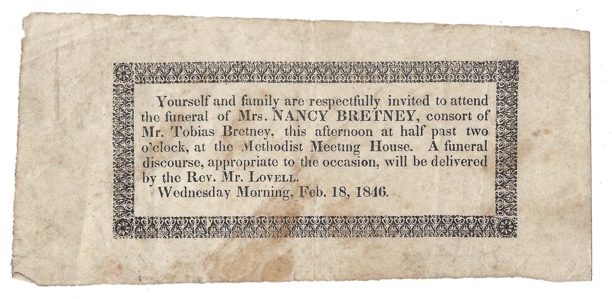 [Lebanon, Ohio], 1846. Very good. Minor toning, dust-soiling.. Printed invitation (2.75" by 6.5" wove paper slip, with typographical border) to the funeral of Mrs. Nancy Bretney, wife of Mr. Tobias Bretney, a Lebanon, Ohio tanner.