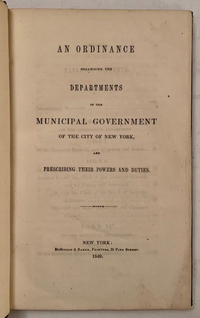 New York, 1849. Decorative Cloth. Very Good +. The uncommon 1849 1st edition of this significant contribution to the history of 19th century New York, specifically to the establishment and running of its municipal government. Clean, well-preserved and VG+ in its chocolate-brown cloth, with intricate blindstamping and bright gilt-titling and design along the panels. A touch of light spotting, one thin streak and a former owner name ("Martin E. Thompson Esq.") printed --presumably at a later date-- across the front panel. Internally, very sharp, with no writing or markings to speak of. Octavo, 210 pgs. Part I: "Of the Legislative Department"; Part II: "Of the Executive Departments"; and Part III: "Miscellaneous Provisions Respecting the Executive Departments of the Corporation, and Their Officers
