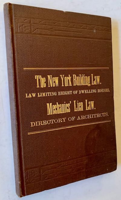 New York: The Record and Guide, 1886. Boards. Very Good +. A handsome, well-preserved example of the uncommon 1886 3rd printing. Hitchcock cites the 1885 1st edition (Hitchcock #476) but omits this one, which is the first to include a list of New York City architects (not in the first 2 editions) AND a set of "Laws Limiting the Height of Dwelling-Houses" (omitted in later editions). 6 of the illistrations in the text are highlighted in red, dozens of wonderful period ads (including engravings in some cases) at the front and rear. Tight and VG+ in its bevelled, dark-brown boards, with bright, completely unrubbed gilt-titling along the front panel. Very mild darkening to the lower panel edges, otherwise very sharp. Internally, very clean as well, with no writing or markings to speak of. Octavo, a nice piece of 19th centiury New York architectural and building history. Part I: Law Relating to Buildings in the City of New York; Part II: Law Limiting the Height of Dwelling Houses; and Part III: Mechanics' Lien Law for the City and State of New York 1885.