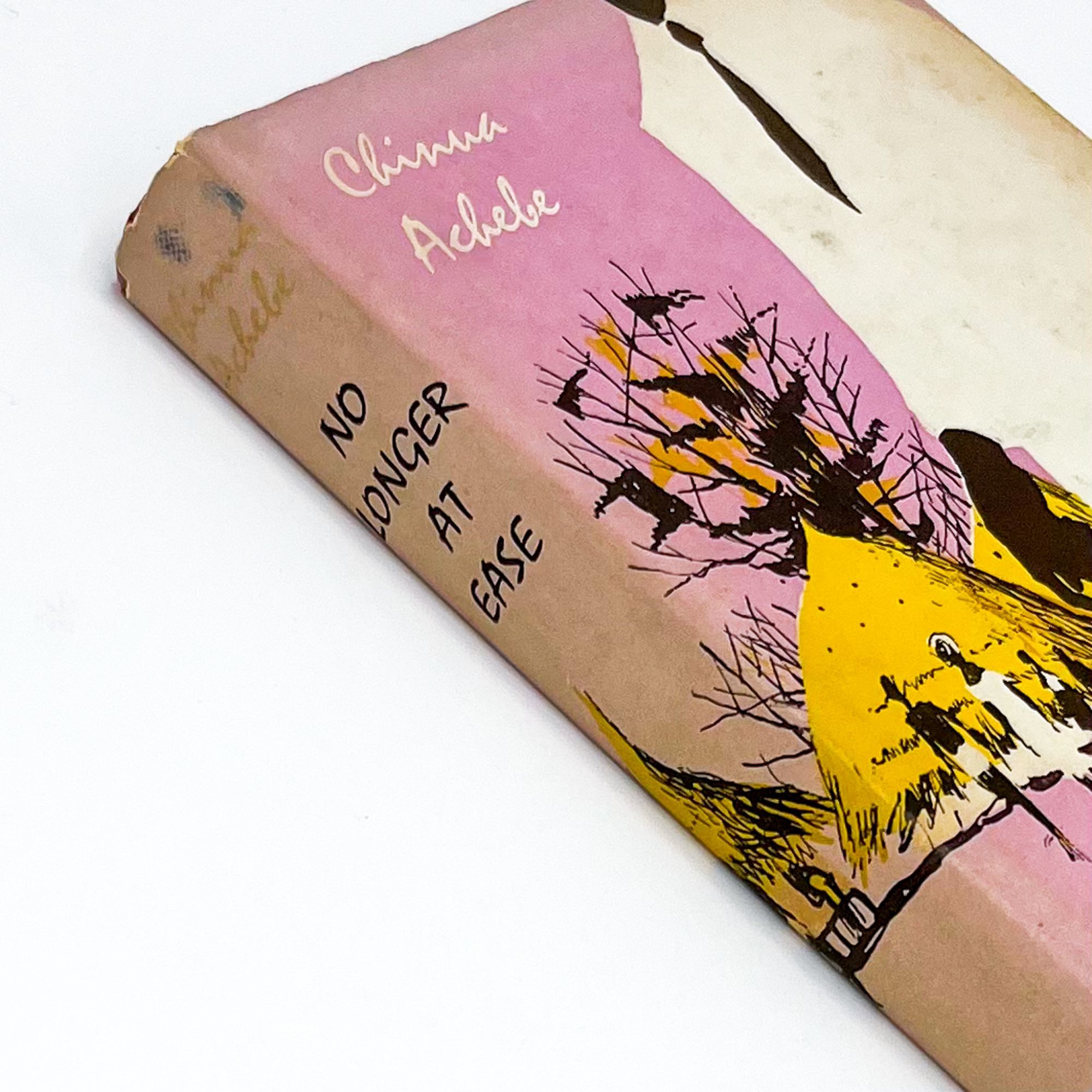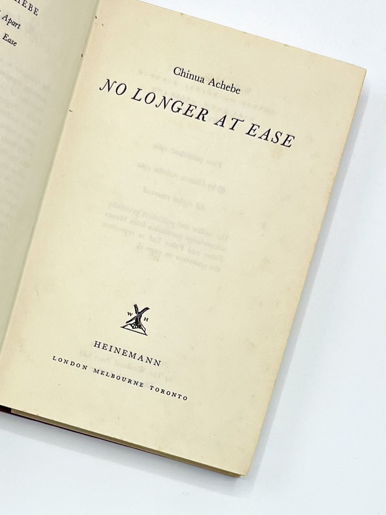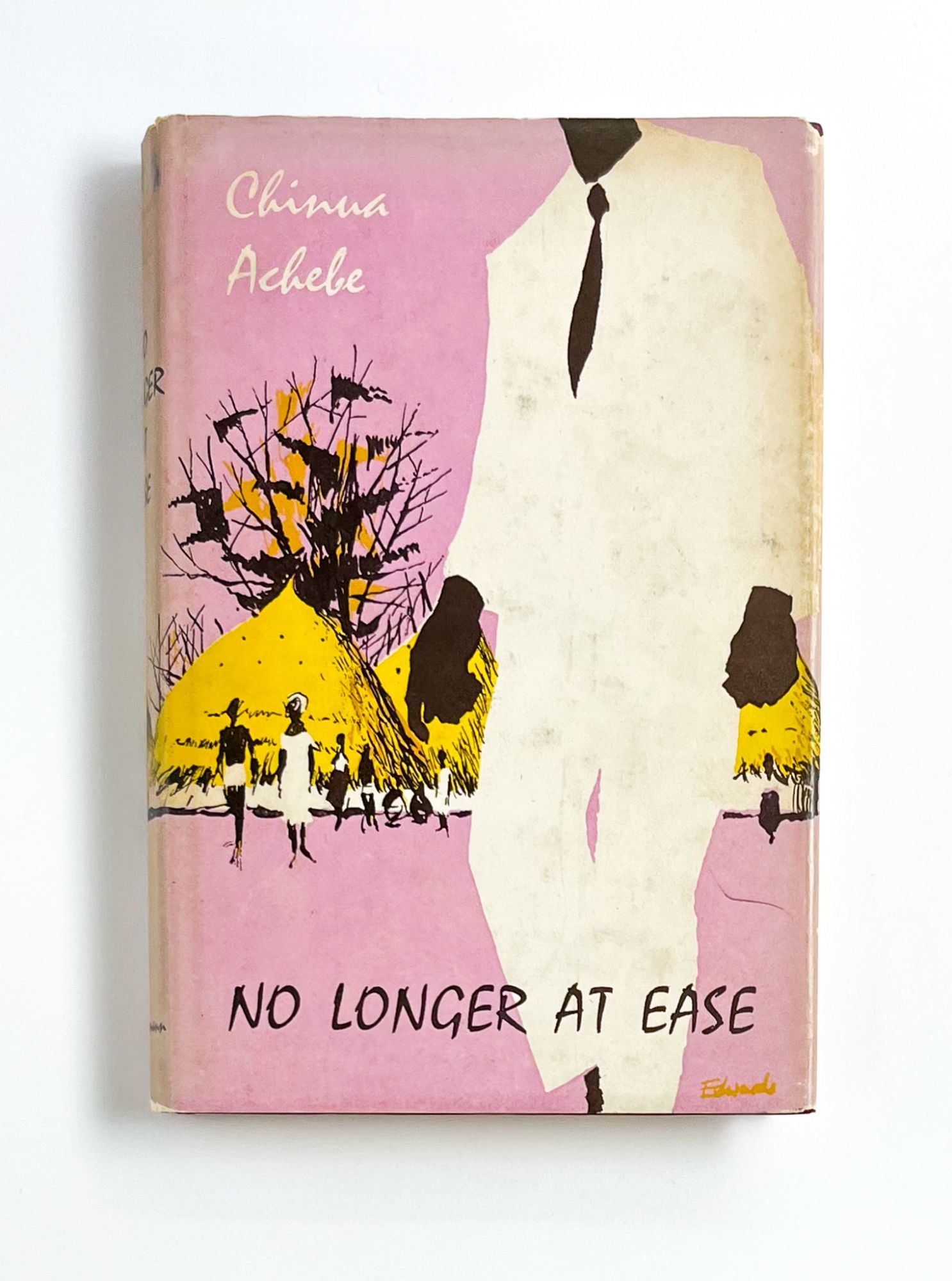 London: Heinemann, 1960. Very good plus in very good plus jacket.. Scarce first edition of Achebe's second novel, set in contemporary Nigeria and following the grandson of Okonkwo, hero of THINGS FALL APART. NO LONGER AT EASE derives its title from Eliot's "Journey of the Magi" ("But no longer at ease here, in the old dispensation"), as the preceding THINGS FALL APART alludes to Yeats; in it, Achebe arranges for his protagonist a quiet, understated catastrophe of colonial pressures and corruption. Following the novel's publication and positive reception, Achebe was awarded a Rockefeller Fellowship, the first of many major awards and honors to follow. 7.25'' x 5''. Original oxblood cloth. In original unclipped (13s 6d) pictorial dust jacket by Peter Edwards. 170 pages. Ink owner name to front free endpaper. Light foxing to endpapers and edges of text block, spine lean. Minor soil and chipping to jacket at extremities, with touch of fading to spine.