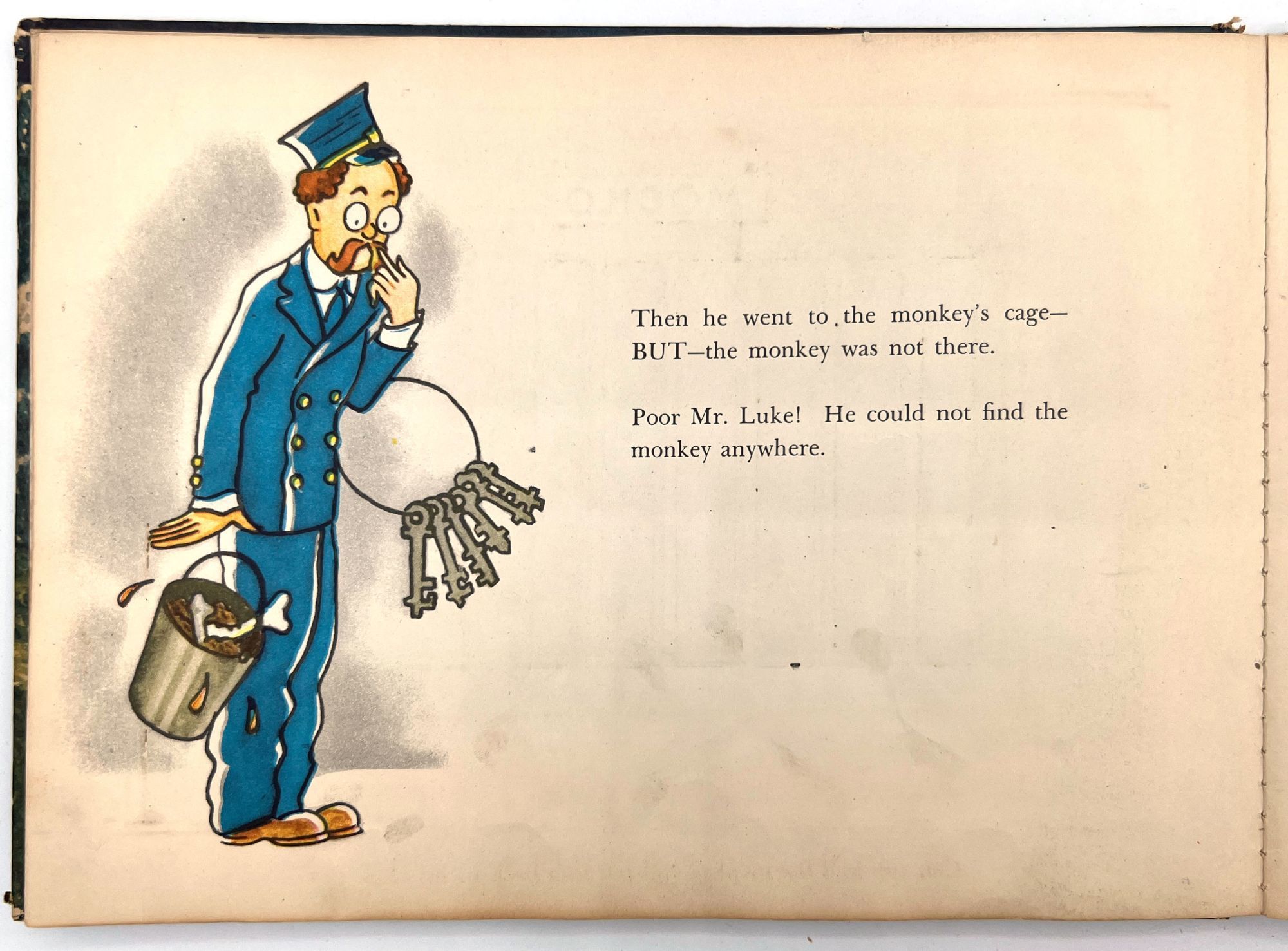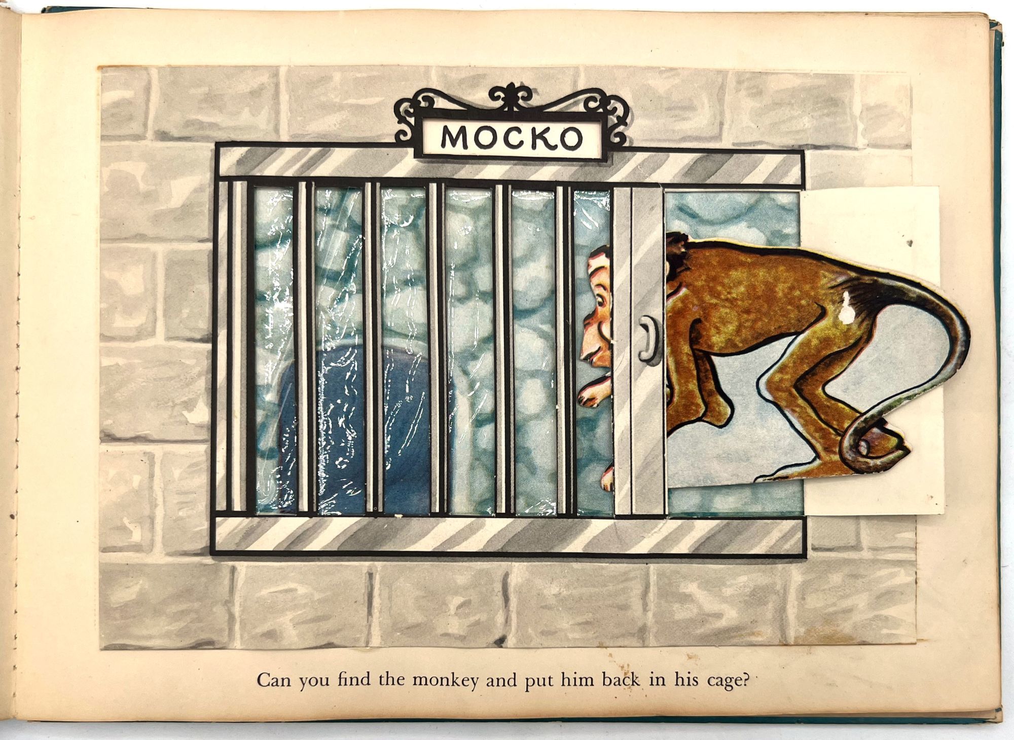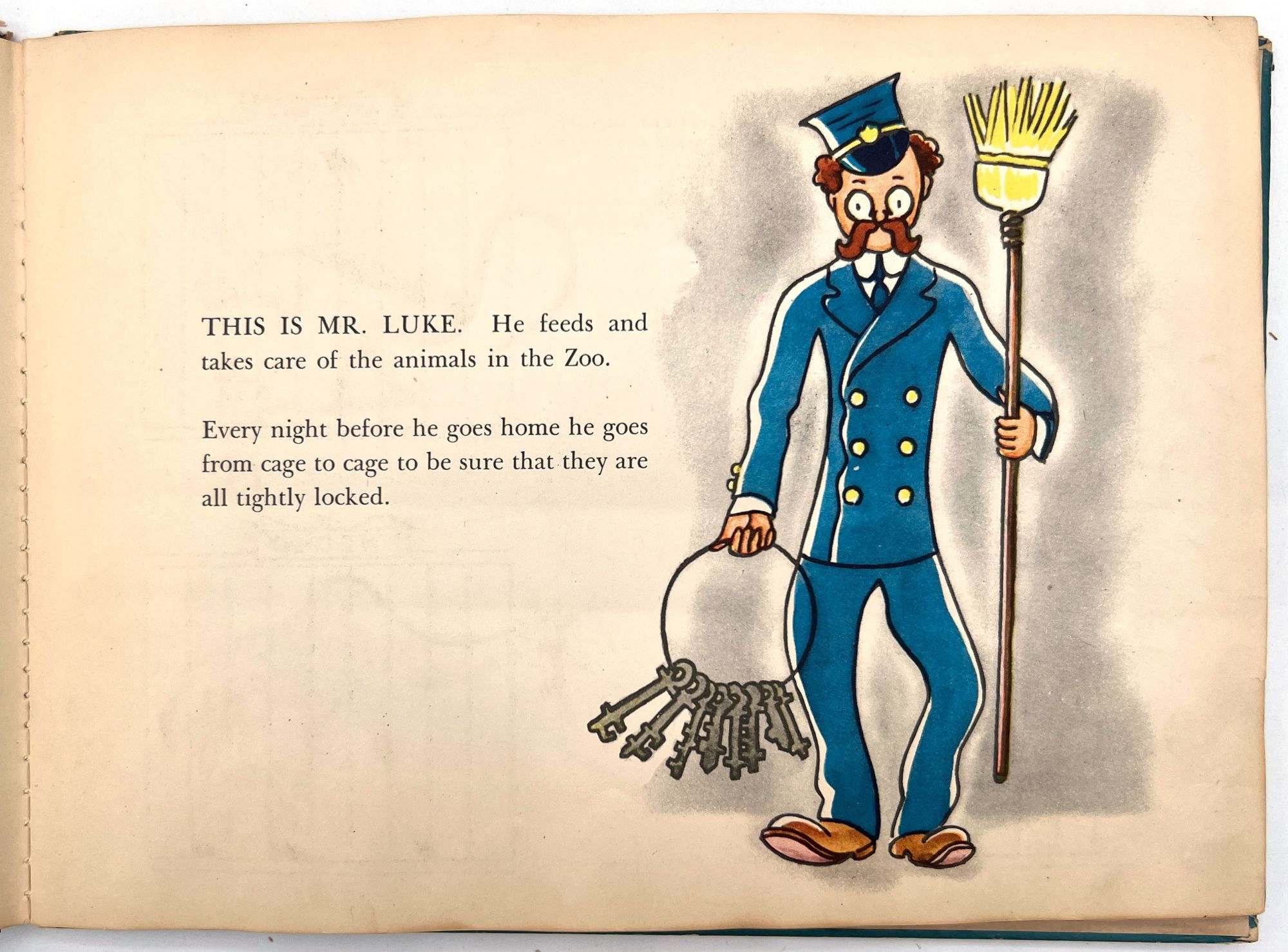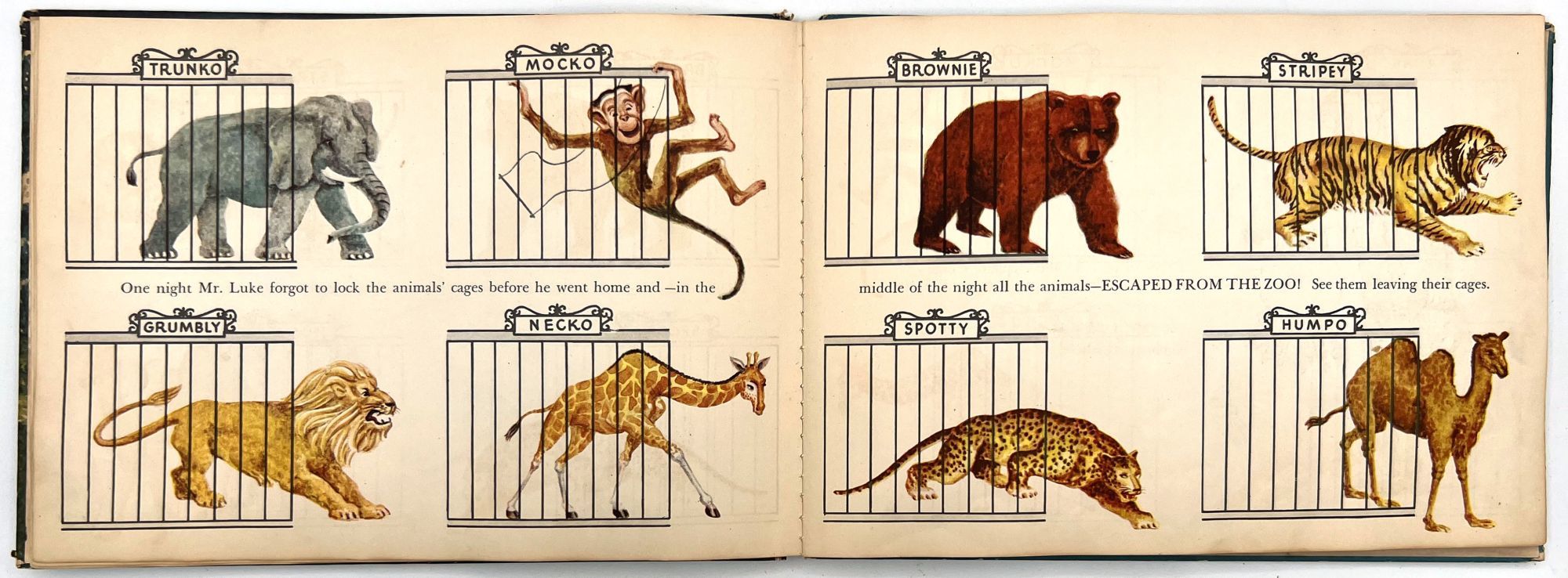 New York, New York: Harcourt, Brace and Company, 1941. Good. Spine chipped with extremities worn/damaged. Some of the "cages" are loose.. A very charming interactive children's book starring Mr. Luke, a harried zookeeper who needs help putting the animals back in their cages at the end of the night. Each of the eight die-cut animals, ranging from "Trunko" the elephant to "Humpo" the camel, are originally housed in an envelope in the back of the book; the child must take each one and put it in the proper "cage" throughout the book. Each cage has a moveable paper door and a plastic window through which the animal can be seen.