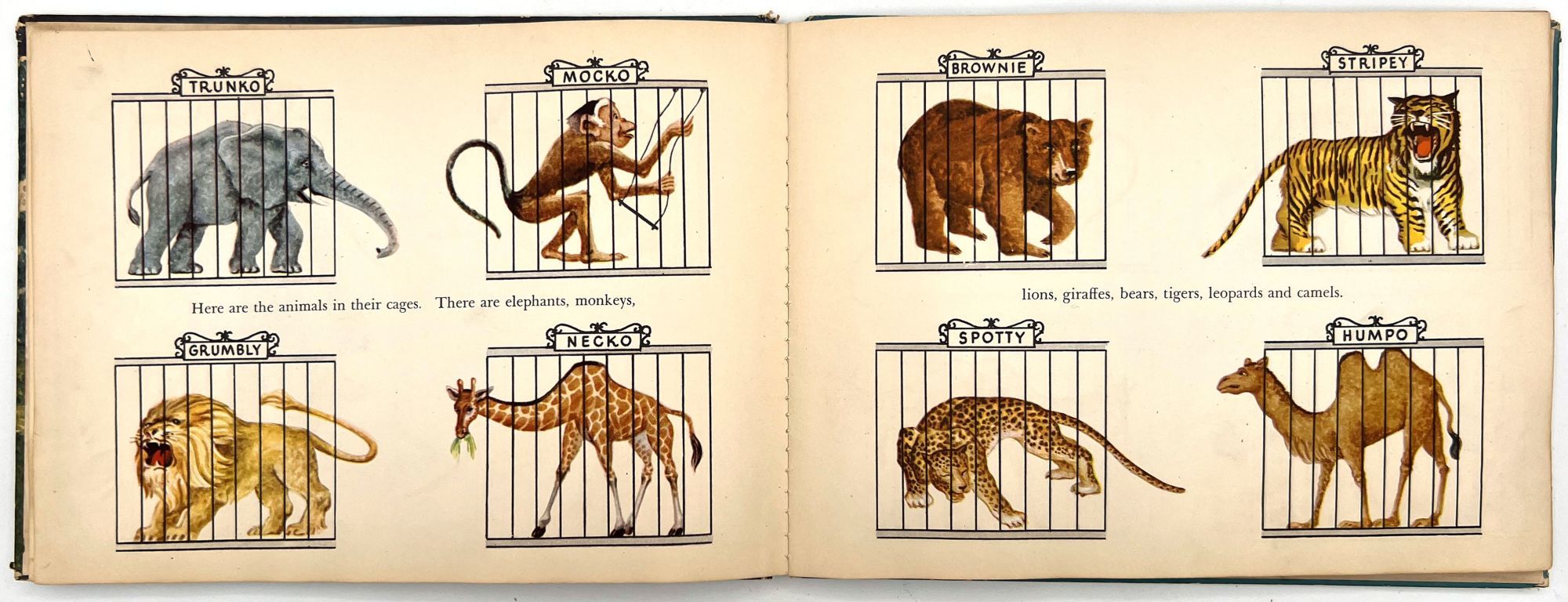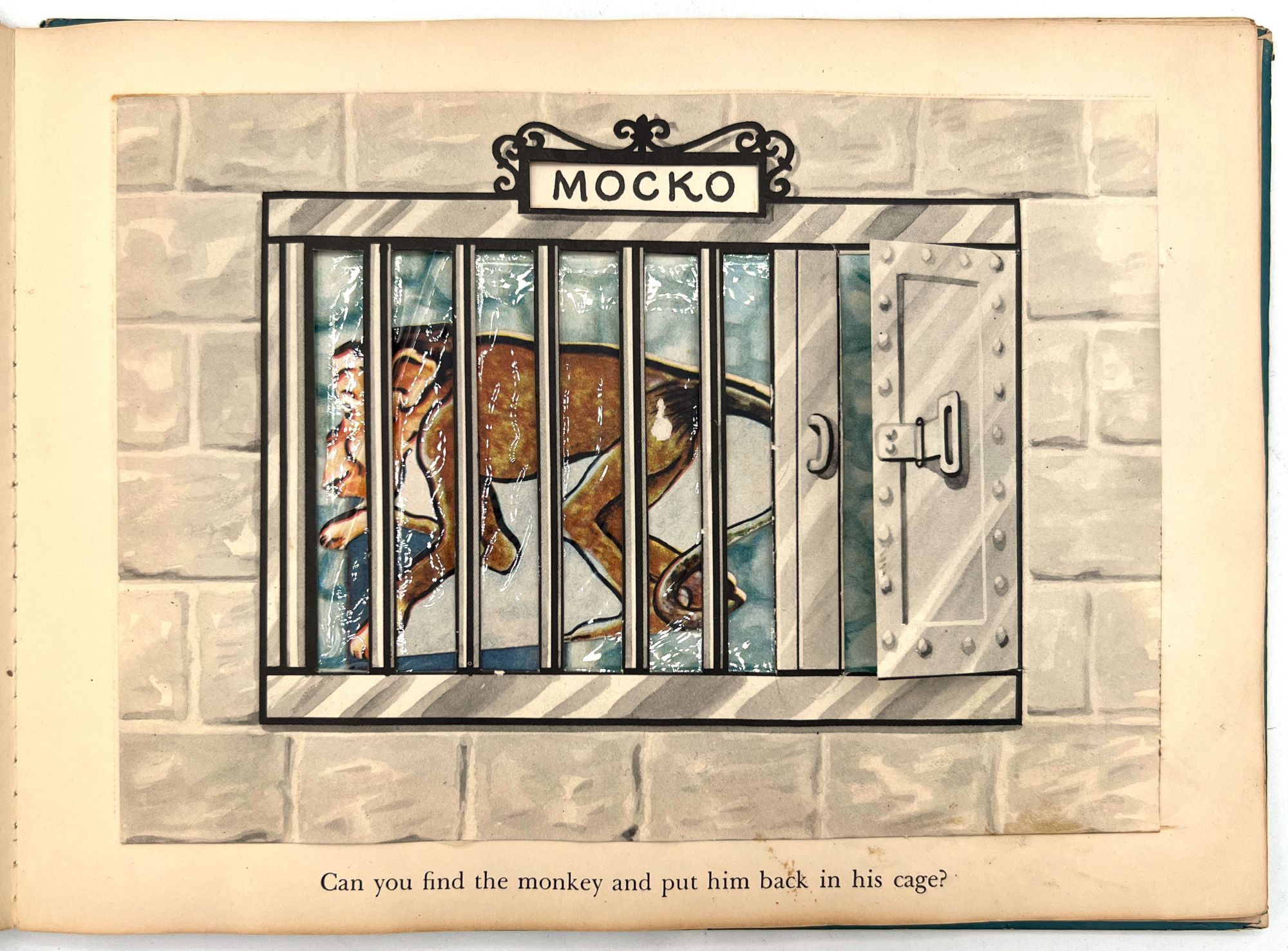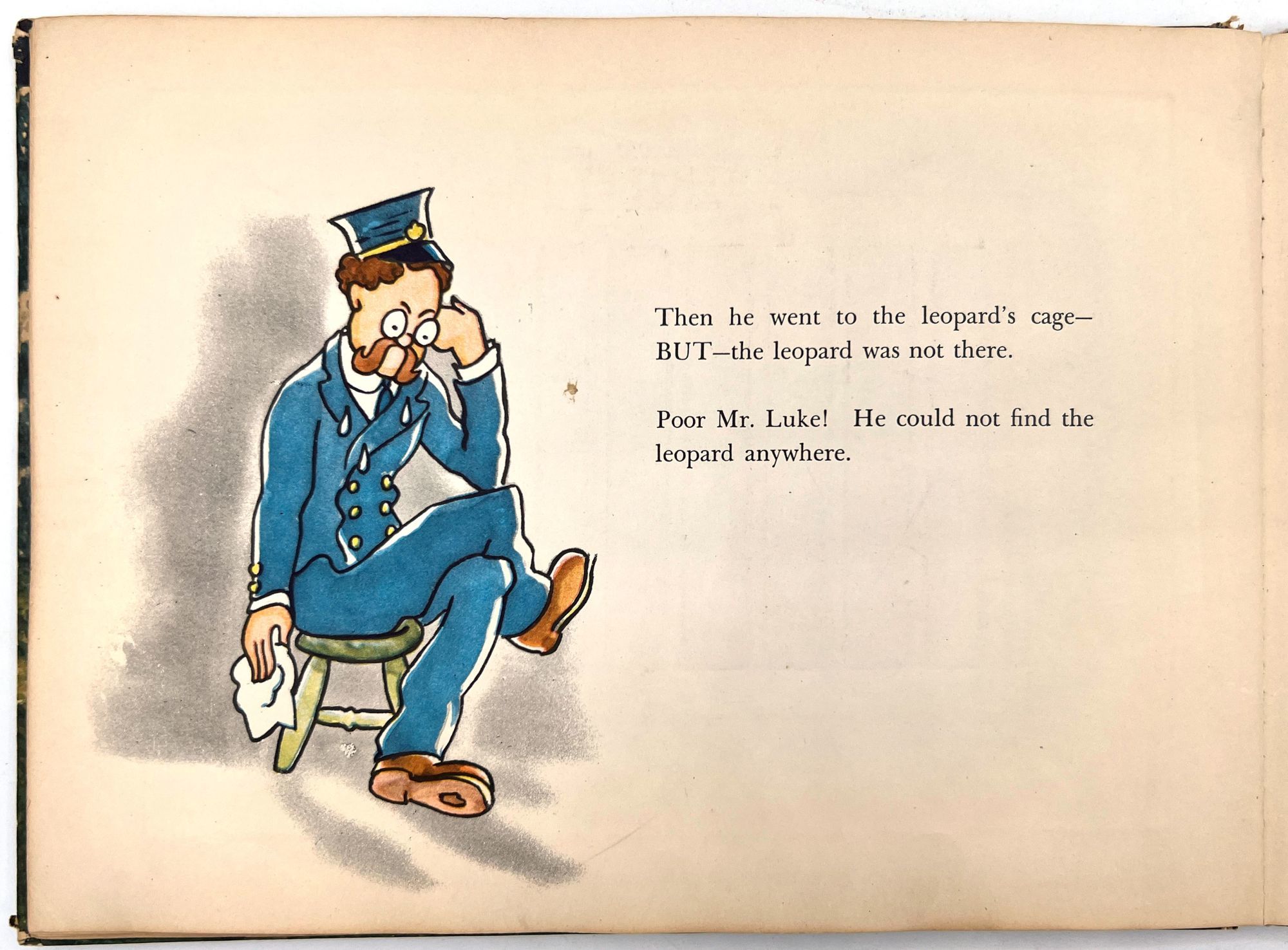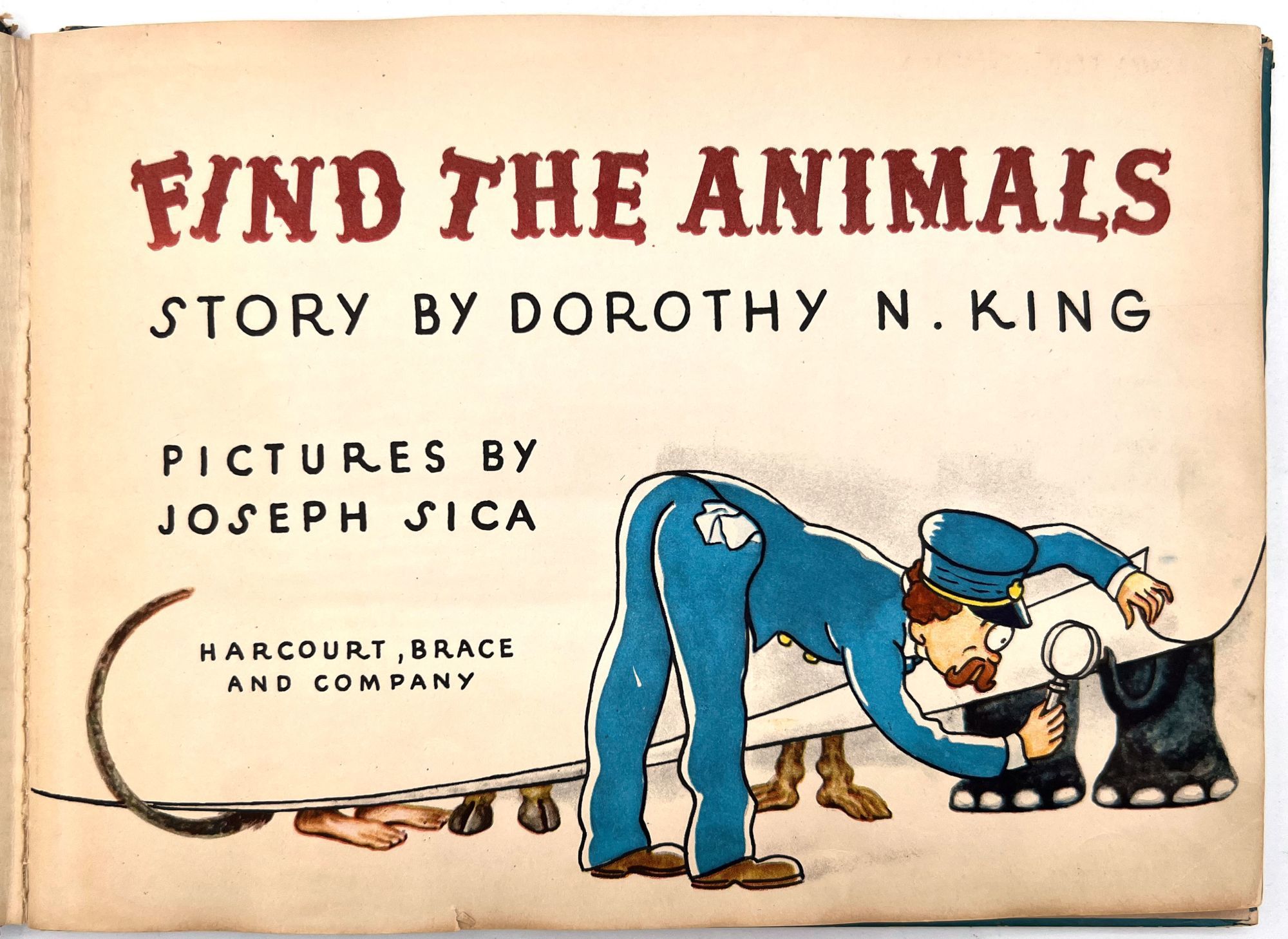 New York, New York: Harcourt, Brace and Company, 1941. Good. Spine chipped with extremities worn/damaged. Some of the "cages" are loose.. A very charming interactive children's book starring Mr. Luke, a harried zookeeper who needs help putting the animals back in their cages at the end of the night. Each of the eight die-cut animals, ranging from "Trunko" the elephant to "Humpo" the camel, are originally housed in an envelope in the back of the book; the child must take each one and put it in the proper "cage" throughout the book. Each cage has a moveable paper door and a plastic window through which the animal can be seen.
