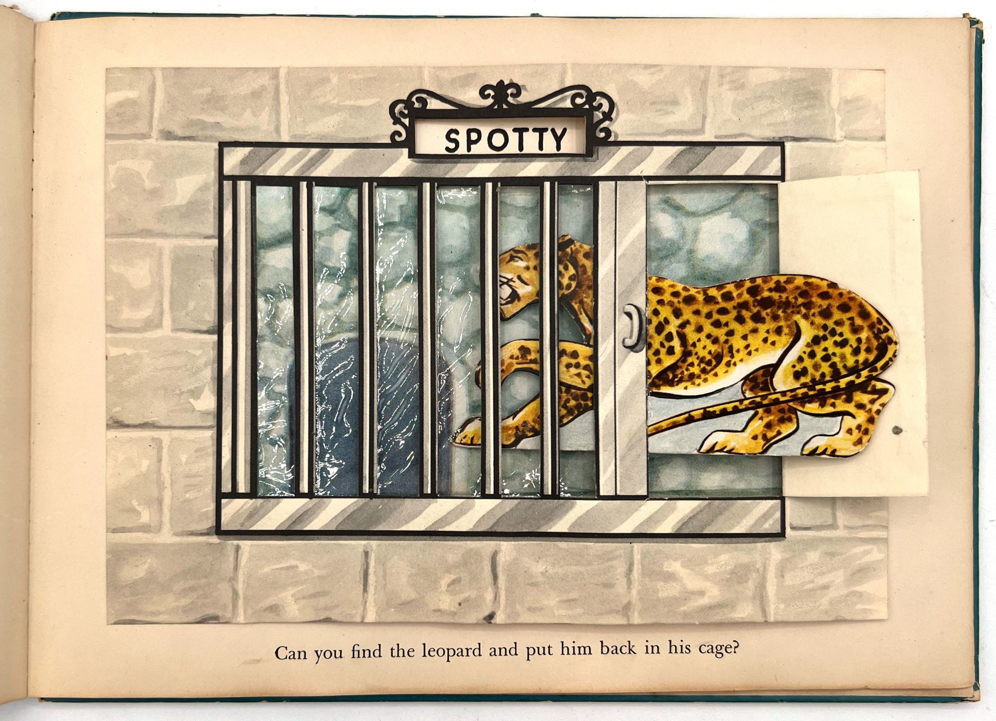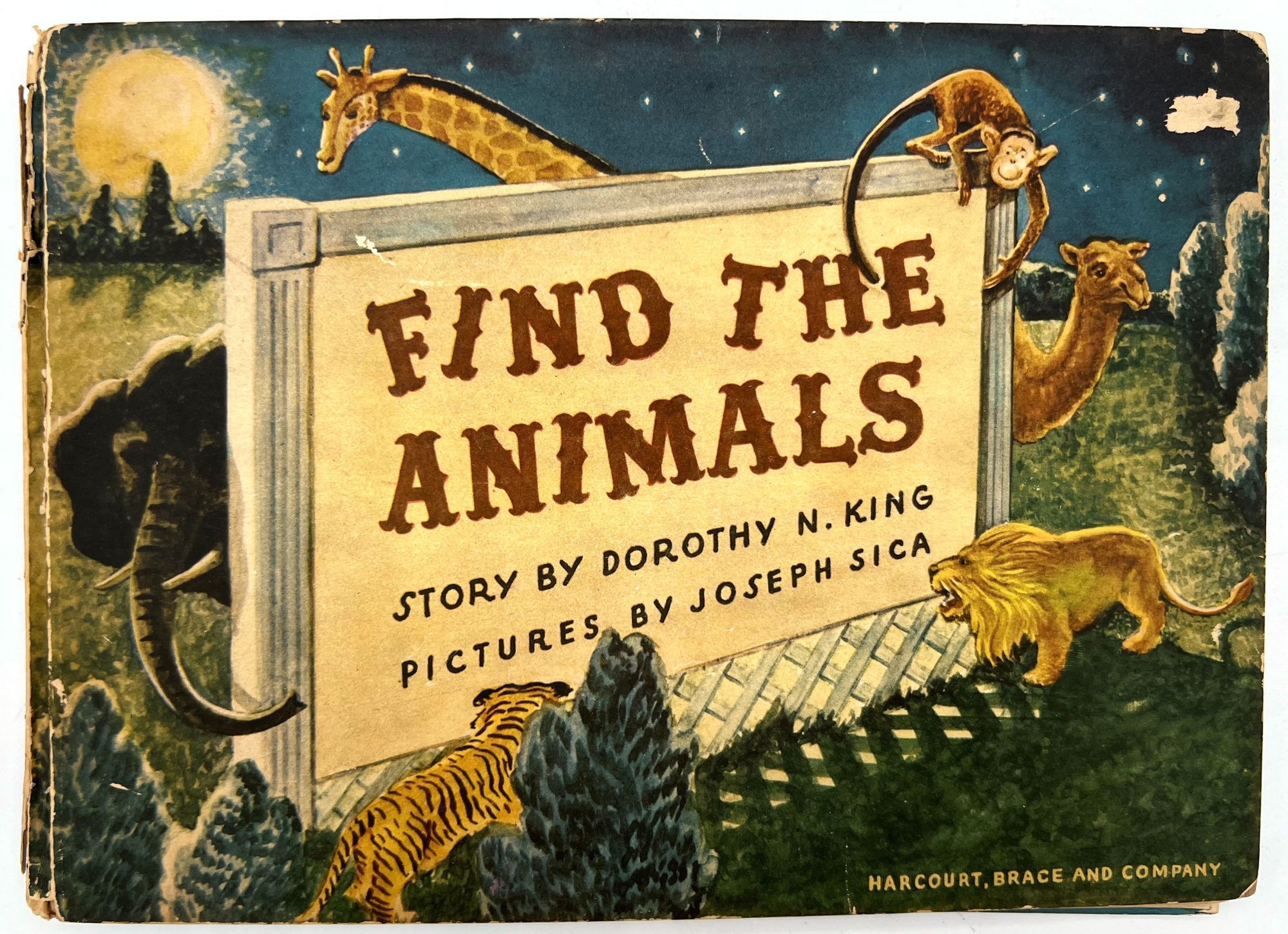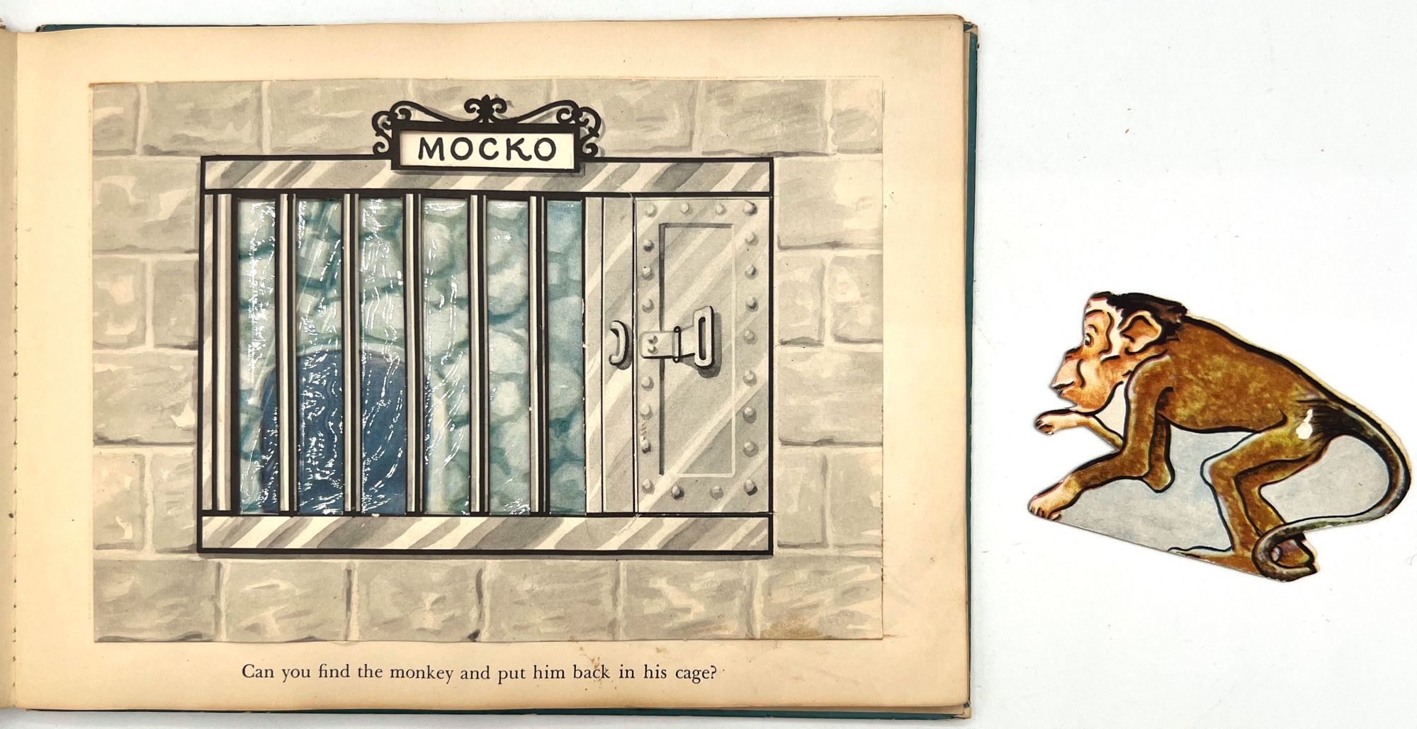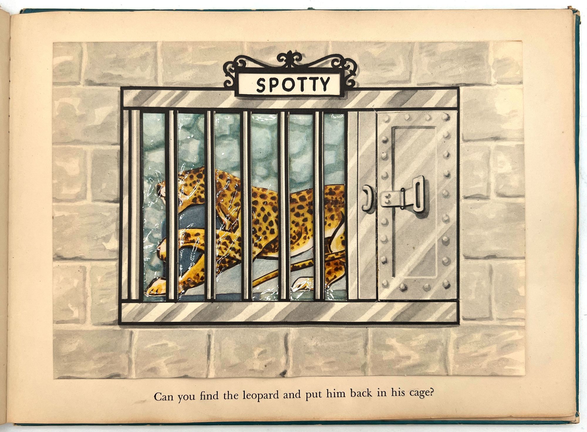 New York, New York: Harcourt, Brace and Company, 1941. Good. Spine chipped with extremities worn/damaged. Some of the "cages" are loose.. A very charming interactive children's book starring Mr. Luke, a harried zookeeper who needs help putting the animals back in their cages at the end of the night. Each of the eight die-cut animals, ranging from "Trunko" the elephant to "Humpo" the camel, are originally housed in an envelope in the back of the book; the child must take each one and put it in the proper "cage" throughout the book. Each cage has a moveable paper door and a plastic window through which the animal can be seen.