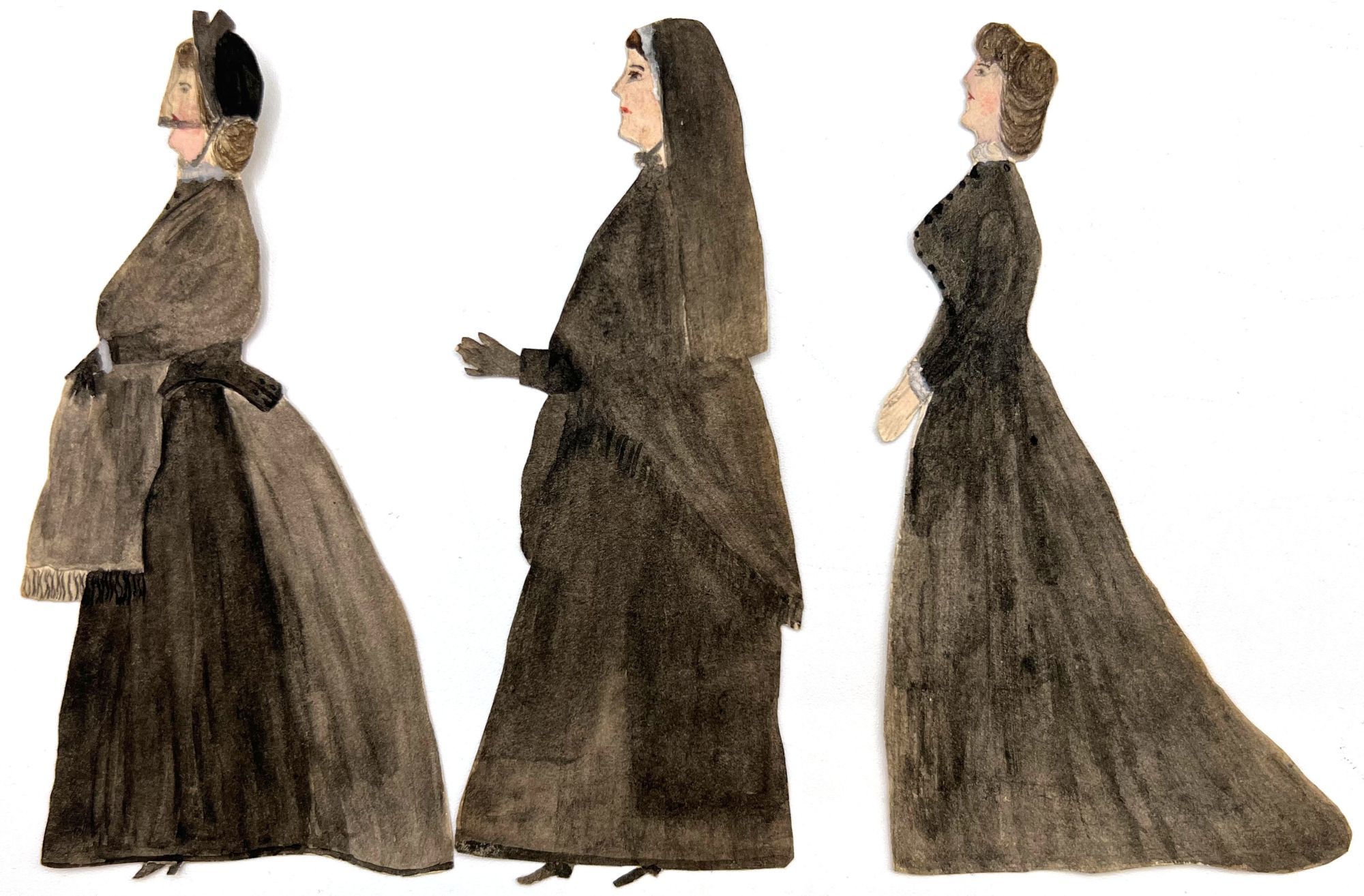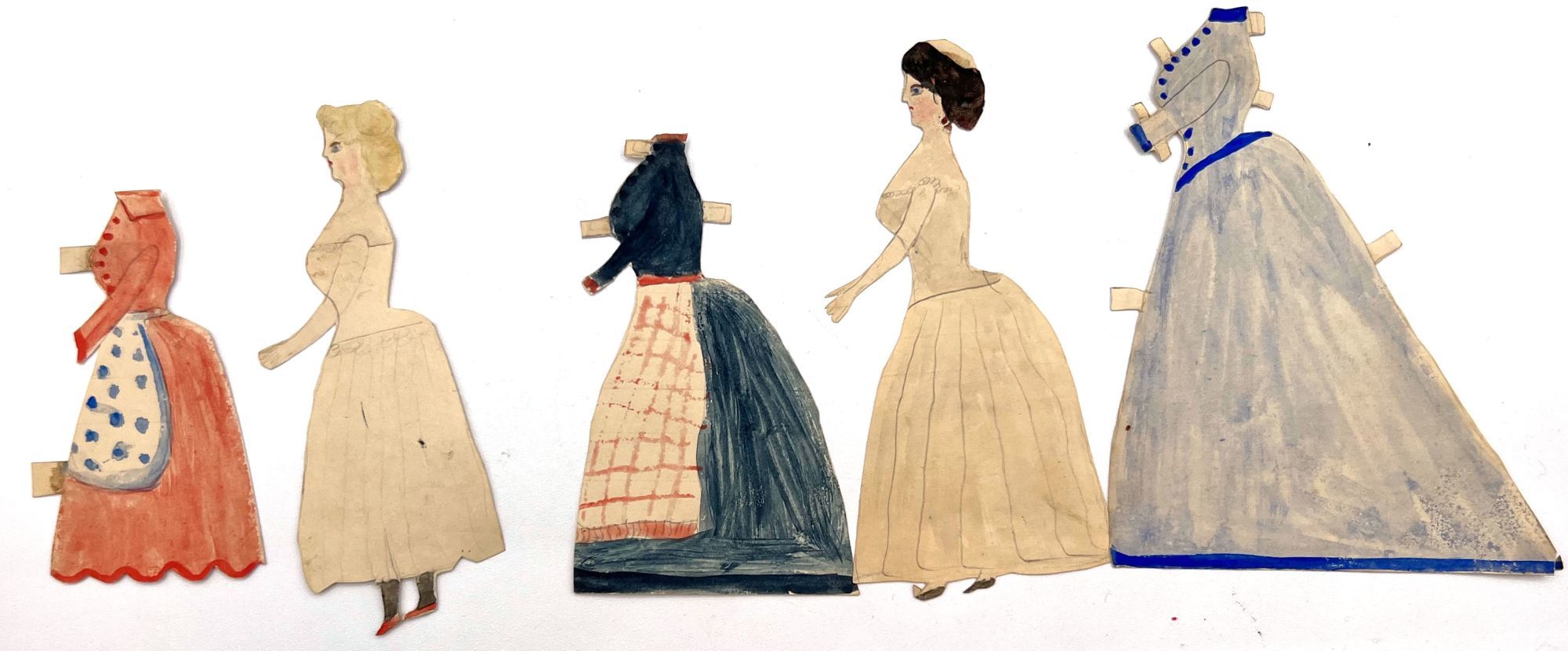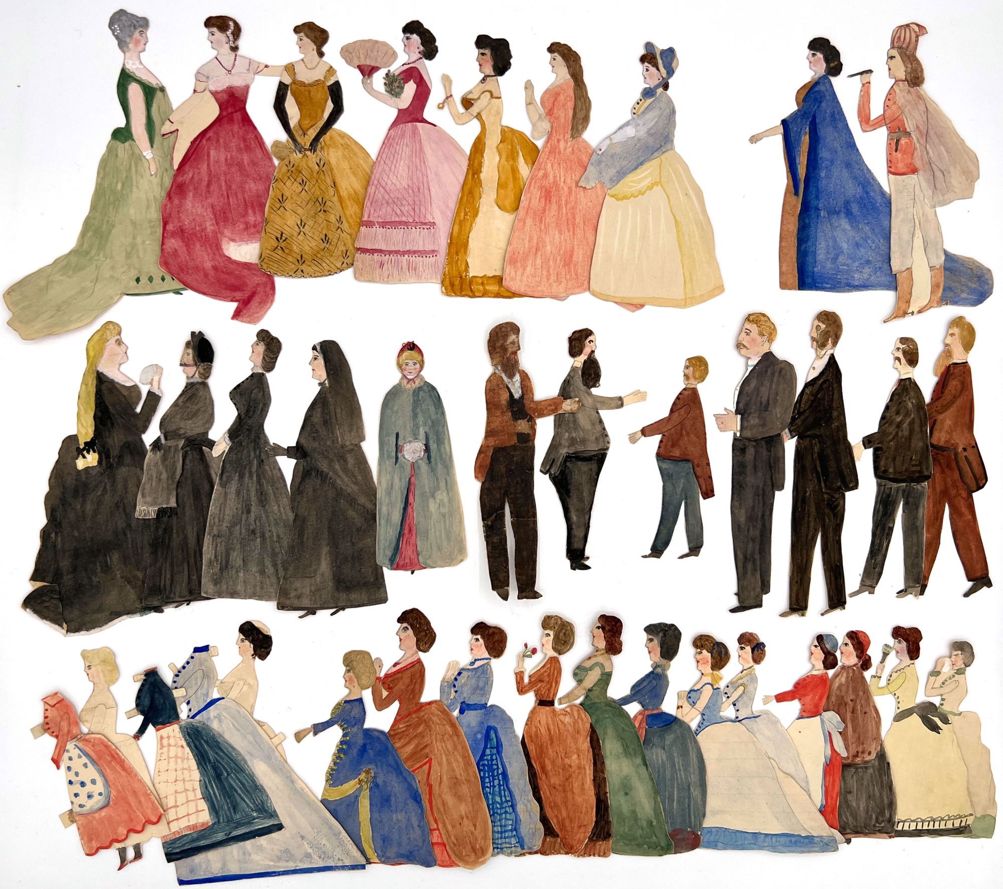 United States, 1870. Very good. Minor toning and dust soiling, one or two stains.. A handmade set of thirty-five (35) Victorian paper dolls including eight (8) men and twenty-seven (27) women. Each is already dressed in a variety of styles: mourning wear, day and evening wear, and night wear. There is even a male paper doll brandishing a knife in what appears to be flamboyant dress for the stage. Dolls measure from approx. 4" to 6". Original pencil and watercolor on paper. A couple have names noted in pencil on their backs. Two paper dolls are accompanied by three (3) additional outfits.