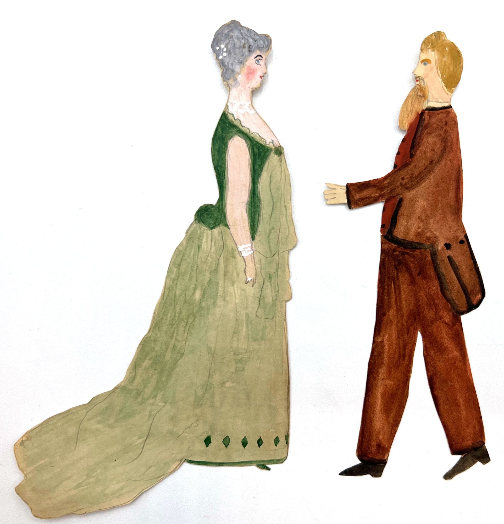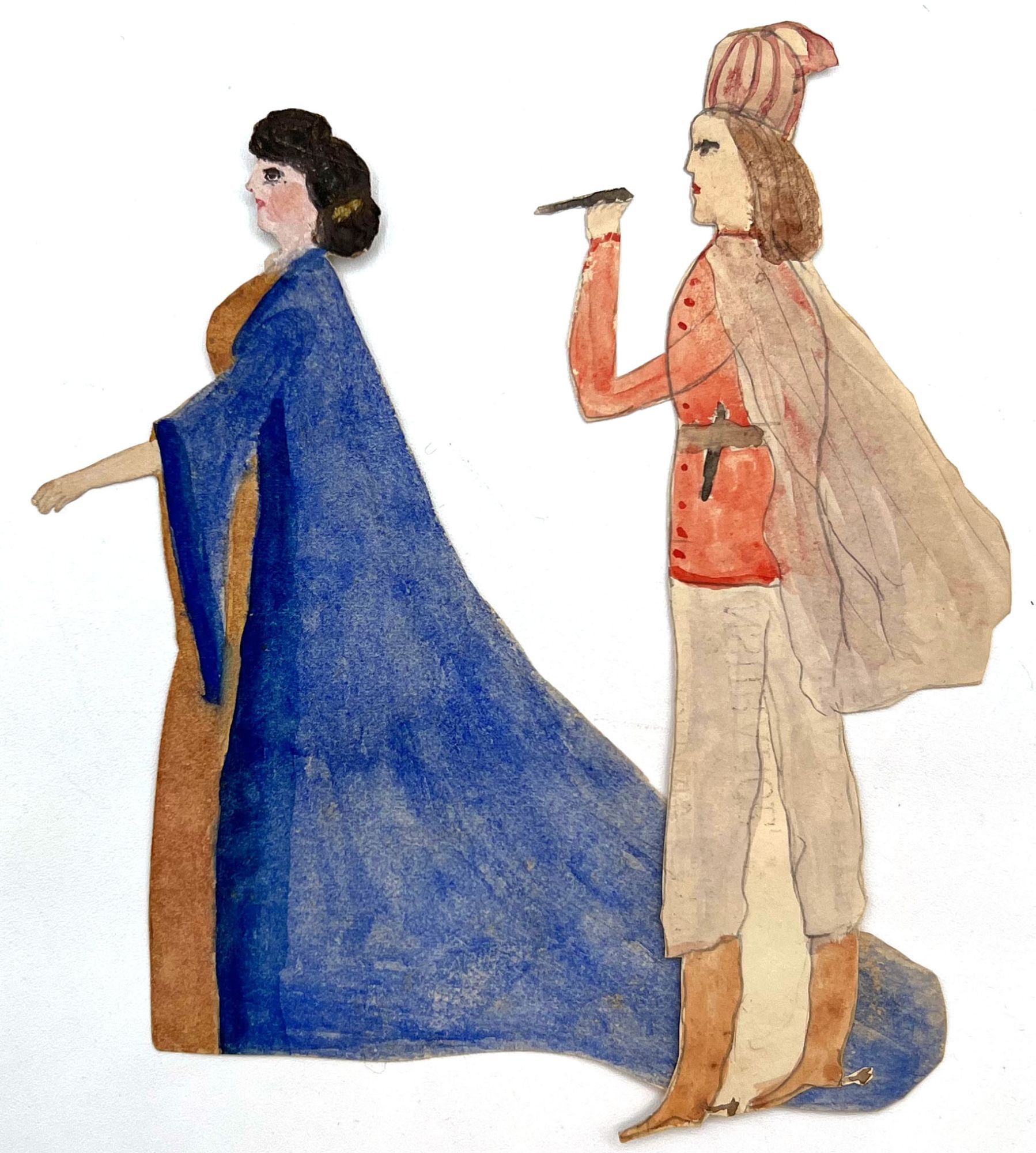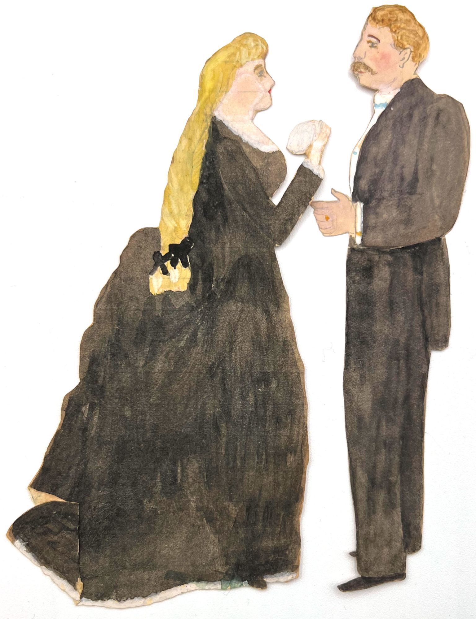 United States, 1870. Very good. Minor toning and dust soiling, one or two stains.. A handmade set of thirty-five (35) Victorian paper dolls including eight (8) men and twenty-seven (27) women. Each is already dressed in a variety of styles: mourning wear, day and evening wear, and night wear. There is even a male paper doll brandishing a knife in what appears to be flamboyant dress for the stage. Dolls measure from approx. 4" to 6". Original pencil and watercolor on paper. A couple have names noted in pencil on their backs. Two paper dolls are accompanied by three (3) additional outfits.