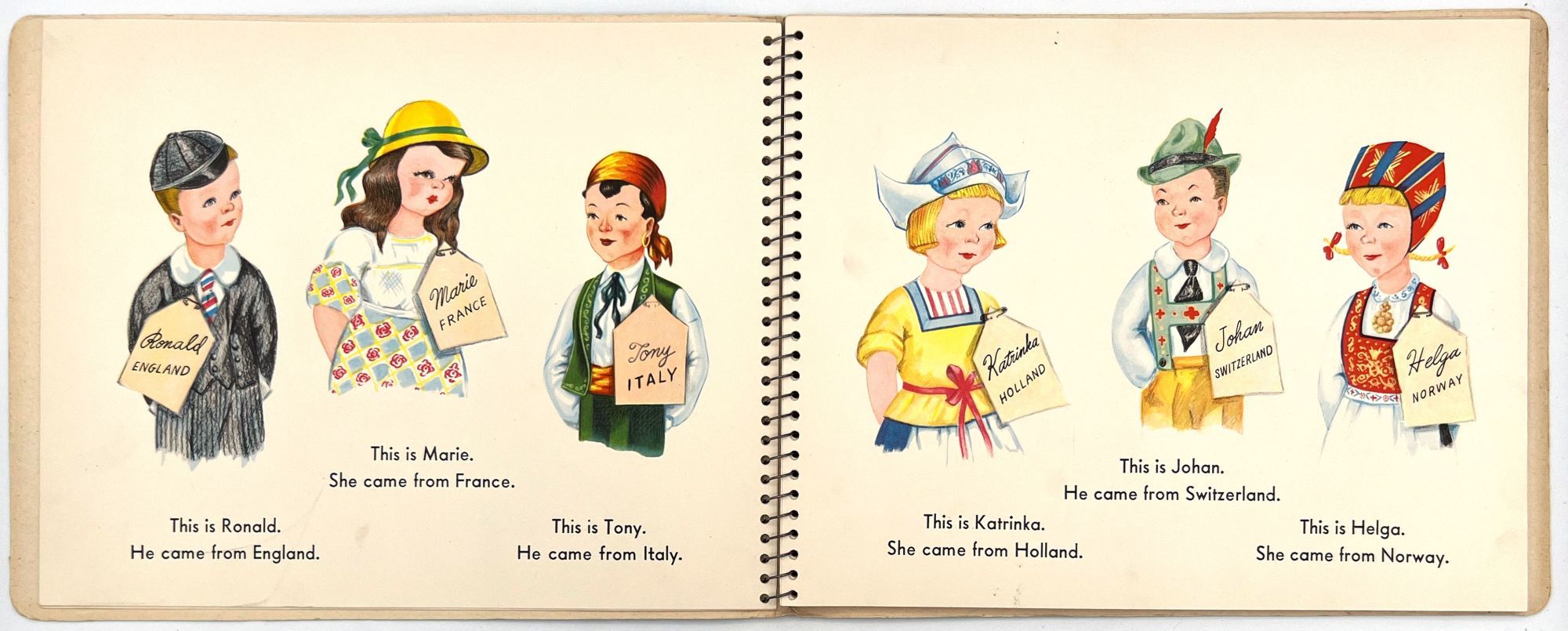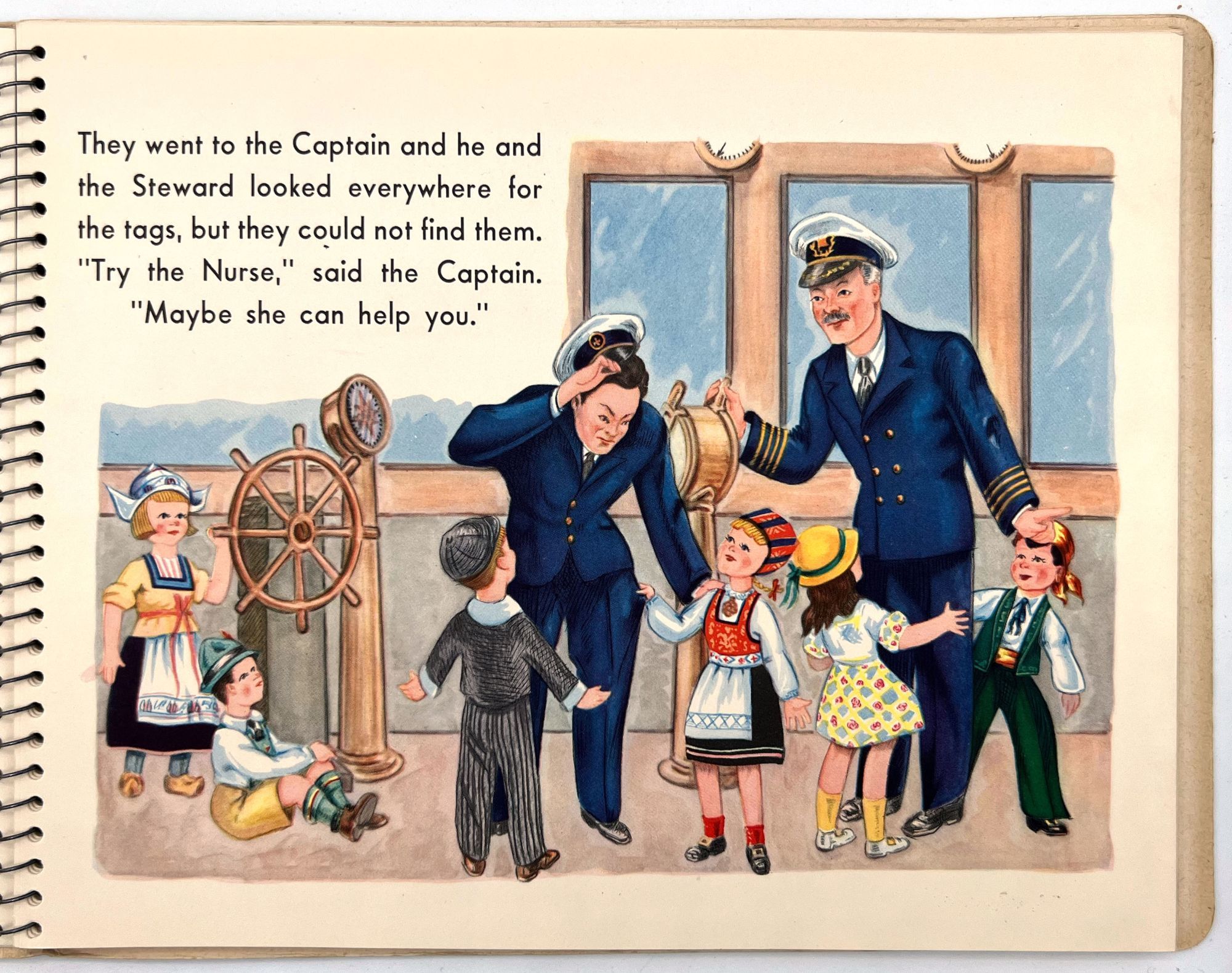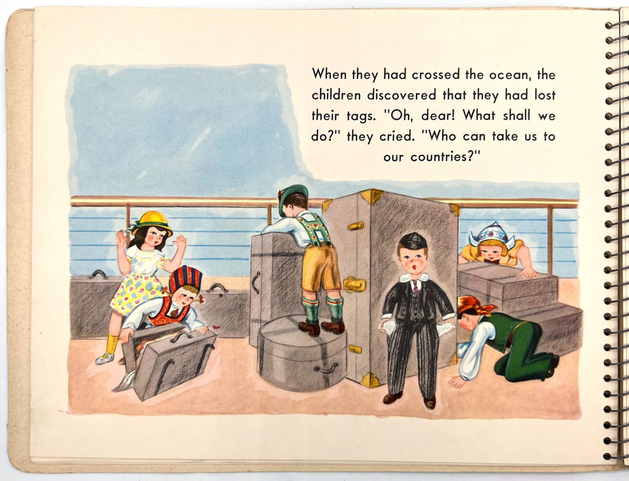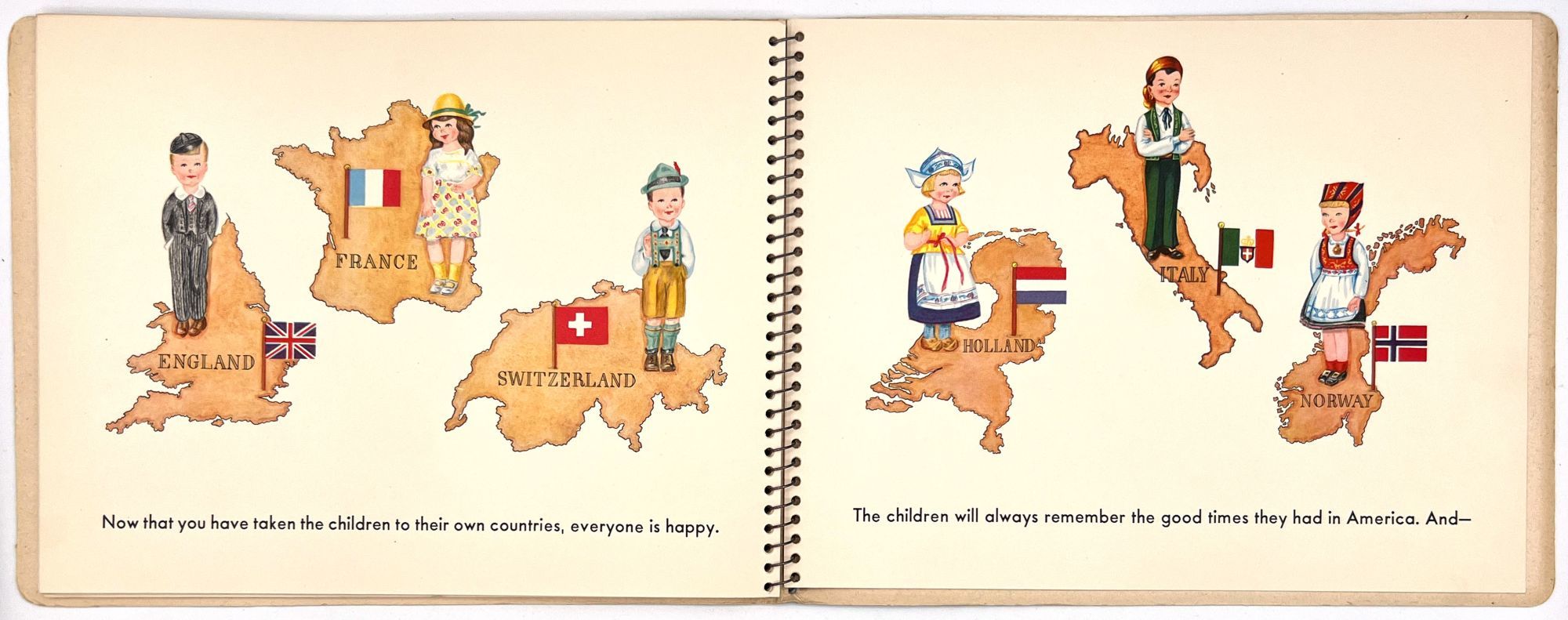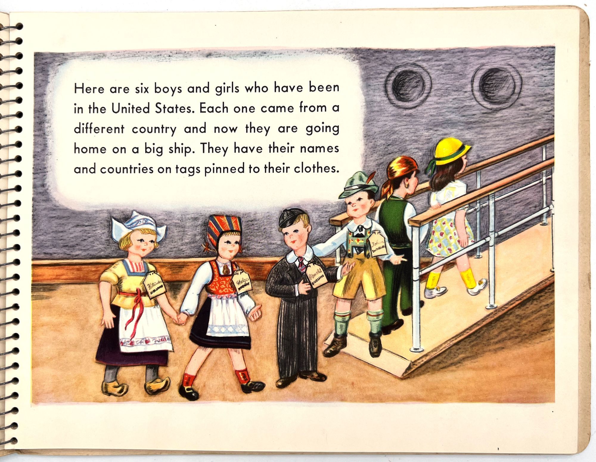 United States: Dorothy K. Weeblow, 1951. Very good. Minor wear to extremities and minor dust soiling. All six (6) dolls present and in very good to near-fine condition.. A charming interactive children's book emphasizing international friendship and cultural heritage. The story revolves around six children from European countries (England, France, Italy, Holland, Switzerland, and Norway) who are traveling across the Atlantic on an ocean liner. The young reader is asked to help the Captain and his crew return the children to each of their countries; to do this, the reader must take each of the six (6) die-cut paper dolls from an envelope on the fifth leaf, and put them in the slots of their prospective countries on the following leaves. Each child is dressed in traditional clothing, and are slotted onto a map that shows special features of their respective country (e.g. cheese for Switzerland). The book ends, "Now that you have taken the children to their own countries, everyone is happy. The children will always remember the good times they had in America." Oblong 8vo (7.5" by 9.75"), 12 unnumbered leaves with six (6) die-cut dolls, bound in original spiral-bound illustrated covers.