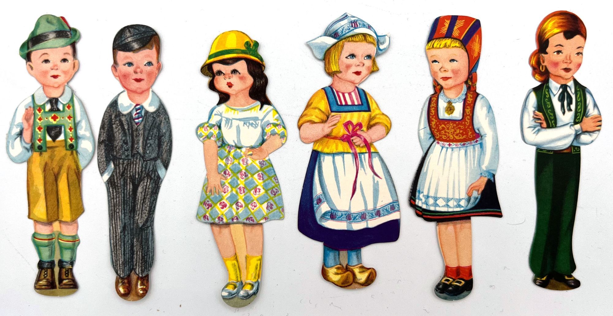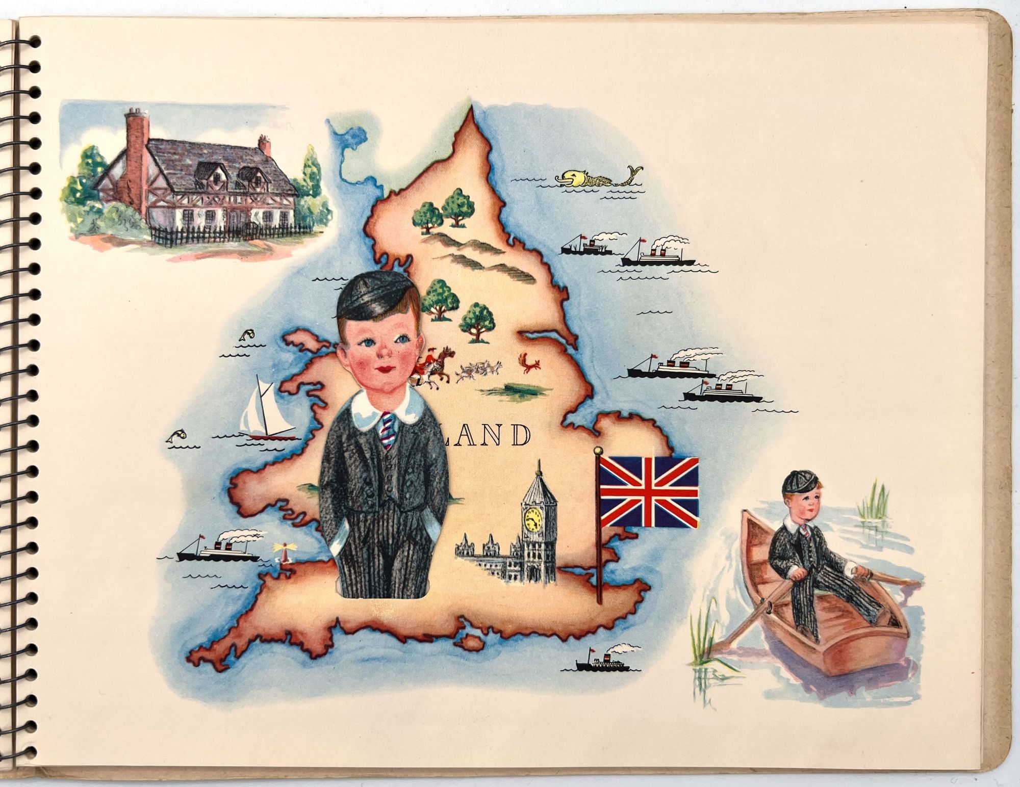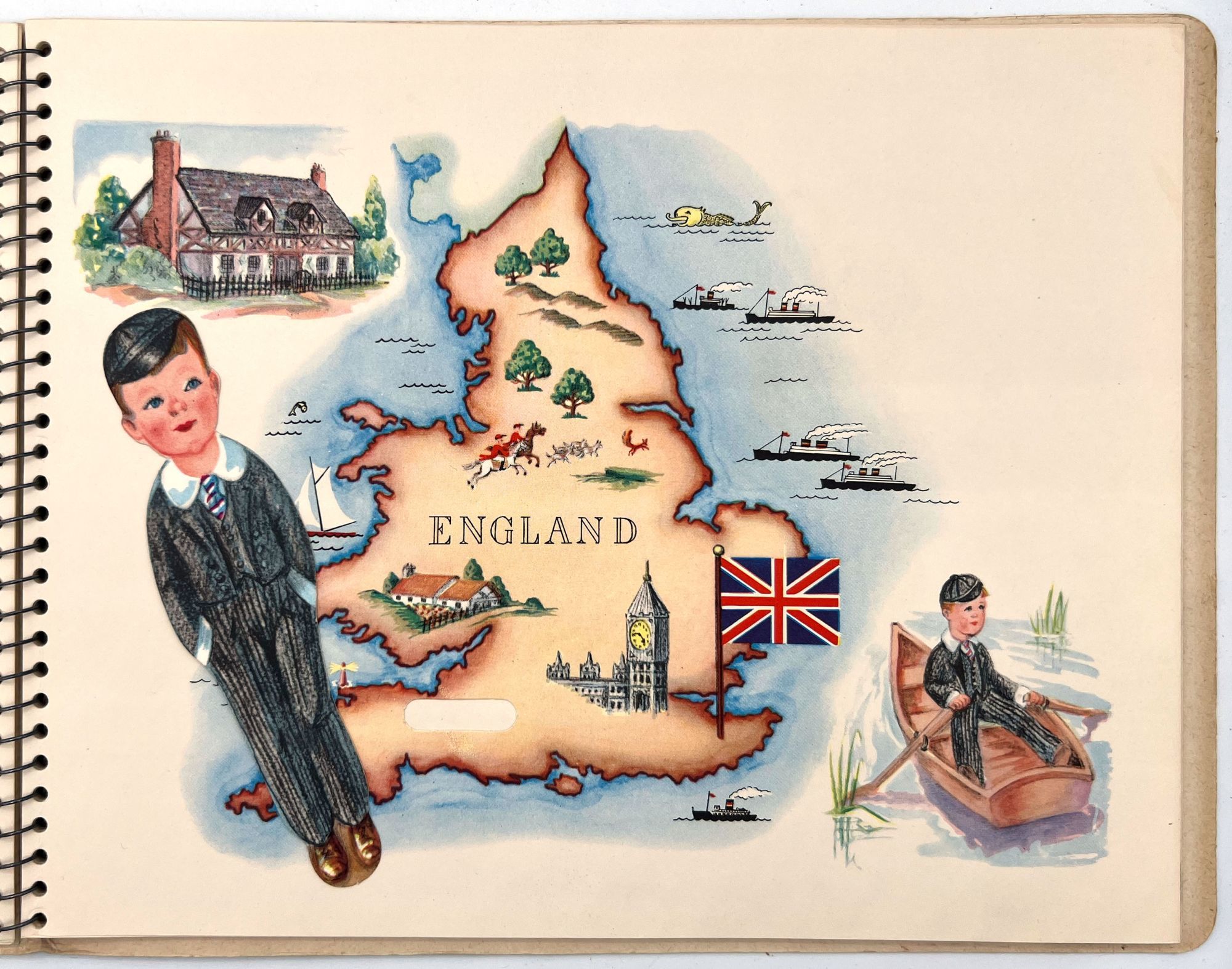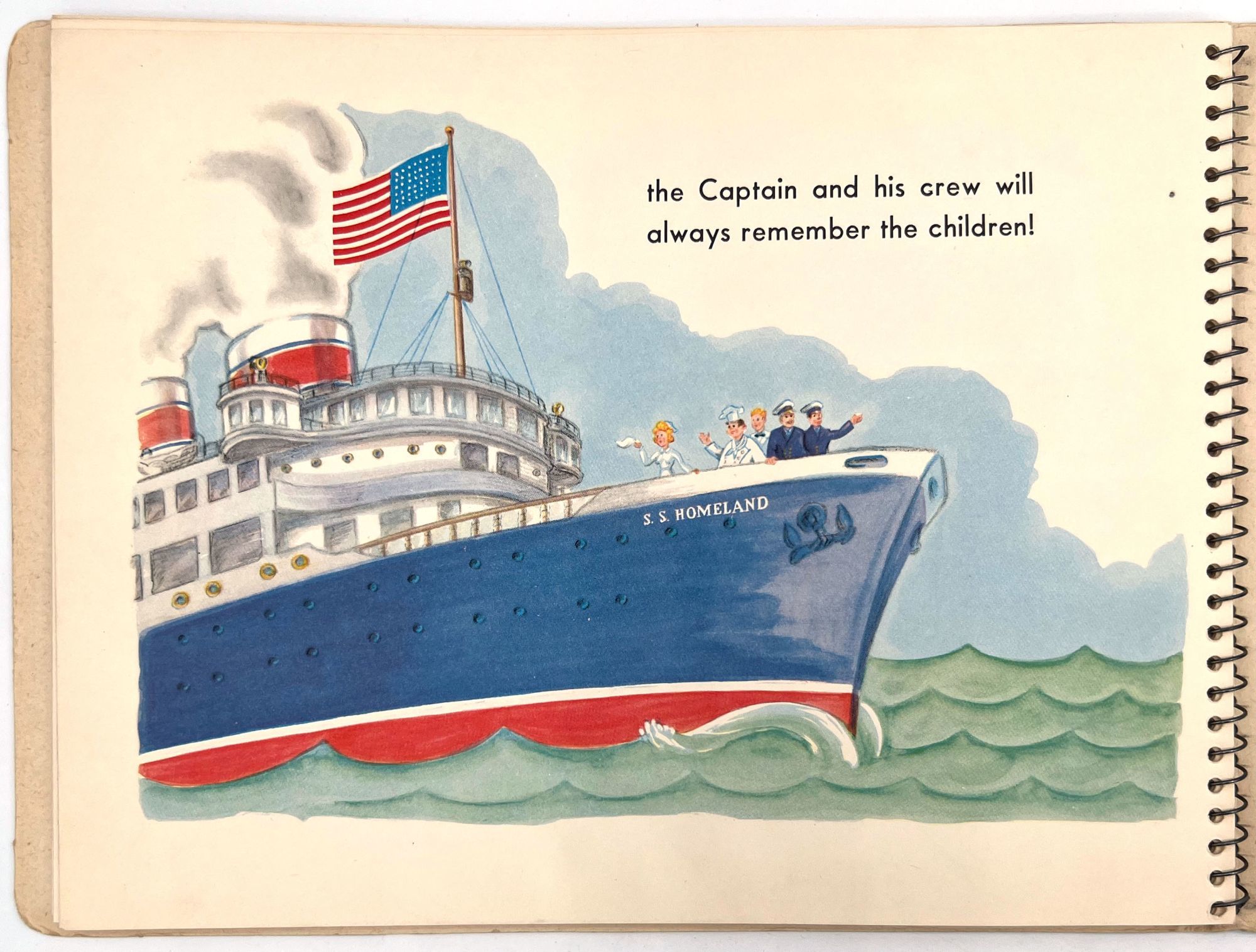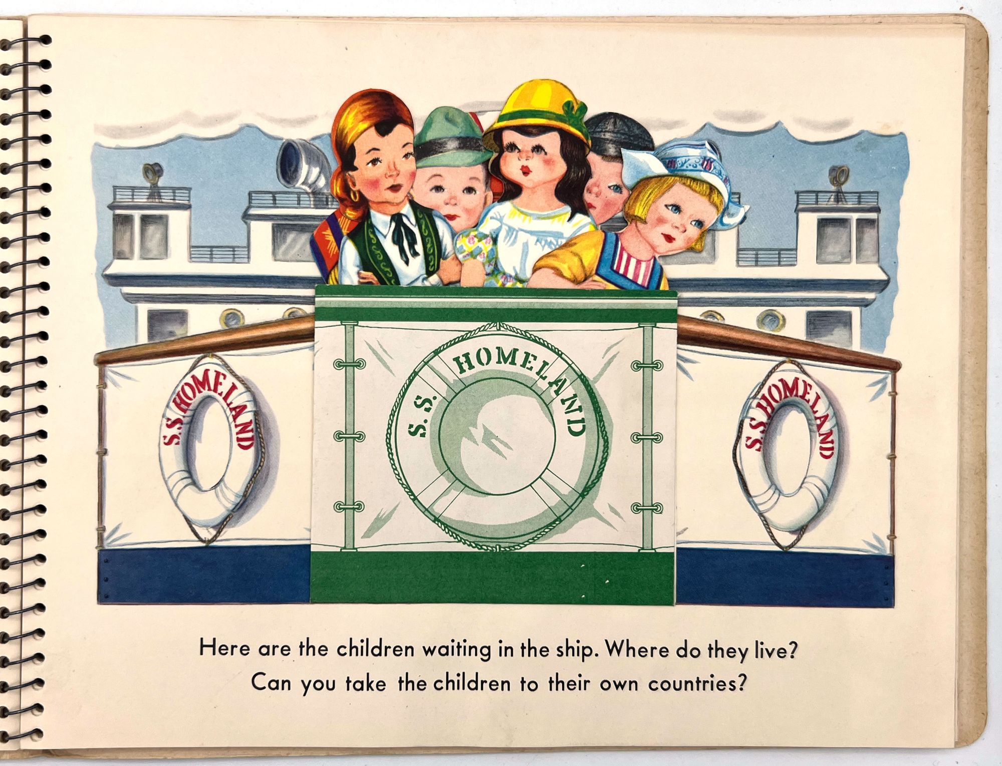 United States: Dorothy K. Weeblow, 1951. Very good. Minor wear to extremities and minor dust soiling. All six (6) dolls present and in very good to near-fine condition.. A charming interactive children's book emphasizing international friendship and cultural heritage. The story revolves around six children from European countries (England, France, Italy, Holland, Switzerland, and Norway) who are traveling across the Atlantic on an ocean liner. The young reader is asked to help the Captain and his crew return the children to each of their countries; to do this, the reader must take each of the six (6) die-cut paper dolls from an envelope on the fifth leaf, and put them in the slots of their prospective countries on the following leaves. Each child is dressed in traditional clothing, and are slotted onto a map that shows special features of their respective country (e.g. cheese for Switzerland). The book ends, "Now that you have taken the children to their own countries, everyone is happy. The children will always remember the good times they had in America." Oblong 8vo (7.5" by 9.75"), 12 unnumbered leaves with six (6) die-cut dolls, bound in original spiral-bound illustrated covers.