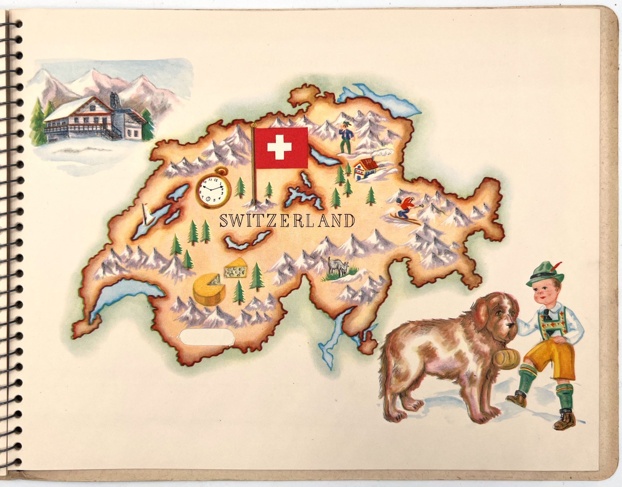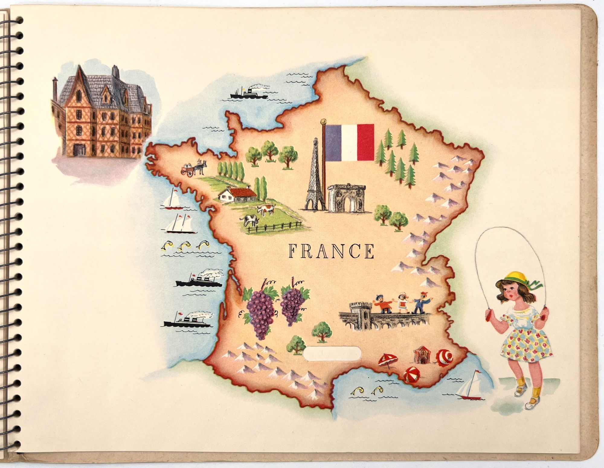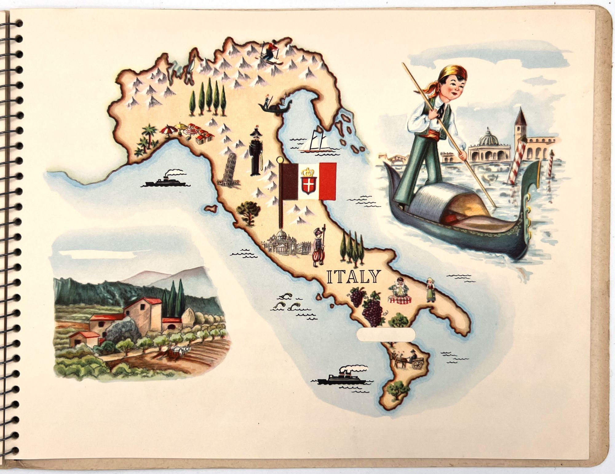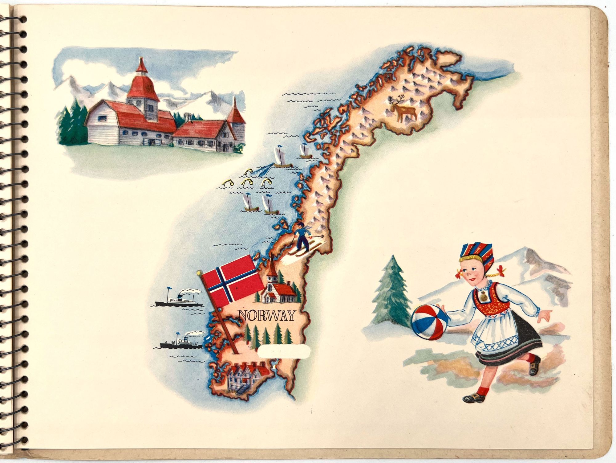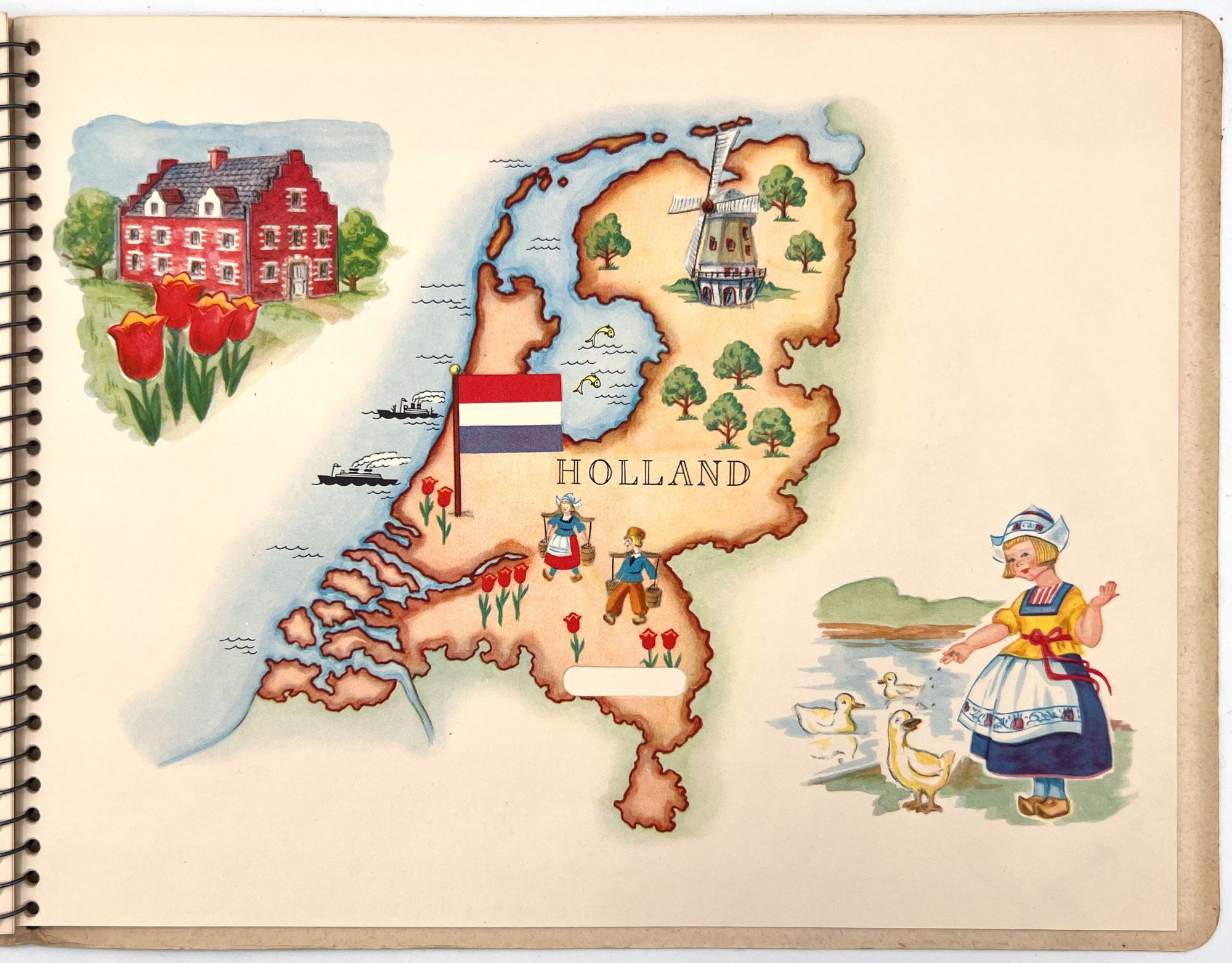 United States: Dorothy K. Weeblow, 1951. Very good. Minor wear to extremities and minor dust soiling. All six (6) dolls present and in very good to near-fine condition.. A charming interactive children's book emphasizing international friendship and cultural heritage. The story revolves around six children from European countries (England, France, Italy, Holland, Switzerland, and Norway) who are traveling across the Atlantic on an ocean liner. The young reader is asked to help the Captain and his crew return the children to each of their countries; to do this, the reader must take each of the six (6) die-cut paper dolls from an envelope on the fifth leaf, and put them in the slots of their prospective countries on the following leaves. Each child is dressed in traditional clothing, and are slotted onto a map that shows special features of their respective country (e.g. cheese for Switzerland). The book ends, "Now that you have taken the children to their own countries, everyone is happy. The children will always remember the good times they had in America." Oblong 8vo (7.5" by 9.75"), 12 unnumbered leaves with six (6) die-cut dolls, bound in original spiral-bound illustrated covers.