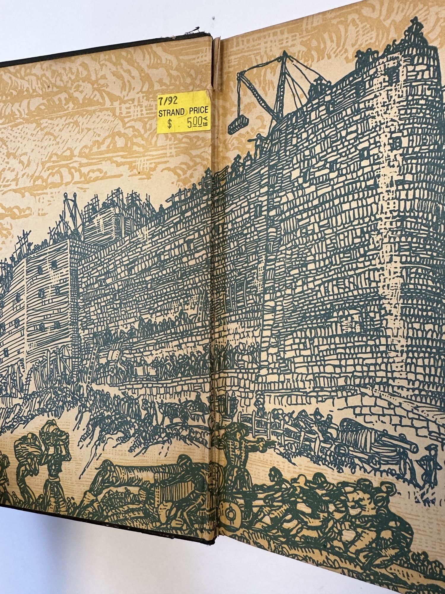 textblock clean with black top edge dye and deckled fore edge; illustrated endpapers printed in yellow and blue, small rectangular yellow sticker reading "7/92 STRAND PRICE $5.00 EA" on front pastedown, mild split to expose webbing at gutter of front endpaper, almost complete split to expose webbing at gutter of rear endpaper; black and white illustrations throughout, with select illustrations printed in yellow and blue as well; mild textblock splits at signature boundaries; shelved below front counter. 1363853. Shelved Dupont Bookstore.
