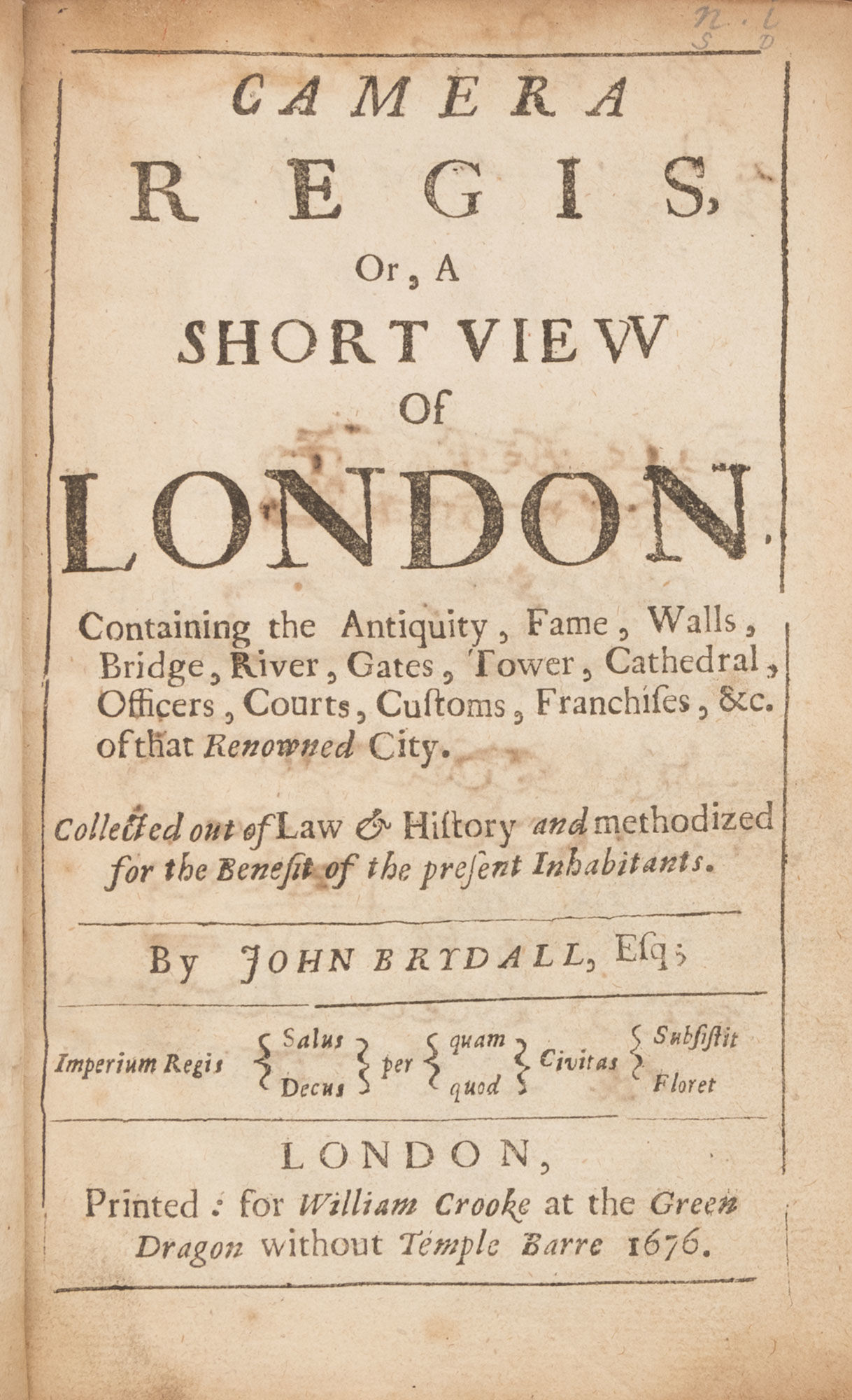 1676. London: Printed: for William Crooke, 1676. London: Printed: for William Crooke, 1676. Brydall on London, A Copy Presented by the Author to His Father Brydall, John [b.1635?]. Camera Regis, Or, A Short View of London: Containing the Antiquity, Fame, Walls, Bridge, River, Gates, Tower, Cathedral, Officers, Courts, Customs, Franchises, &c. Of that Renowned City. Collected Out of Law & History and Methodized for the Benefit of the Previous Inhabitants. London: Printed: for William Crooke, 1676. [viii], 125, [3] pp. Octavo (6-1/2" x 4-1/4"). Recent calf, blind frames to boards, gilt fillets and lettering piece to spine, endpapers renewed. A few minor scratches to boards, light fading to front board, faint offsetting to preliminaries, retained later armorial bookplate (of William Alexander) to front pastedown, later monogram bookplate (RFG) to recto of first blank. Moderate toning to interior, occasional light foxing and staining to top-edge, light edgewear to final leaf without loss to text. Early inscription "Presidio Veritas/ ex dono authoris filii/ charissimi mei" to verso of title page, struck-through early annotation below. $1,250. * First edition. Brydall was a fellow of Queen's College, Oxford, and a bencher of Lincoln's Inn. A remarkably prolific writer, he published 36 legal treatises, and left 30 others in manuscript at the time of his death. All of these are brief, synthetic works. Holdsworth says they are good summaries that are "clearly arranged and based on the leading authorities." The present title gives an overview of the laws and customs of London. Our copy was apparently presented by Brydall to his father. The work was reissued with a reset title page in 1678. Holdsworth, A History of English Law VI:605. English Short-Title Catalogue R31996.
