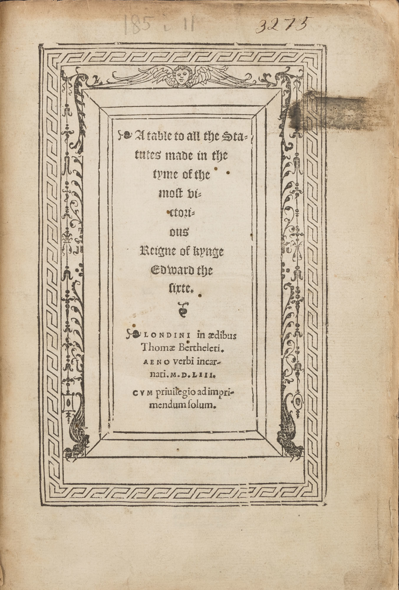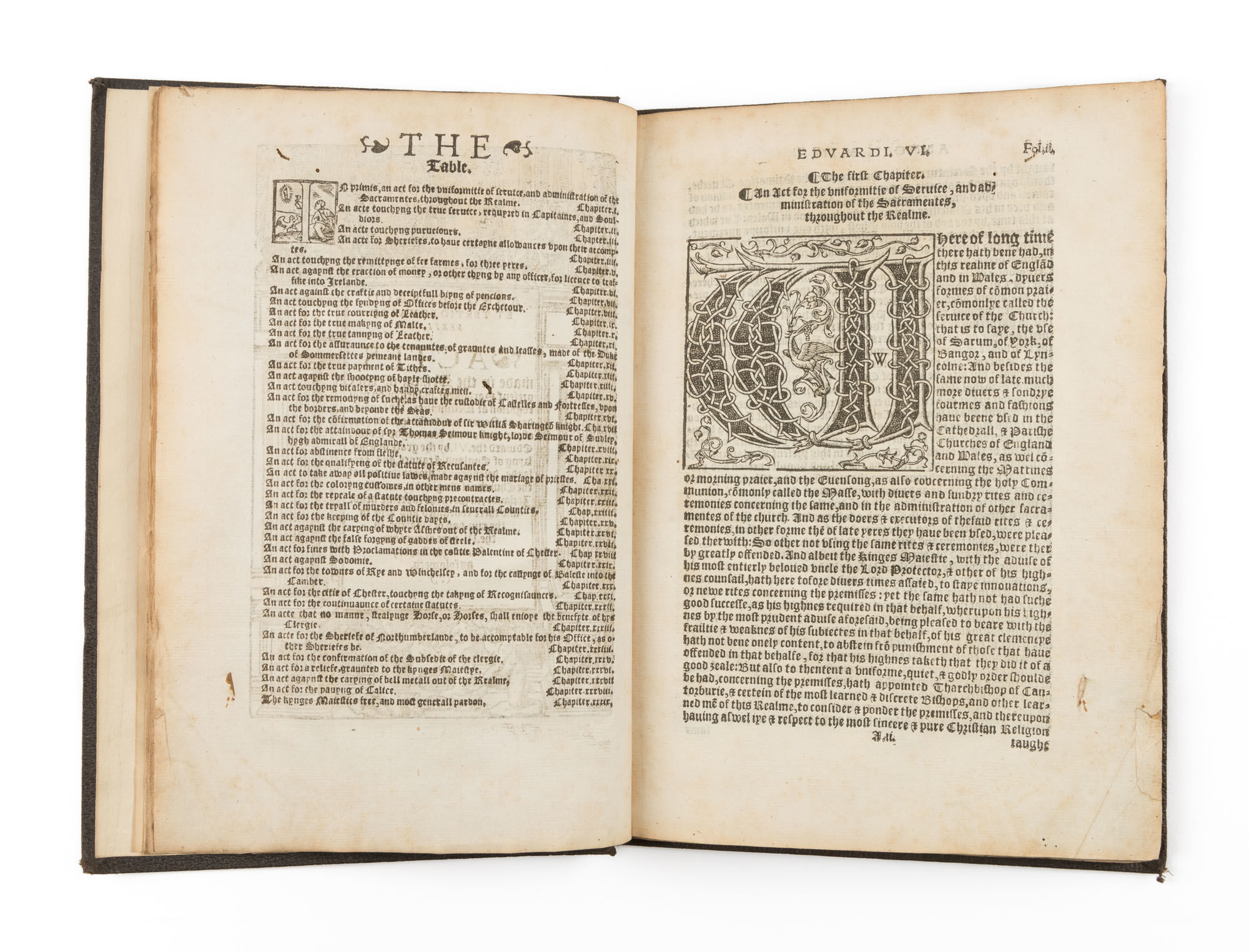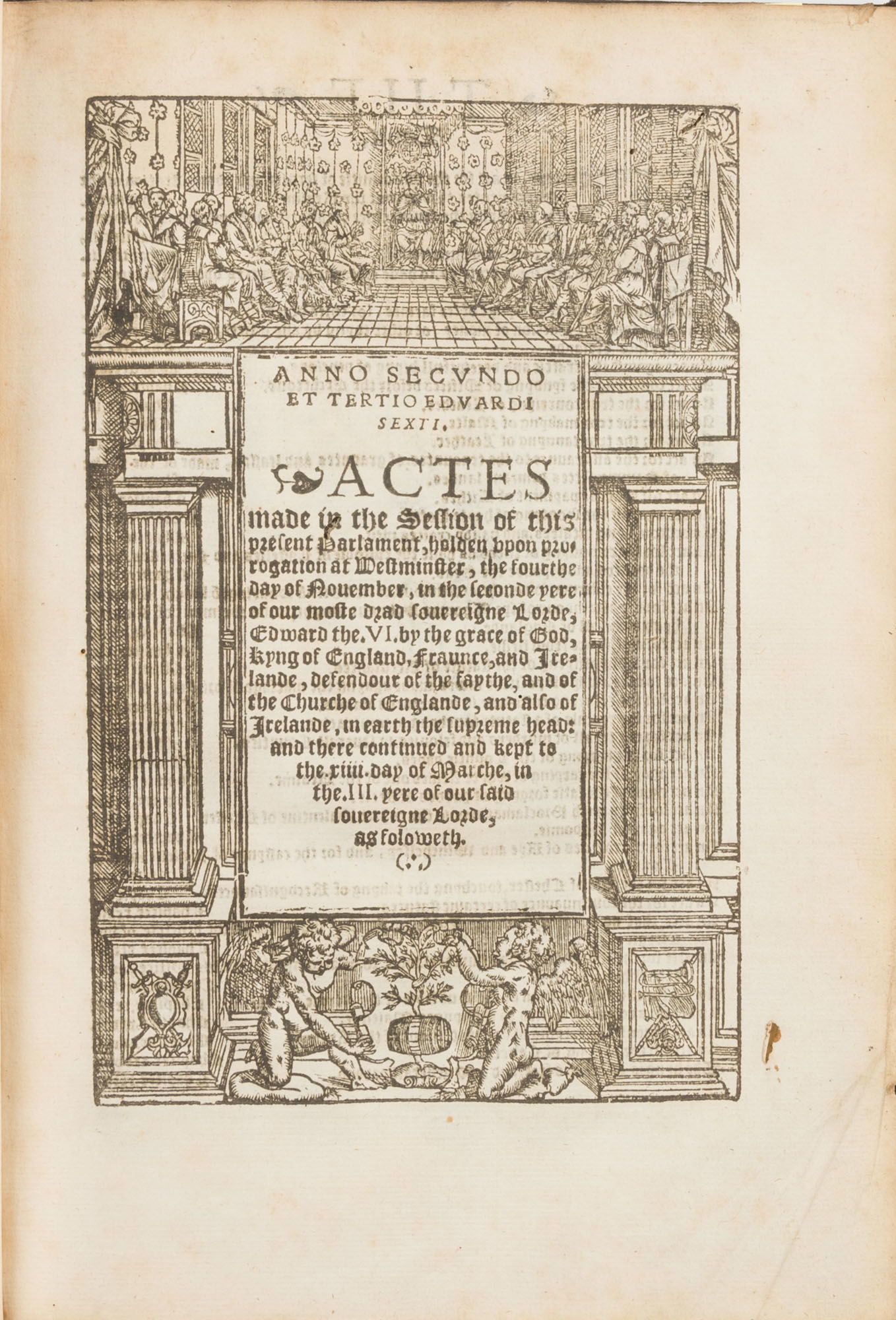 1553. Edward VI's Protestant Reforms [Great Britain]. Edward VI [1537-1553], King of England. A Table to All the Statutes Made in the Tyme of the Most Victorious Reigne of Kynge Edward the Sixte. London: In Aedibus Thomae Bertheleti Aeno Verbi Incarnati, 1553. [8] pp. [Bound with] Edward VI, King of England. Anno Secundo et Tertio Eduardi Sexti. Actes Made in the Session of this Present Parlament, Holden Upon Prorogation at Westminster, The Fourthe Day of November, In the Seconde Yere of Our Most Drad Sovereigne Lorde, Edward the .VI. By the Grace of God, Kyng of England, Fraunce, And Irelande, Defendour of the Faythe, And of the Church of Englande, And Also of Irelande, In Earth the Supreme Head: And There Continued and Kept to the .xiiii. Day of Marche, In the .III. Yere of Our Said Sovereigne Lorde, As Foloweth. [(London): Richardus Graftonus (i.e. Richard Tottell?), Typographus Regius Excudebat, 1552 (i.e. 1557?)]. lxvi [i.e. lxviii] ff. [And] Edward VI, King of England. Anno. III & IIII. Edwardi Sexti.... [London: Imprinted...by Richard Grafton (i.e. Richard Tottell?), 1553 (i.e. 1560?)]. xxix-xxxii ff. [ONLY]. Folio (11" x 7-1/2"; 27.94 x 19.05 cm). Later (nineteenth-century) pebbled cloth, fragment of paper label to spine. Light rubbing and minor soiling to boards, moderate rubbing and light fading to extremities, rear joint starting at ends, small holes at ends of front joint, spine ends and corners bumped and lightly worn, later armorial bookplate (of Edwin Freshfield) to front pastedown. Moderate toning to interior, light soiling in a few places, several small wormholes to text block of the Table and minor worming to a few leaves of Anno Secundo et Tertio, no loss to legibility, small pencil and ink annotations to title page of Table. $2,000. * Table: only edition; Anno Secundo et Tertio: later edition. 39 public acts passed under Edward VI in 1548-1549. Some of the more interesting acts involve significant Protestant reforms to the English Church, including the Act of Uniformity, which established the Book of Common Prayer as the sole form of legal worship in England. Also included is the Clergy Marriage Act, which abolished the prohibition on marriage for priests in the Church of England. The Table is a separately printed index encompassing all of Edward.