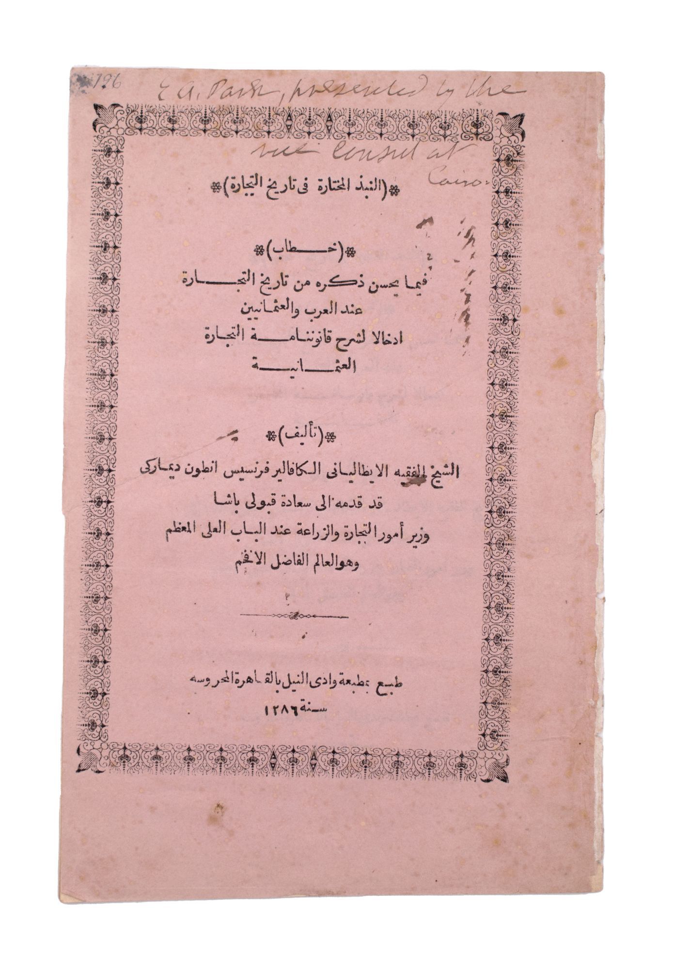 Cairo: Maṭbaʻat Wādī al-Nīl, 1869. 12 pp. 1 vols. 8vo. Rose printed wrappers. Removed. Very good. Contemporary note in English at top of front wrapper, “E.A. Park, presented by the Vice Consul at Cairo”. 12 pp. 1 vols. 8vo. Speech on the history of Arab Ottoman trade, noting the key position of Egypt as nexus between Red Sea and Mediterranean commercial routes. This was delivered at a time when Egypt was asserting greater claims of sovereignty under Isma‘il and when the trade laws were moving away from shari‘a basis to a commercial code, often derived from European models.