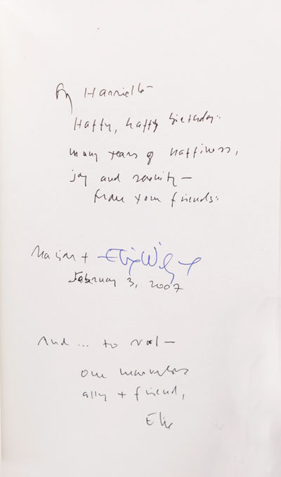 Franklin Center, Pennsylvania: The Franklin Library, 1985. Limited First Edition. Privately Printed and personally signed by the Author. Illustrated by Frances Jetter. 210, [2]pp. 1 vols. 8vo. Bonded black gilt stamped leather, a.e.g. Fine. Limited First Edition. Privately Printed and personally signed by the Author. Illustrated by Frances Jetter. 210, [2]pp. 1 vols. 8vo. Inscribed "For Harriet (Levine)-Happy, happy birthday many years of happiness, joy and serenity- from your friends Marian (in Marian's hand) & (rest in Elie's hand) Elie Wiesel Feburary 3, 2007...and..to Noel --- ally & friend, Elie."
