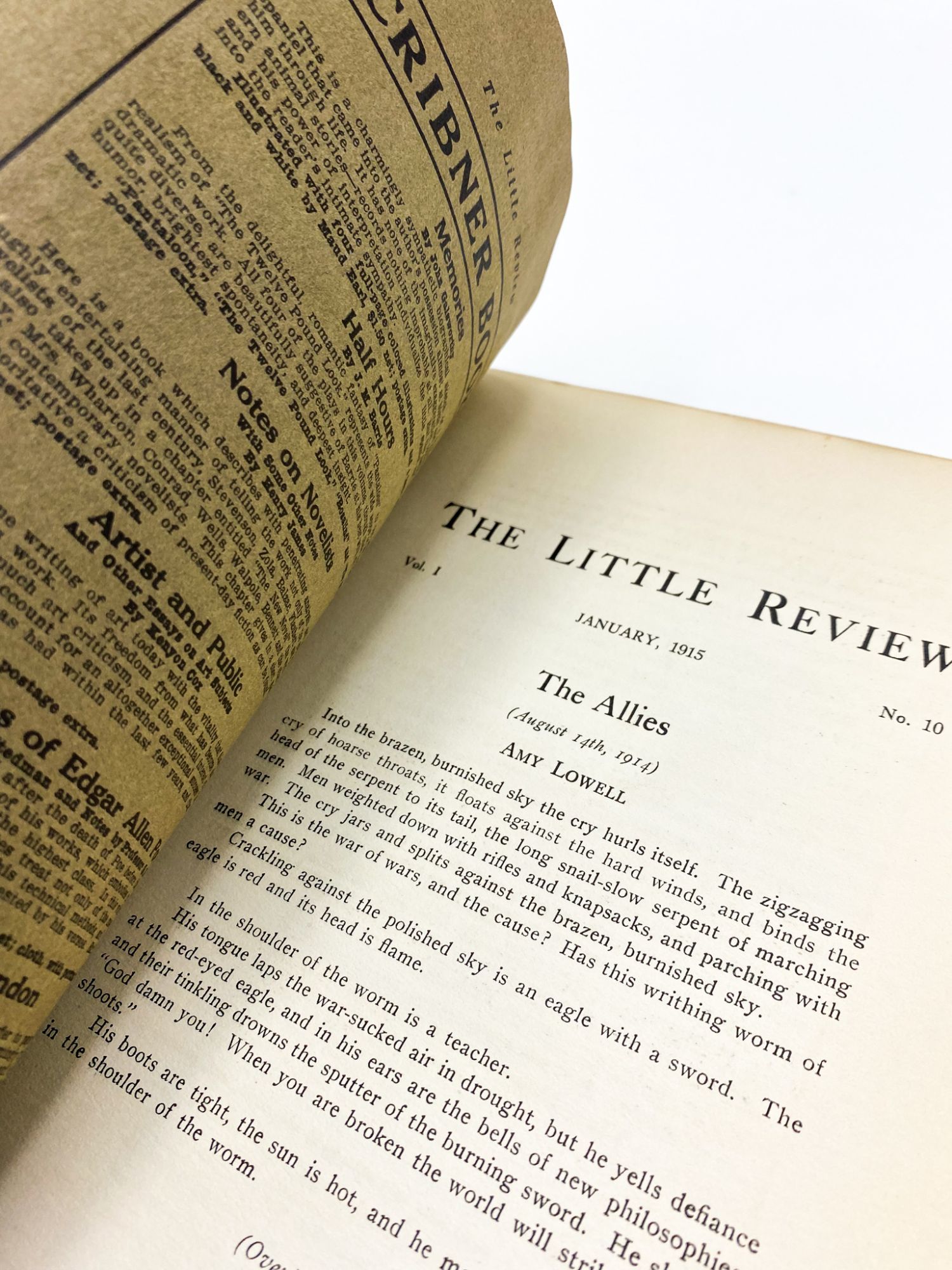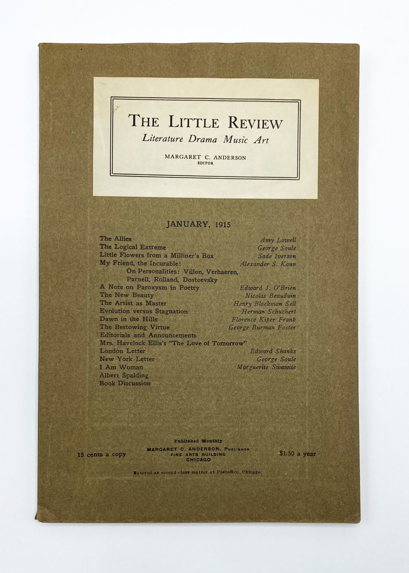 Chicago: Margaret C. Anderson, 1915. First edition. Near fine.. Early issue of the celebrated Modernist journal, full of vigorous cultural and literary criticism. Founded in 1914, THE LITTLE REVIEW swiftly gained attention for its experimental approach to art, literature, and politics alike. This issue includes poetry by Lowell along with literary work and criticism by Edward J. O'Brien, Henry Blackman Sell, Florence Kiper Frank, George Burman Foster, and others. 10'' x 6.75''. Original brown printed wrappers. Paper label mounted to front cover. 65 pages. Light edgewear, faint rippling to wrappers, bumping to spine ends.
