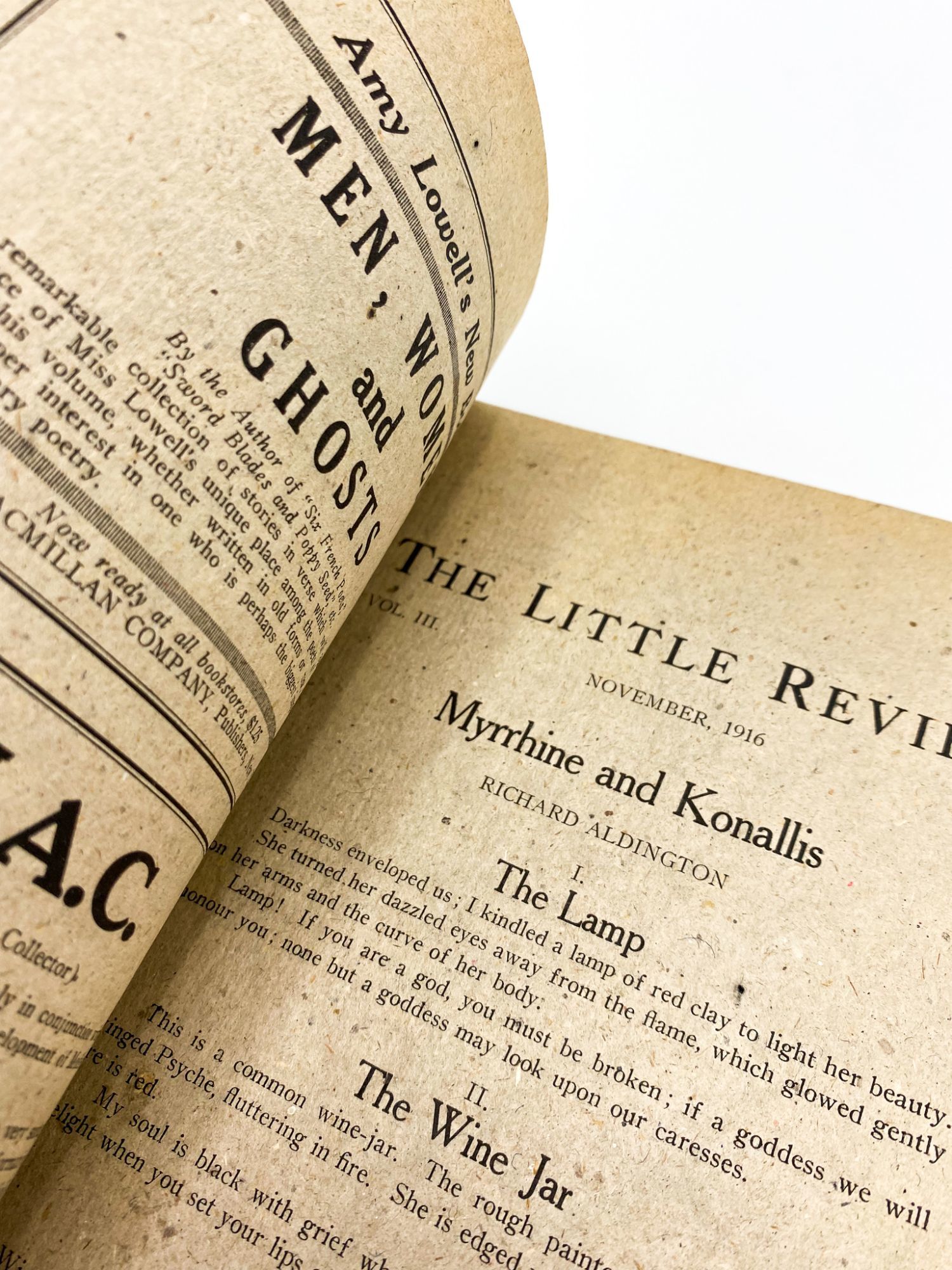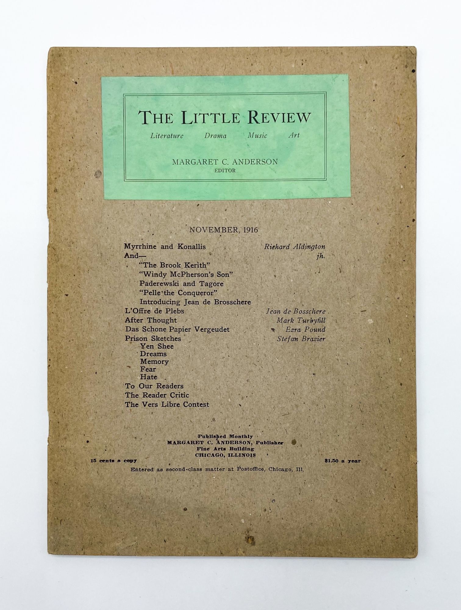 Chicago: Margaret C. Anderson, 1916. First edition. Very good plus.. Spirited issue of the celebrated Modernist magazine, with work by Ezra Pound and Jean de Bosschère. Founded in 1914, THE LITTLE REVIEW soon gained a reputation for its experimental approach to art, literature, and politics alike - as "a decadent art magazine that delights in publishing the filth of contemporary writers," as Anderson later recalled THE NEW YORK TIMES putting it. This issue features work by Richard Aldington; co-publisher Jane Heap, signing herself "jh"; and Stefan Brazier; as well as Pound and de Bosschère. 9.5'' x 6.75''. Original saddle-stapled wrappers with green paper label mounted to front cover. 28 pages. Minor chipping to corners; several small tears along edges. Edges toned.