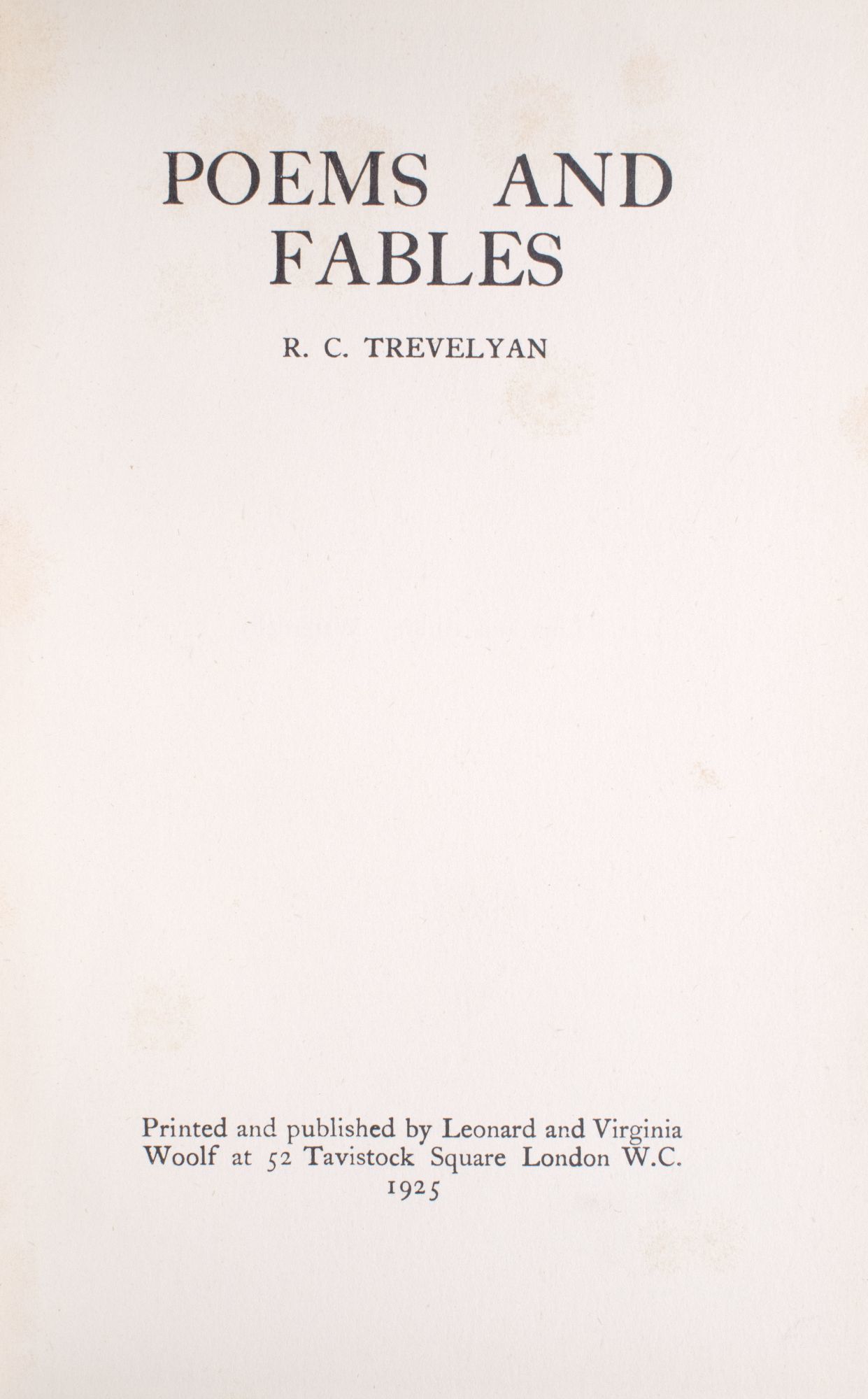 London: Printed and published by Leonard and Virginia Woolf, 1925. First edition [Woolmer 78 ("about 300 copies printed")]. 24pp. 8vo. Marbled paper-covered boards with publisher's printed label on front coverCover label is lightly tanned, with light foxing on endpapers (text otherwise fresh and clean), else a near fine copy. First edition [Woolmer 78 ("about 300 copies printed")]. 24pp. 8vo. Poet and classicist R.C. Trevelyan was a friend of Roger Fry (the Omega Workshops printed one of his books).