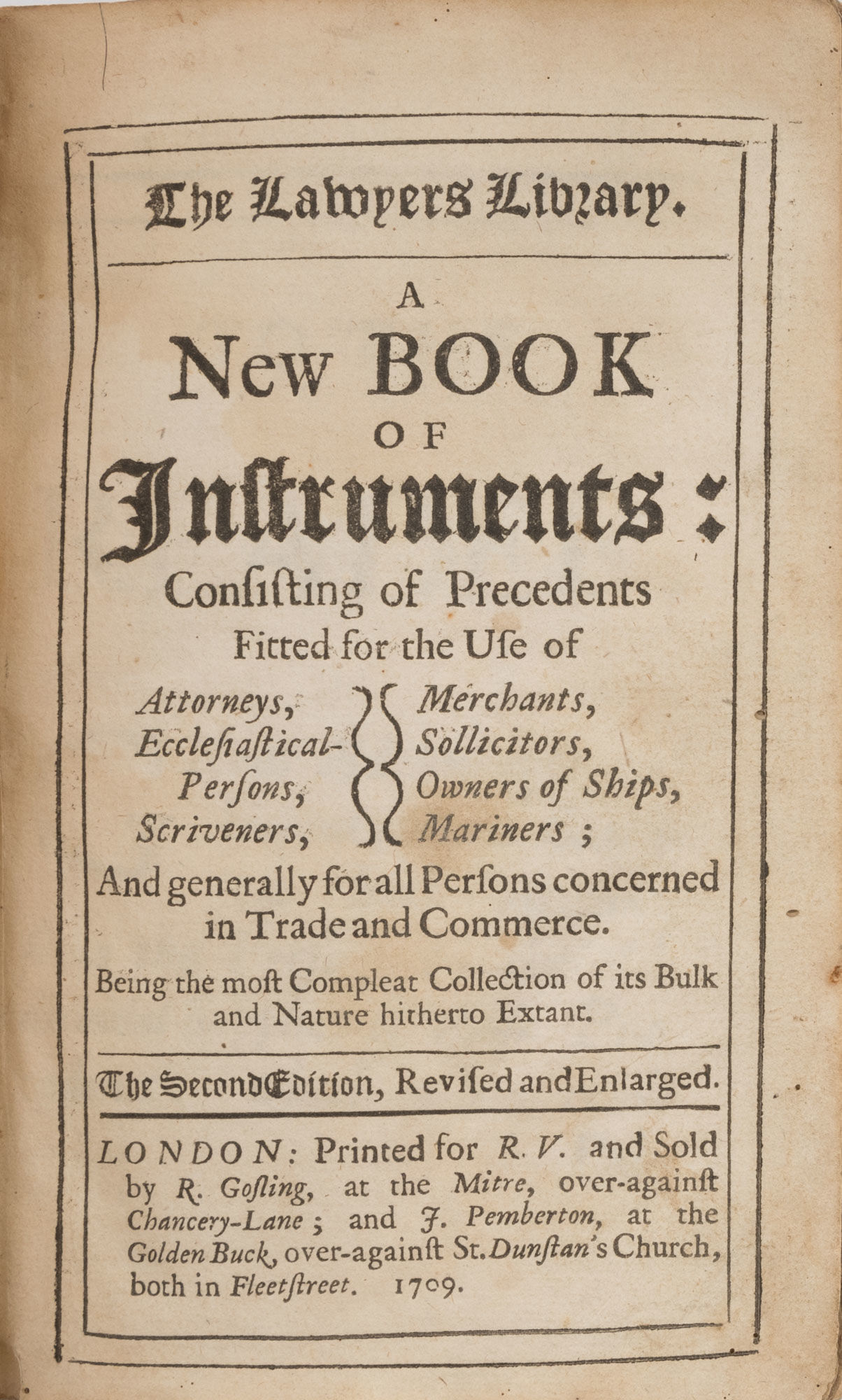 1709. London: R. V. And Sold by R. Gosling, 1709.. London: R. V. And Sold by R. Gosling, 1709. "A New Book of Instruments" [Forms]. [Great Britain]. The Lawyers Library. A New Book of Instruments: Consisting of Precedents Fitted for the Use of Attorneys, Ecclesiastical-Persons, Scriveners, Merchants, Sollicitors, Owners of Ships, Mariners; And Generally for All Persons Concerned in Trade and Commerce. Being the Most Compleat Collection of Its Bulk and Nature Hitherto Extant. Revised and Enlarged. London: Printed for R. V. And Sold by R. Gosling, 1709. [viii], 256; 215, [15] pp. Two parts, each with separate pagination. Title page preceded by publisher advertisement. Octavo (6" x 3-3/4"). Contemporary calf, blind rules to boards, blind fillets along joints, raised bands to spines, recent repairs to corners, top-edges of boards and head of spine, endpapers renewed. Light rubbing and a few minor nicks and scuffs to boards, spine ends bumped, some rubbing to joints, a few cracks to text block. Moderate toning to interior, faint dampstaining to preliminaries and final few leaves of text. $850. * Second and final edition. Arranged alphabetically by subject and represented as "Being the most Compleat Collection" of its kind, this work was first published in 1680. Both editions of this title are rare. OCLC locates 3 copies of the second edition, all in law libraries (University of Georgia, University of Pennsylvania, Yale). The ESTC adds 1 more (Harvard). English Short-Title Catalogue N10404.