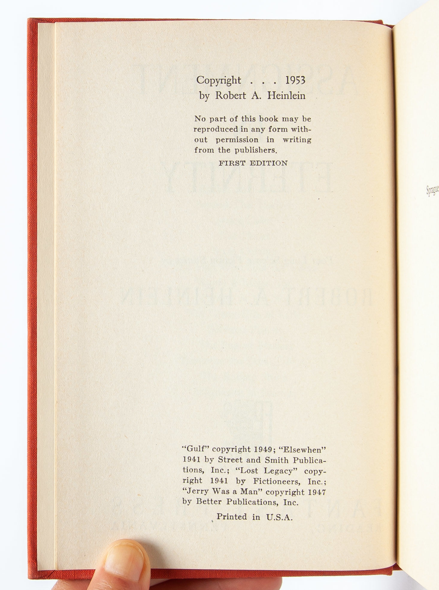 A collection of four early sci-fi works, loosely related in their speculation about the nature of humanity. The themes of how one defines a human being would carry throughout Heinlein's wriitng and would shape his career. Near Fine in Very Good + dust jacket.