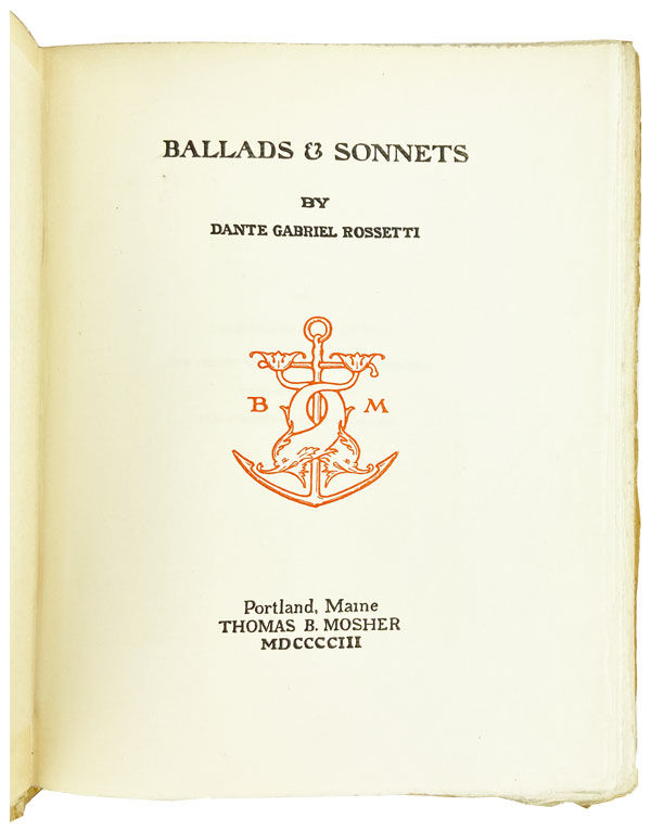 Portland, ME: Thomas B. Mosher, 1903. Very Good. Portland, ME: Thomas B. Mosher, 1903. First Thus, Limited to 450 copies printed on Van Gelder hand-made paper. Quarto; publisher's cream over blue paper-covered boards, printed paper spine label; xxxvi,[2],334pp.; photographic portrait frontispiece (tissue guard). Extremities lightly scuffed and rather toned, red spine lettering almost entirely effaced, later ownership rubber-stamp to front pastedown, else a Very Good copy, internally clean and sound.