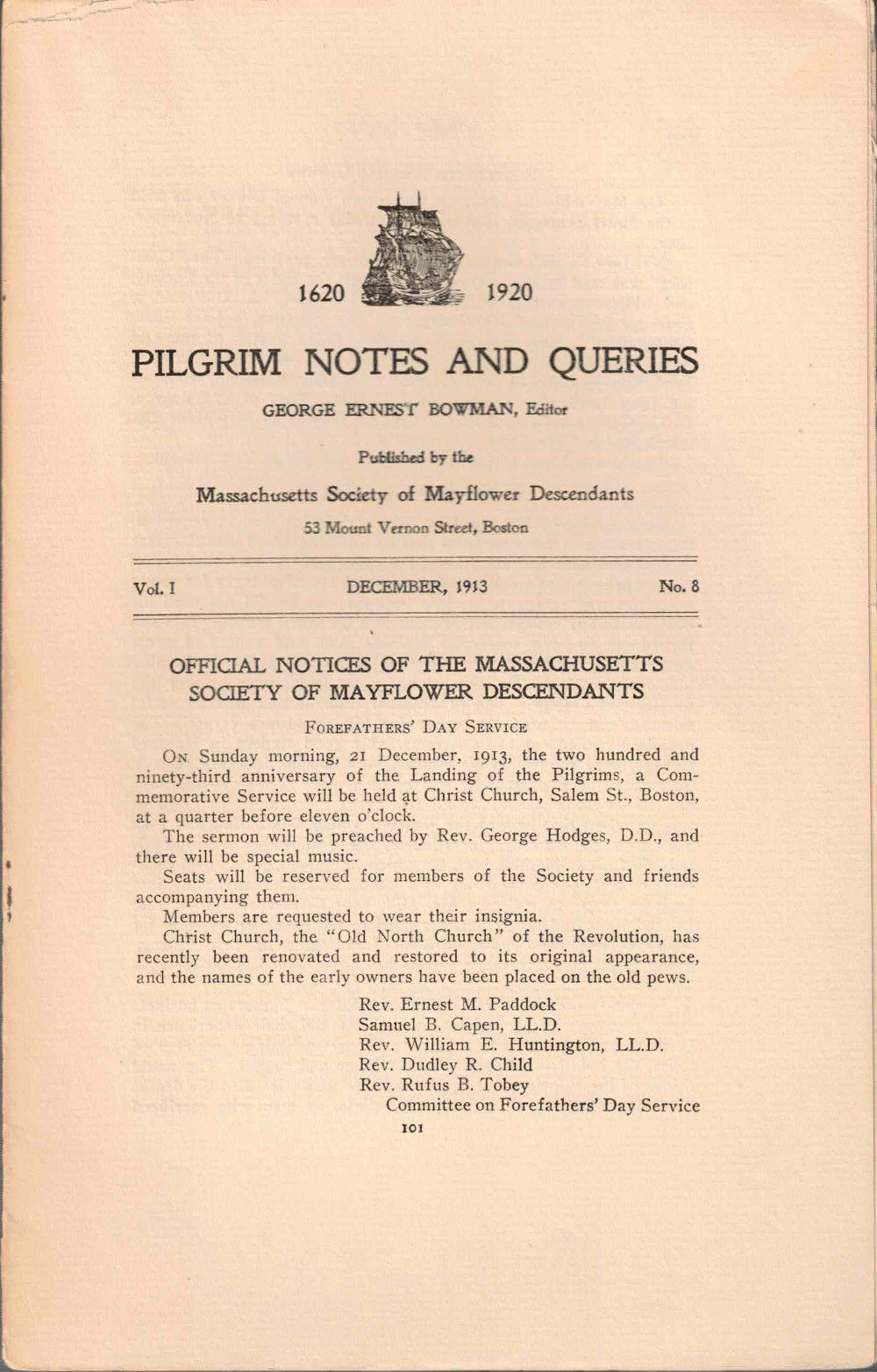 Pilgrim Notes and Queries December 1913, Vol. I No. 8