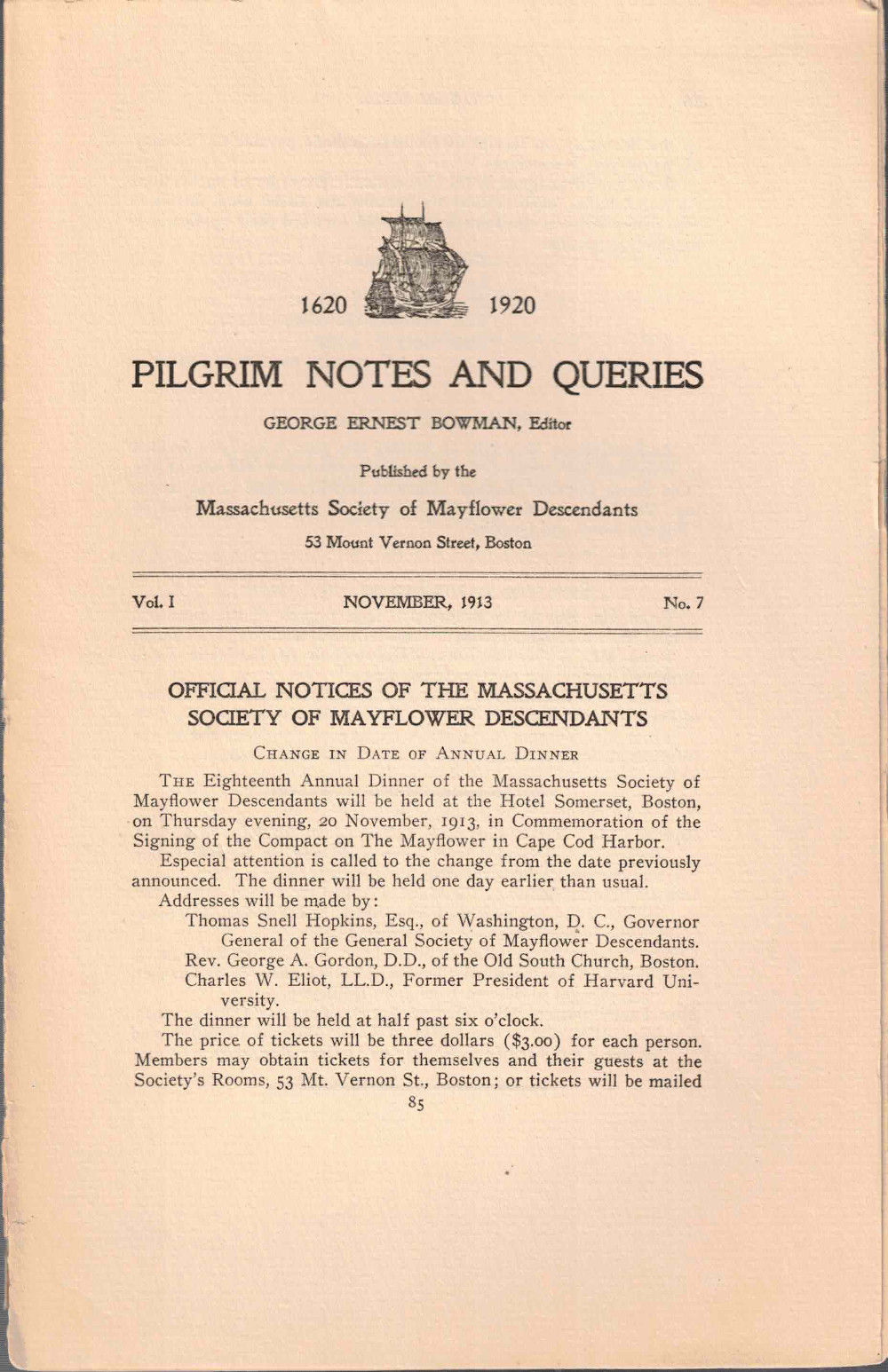 Pilgrim Notes and Queries November 1913, Vol. I No. 7