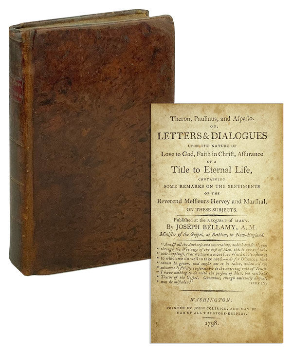 1. "Theron, Paulinus, and Aspasio. Or, Letters & Dialogues upon the nature of love to God, faith in Christ, assurance of a title to eternal life, containing some remarks on the sentiments of the Reverend Messieurs Hervey & Marshal, on these subjects." Washington, PA: John Colerick, and may be had of all the store-keepers, 1798. ix [i.e. iv],133,[1]pp. (a2 B-L6 M8). EVANS 33396.