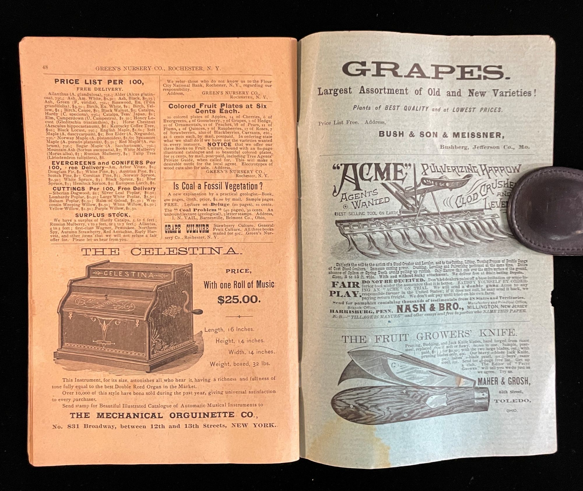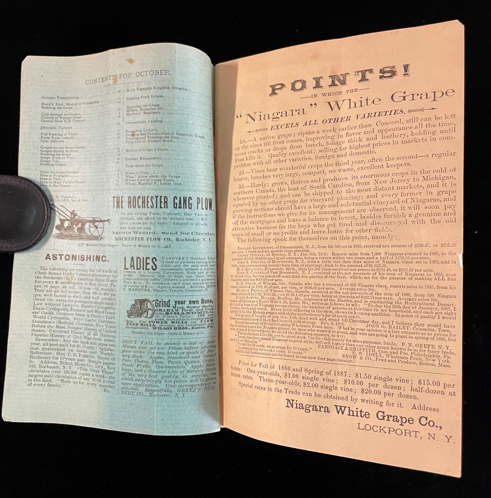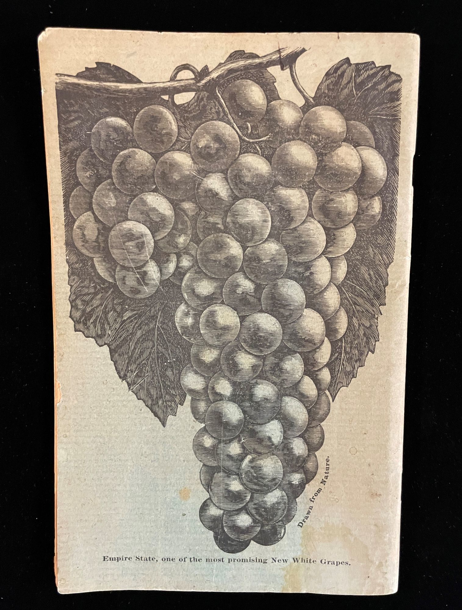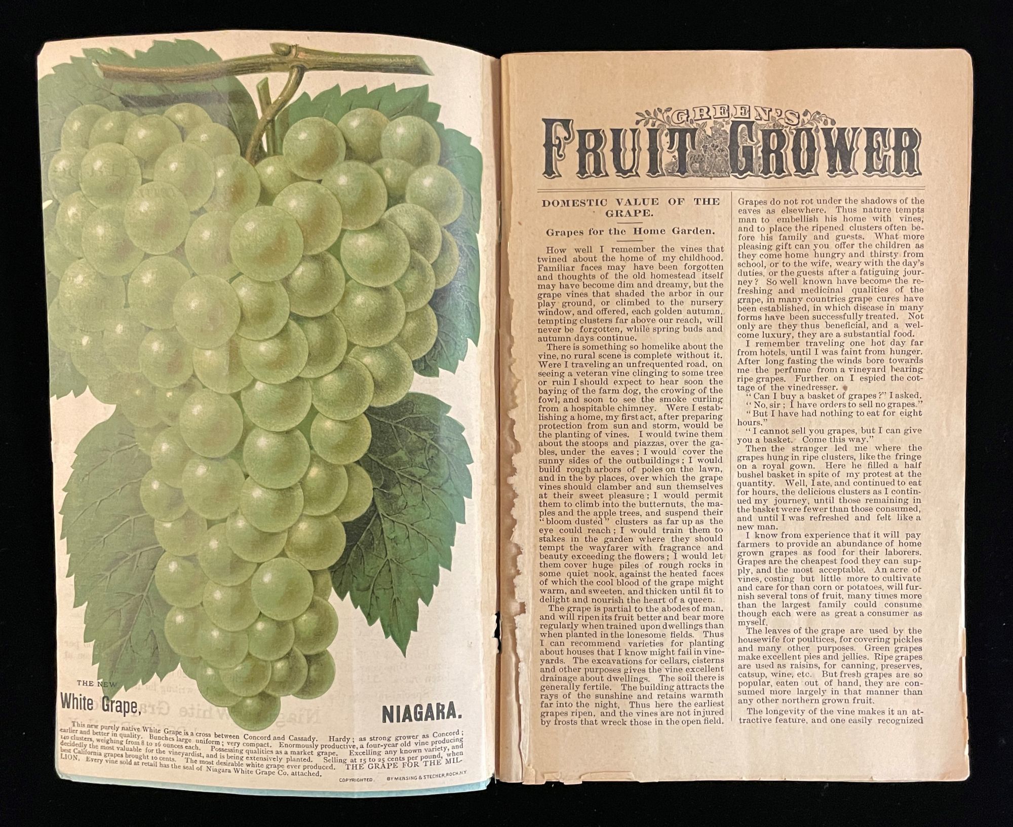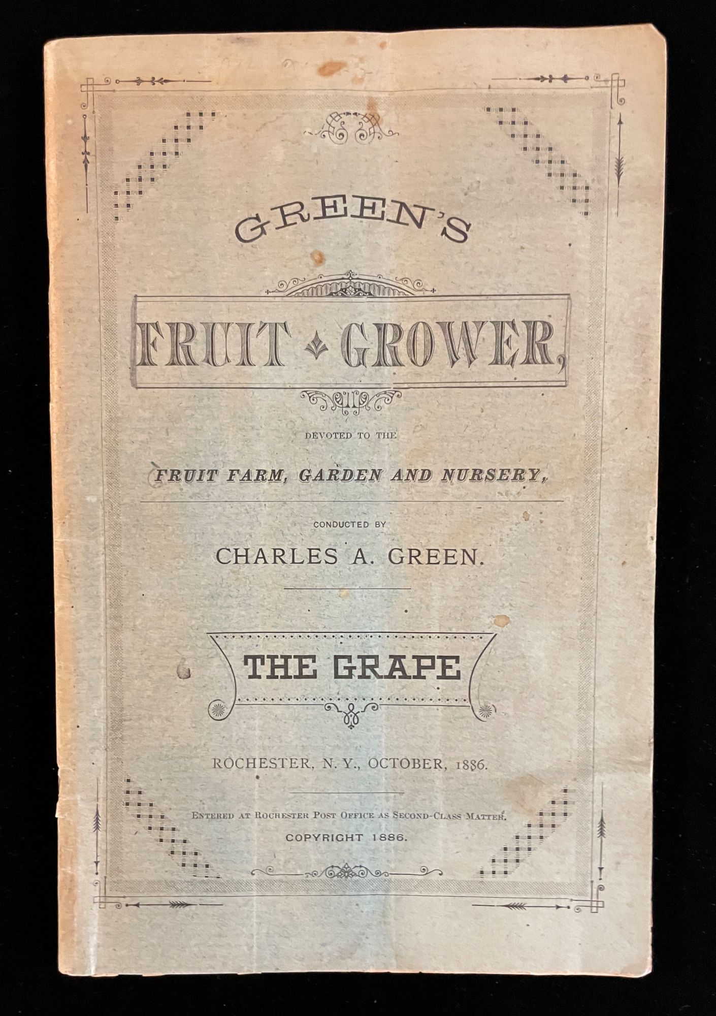 Rochester NY: Charles A. Green, 1886. 1st Edition. Soft cover. Very Good. Trade catalog featuring the Niagara White Grape of upstate NY from Rochester's purveyor of fruit farm, garden and nursery plants and supplies. Catalog, approx. 6x9", printed light green covers, stapled spine.48 pages. Besides the Niagara species, Green presents other aspects of grape culture. Lots of advertisements, too. Nicest feature is a stunning full page chromolithograph of the featured grape. Covers moderately soiled. First page separated. Scarce. OCLC lists only titles of Green's Fruit Grower from 1906-17, and only one from an unidentified year in the (late) 1800's. We could find no fruit grower catalog dated 1886 for the grape. (The Fruit Grower dedicates a page in this journal to how to order from the Niagara White Grape Co of Lockport NY and OCLC identfies only 1 copy of that firm's catalag on the subject.).