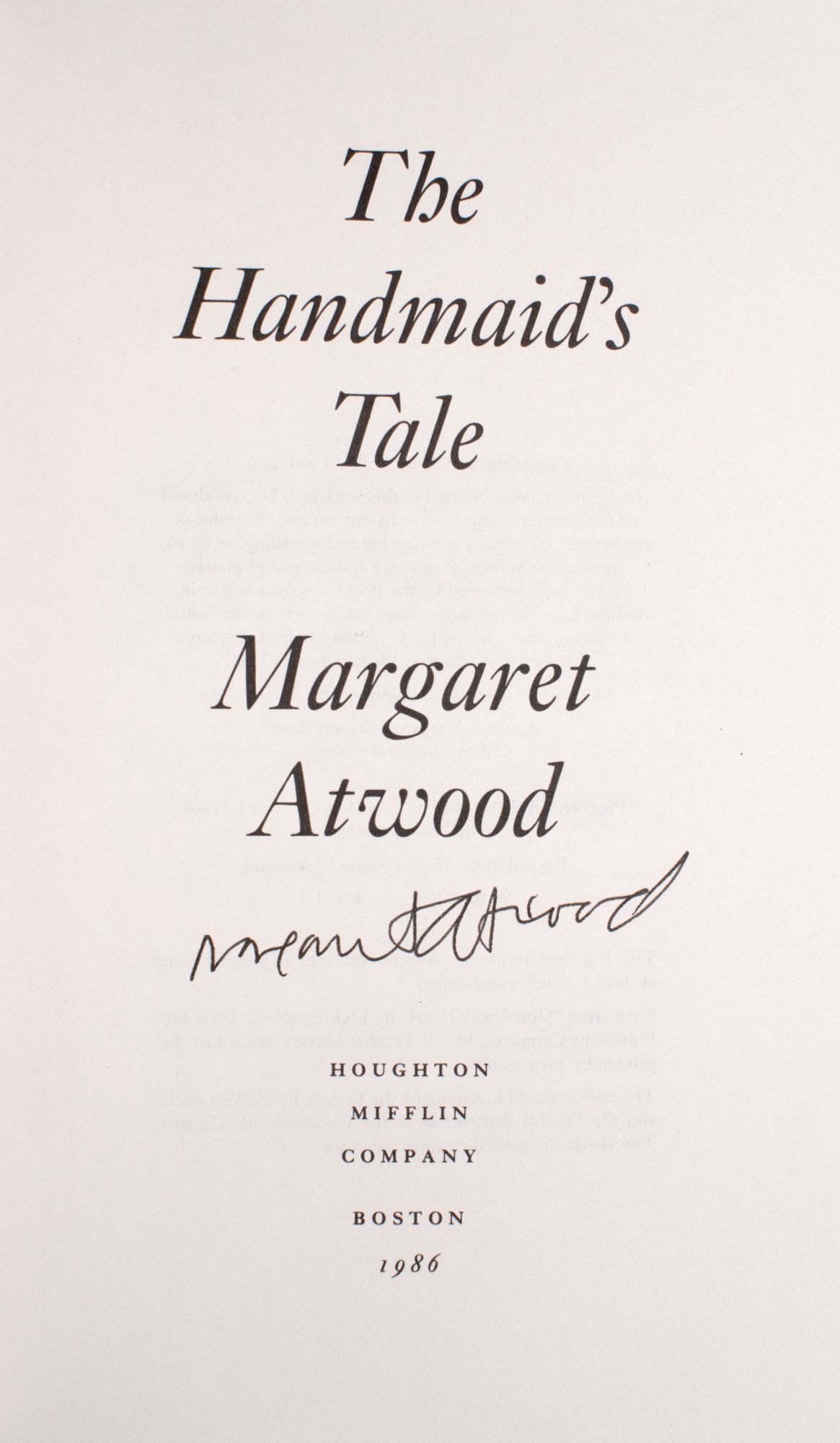 Boston: Houghton Mifflin, 1986. First U.S. edition. 311 pp. 1 vols. 8vo. Quarter teal cloth spine and grey paper boards with with gilt lettering. Light foxing to top edge, previous ownership in black ink on flyleaf, a near fine copy in near fine illustrated dust jacket (one bump at top corner of front panel). Publisher's promotional card laid in. Signed by the author on title page. First U.S. edition. 311 pp. 1 vols. 8vo.