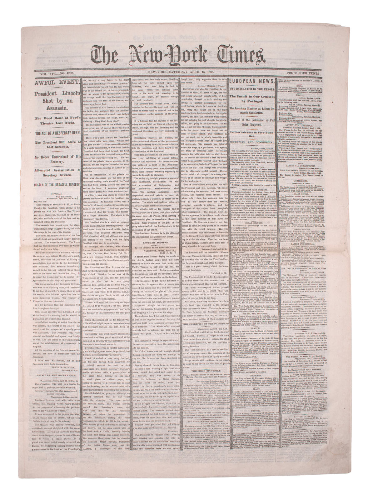 The New-York Times ... April 15, 1865 ... Awful Event. President Lincoln Shot by an Assassin. The Deed Done at Ford's Theatre Last Night
