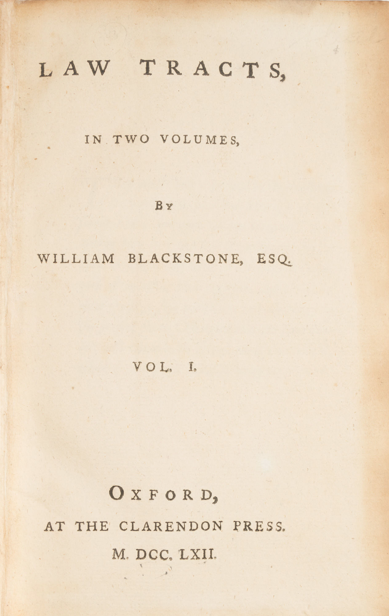 1762. Oxford, 1762. 1st ed.. Oxford, 1762. 1st ed. A First Edition of Blackstone's Law Tracts in an Exceptional Binding Blackstone, Sir William [1723-1780]. Law Tracts, In Two Volumes. Oxford: At the Clarendon Press, 1762. Two volumes. [iv], 257, [7]; [iv], cxv, [5], 135, [9] pp. 4 parts, each with divisional title page. 8 copperplate facsimiles (of royal seals), engraved copperplate Table of Descents and folding Table of Consanguinity. Octavo (7-3/4" x 5"). Superb period-style calf by Philip Dusel, gilt rules to boards, raised bands, lettering pieces, gilt fillets and gilt volume numbers to spines, blind tooling to board edges, pastedowns and free endpapers renewed. Light toning to interiors, minor dampstaining to heads of text blocks in a few places, faint offsetting and light edgewear to margins of preliminaries and final few leaves. A handsome set in an exceptional binding. $3,500. * First edition. The first collected edition, with revisions, of five early works, several of which are quite rare in their original editions. They are reprinted here "with a few corrections and additions"; each of the volumes contains a general index. The works are, Volume I: An Essay on Collateral Consanguinity (1750, Blackstone's first legal publication), Considerations on Copyholders (1758), Treatise on the Law of Descents in Fee-Simple (1759), Volume II: The Great Charter (1759) and Magna Carta, Carta de Forest, Etc. (1759). A "third" edition was published in 1771. (There is no evidence of a second edition, unless one counts the pirated Dublin reissue of the first, which was printed in 1767.) The contents of the two editions differ. The first does not have Analysis of the Laws of England (1756) or Observations on the Oxford Press (1757); the "third" does not have Treatise on the Law of Descents in Fee-Simple. Eller, The William Blackstone Collection in the Yale Law Library 238. Laeuchli, A Bibliographical Catalog of William Blackstone 551.