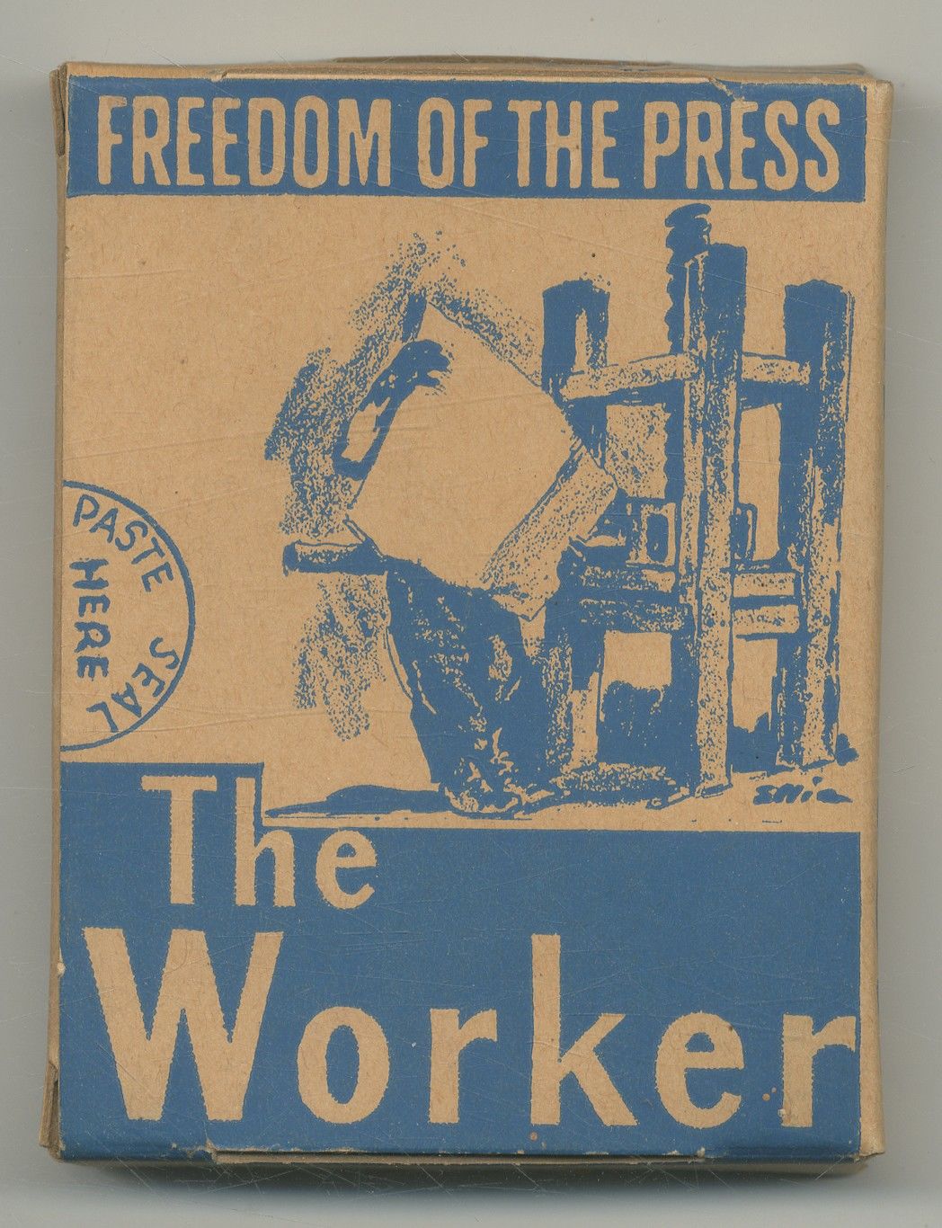 International Brotherhood of Pulp, Sulphite, and Paper Mill Workers, 1968. Unbound. Near Fine. Folding printed cardboard coin collection box. Approximately 3" x 4" x .75". A little rubbing, else very near fine. Printed on two larger sides with an image of a pressman examining a newspaper freshly pulled from a hand press and "Freedom of the Press. The Worker", and with the words "Equal Rights", "Peace", Jobs" and with a small image of a dove of peace, on the narrow side. Small stamp of the International Brotherhood of Pulp, Sulphite, and Paper Mill Workers, founded in 1909. Many newspapers were named *The Worker*, the most famous and probably the most likely in this case was *The Daily Worker* beginning in the early 1920s and published under different names and formats until 1991. This box seems likely to coincide with the paper published by the Communist Party from 1958 until 1968. Scarce and curious.
