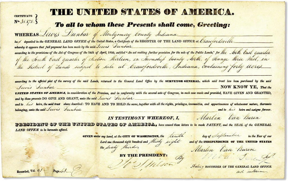 A land grant for forty acres near Crawfordsville, Indiana, sold to Lewis Dunbar of Montgomery County, Indiana.