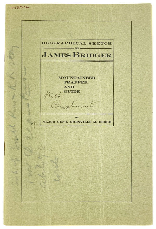 Kansas City, MO: R.M. Rigby Printing Co, 1904. Very Good. Kansas City, MO: R.M. Rigby Printing Co., [1904]. First Edition. Octavo. [18]pp., "Monument of James Bridger" plate present, though lacking initial frontis photo of Bridger. Printed wraps. Inscribed "With compliments" on cover above printed "by Major Gen'L Grenville M. Dodge, presumably by the author though without signature or dedication.