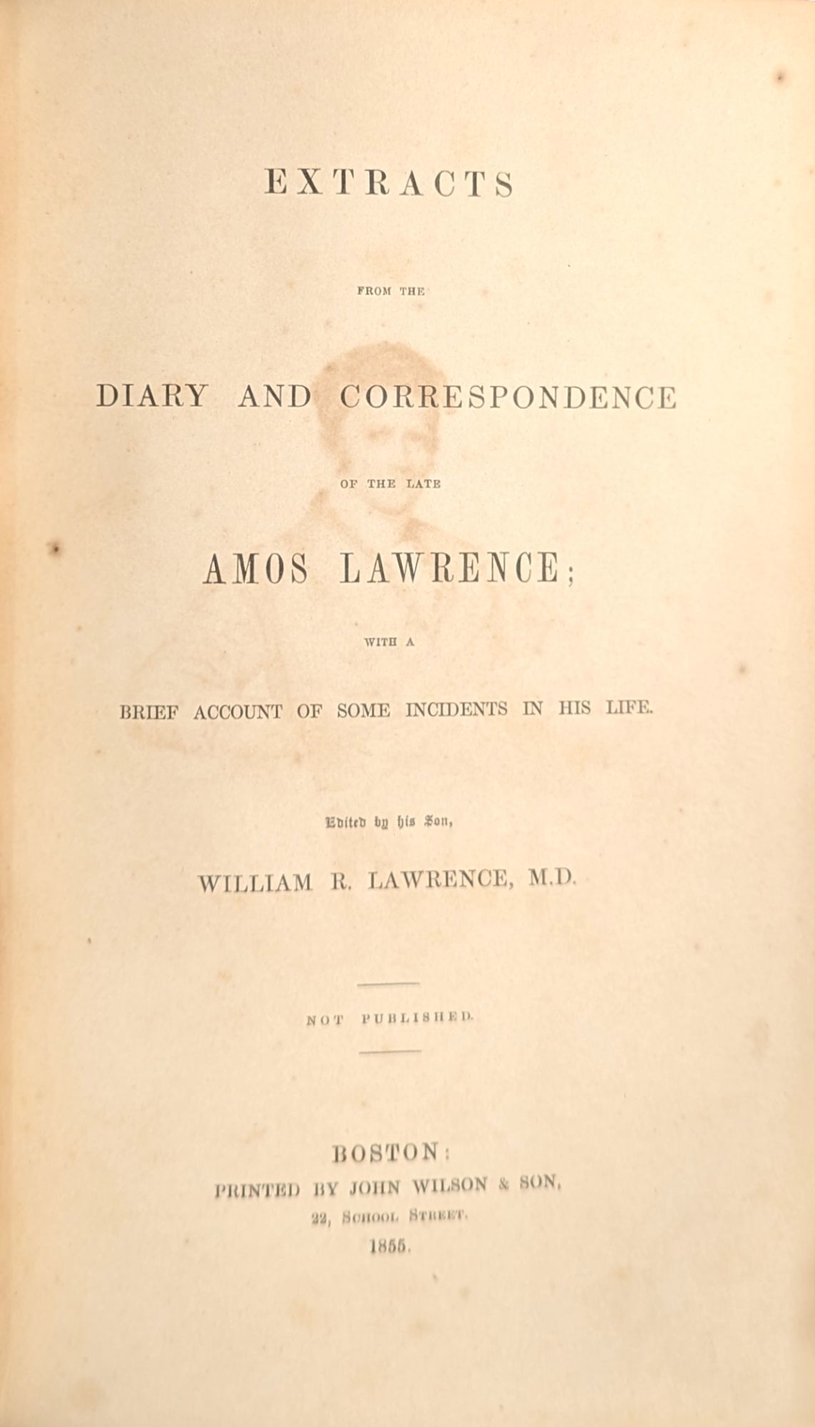 Excerpts from the journals and letters of Groton-born dry goods / textile merchant and philanthropist Amos Lawrence (1786-1852). His son Amos Adams Lawrence -- brother of our editor William and father of this copy's signee, Amory Appleton Lawrence -- was a social activist and abolitionist, donating money to the Massachusetts Emigrant Aid Company and rifles to the Jayhawkers in Kansas, as well as a businessman and philanthropist like his father, notably setting up the initial endowment to found the University of Kansas in his namesake town. Amory continued the in family's merchant tradition while also working in banking, the railroad, and acting as overseer of Harvard College from 1906 until his death in 1912.