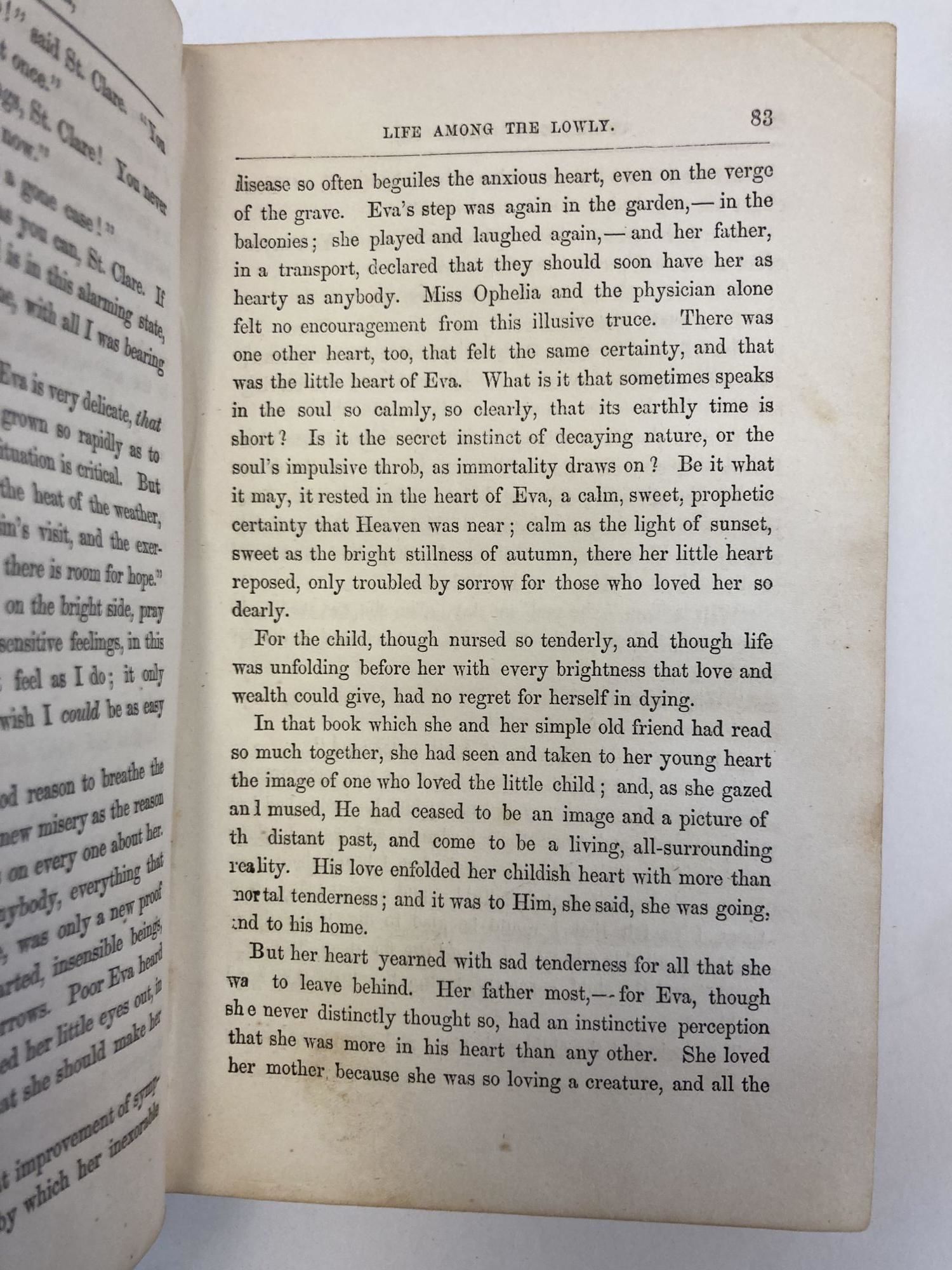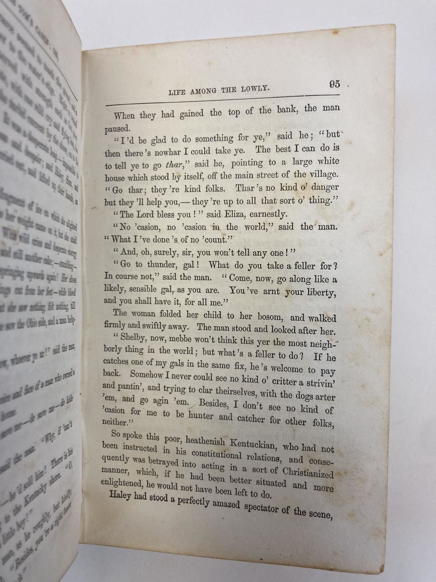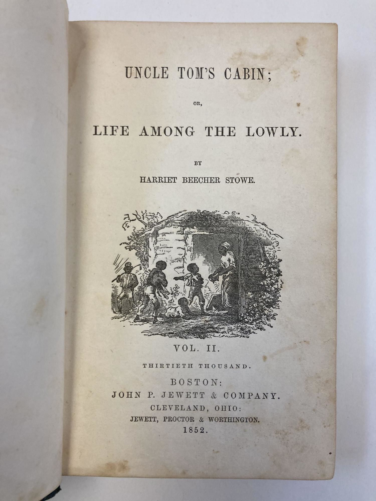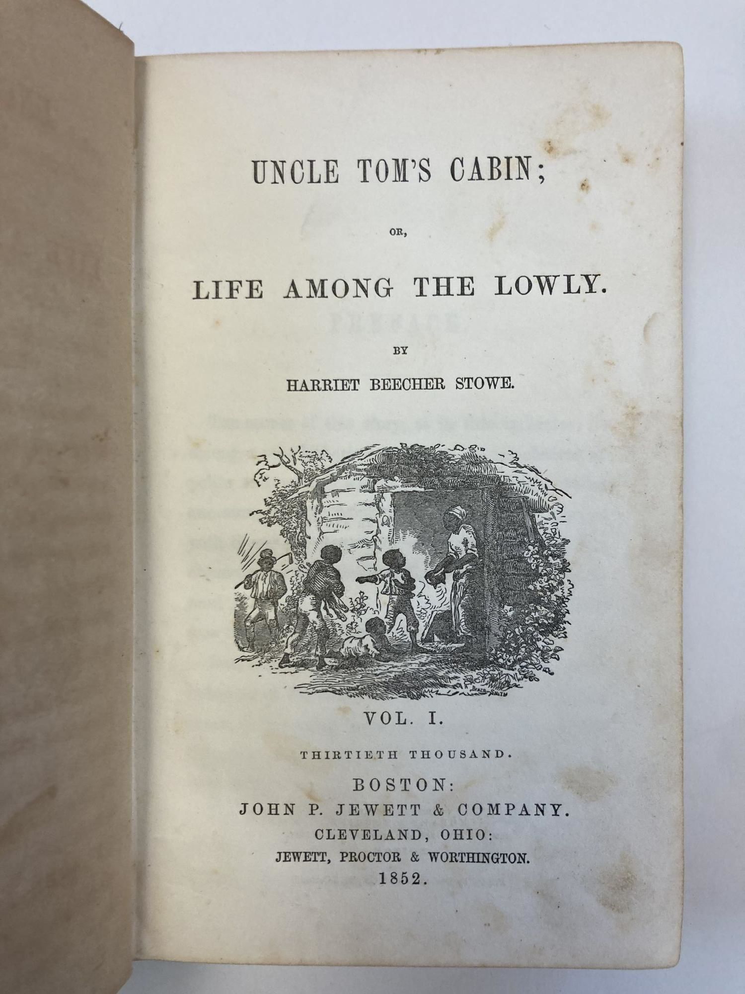 Uncle Tom's Cabin; or, Life Among the Lowly, is an anti-slavery novel by American author Harriet Beecher Stowe. Published in 1852, the novel had a profound effect on attitudes toward African Americans and slavery in the U.S. and is said to have "helped lay the groundwork for the Civil War". Uncle Tom's Cabin was the best-selling novel of the 19th century and the second best-selling book of that century, following the Bible. In the first year after it was published, 300,000 copies of the book were sold in the United States and one million copies in Great Britain. [wikipedia]. 1364215. Shelved Dupont Bookstore.