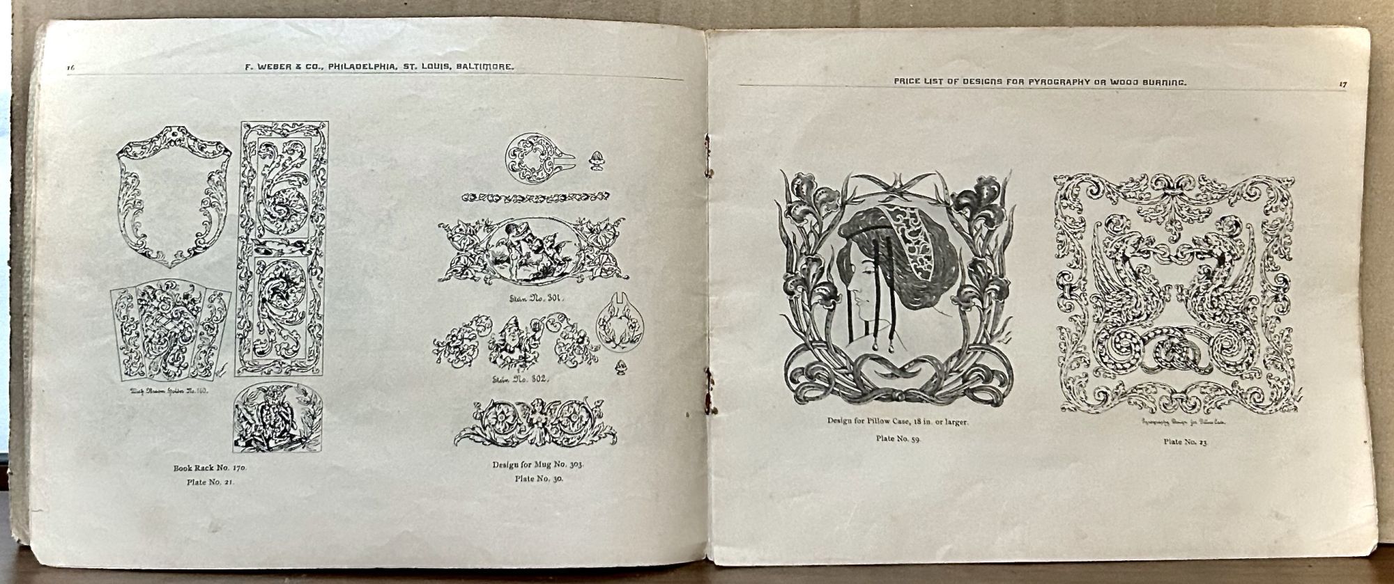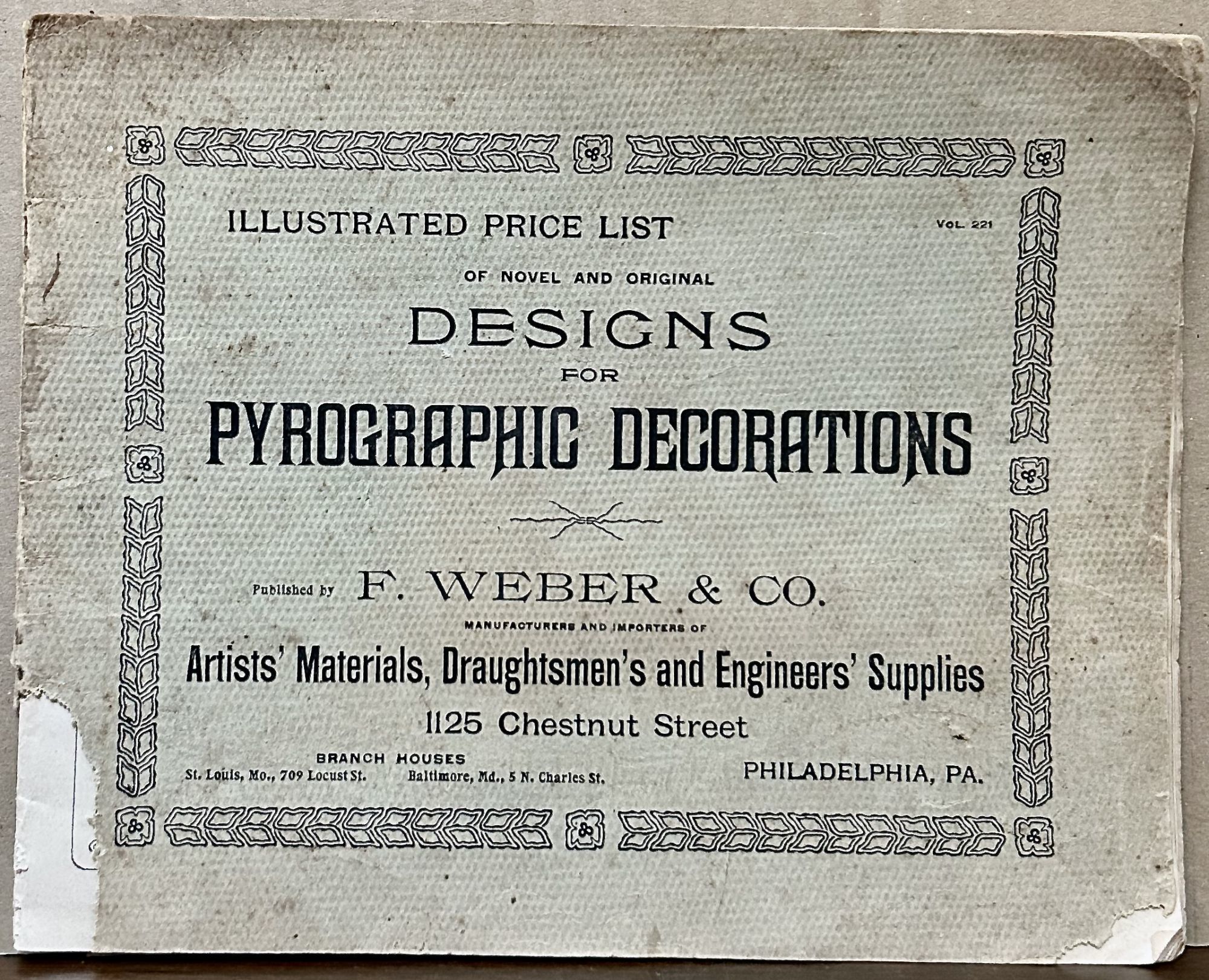 Philadelphia: F. Weber & Co, 1900. Wraps. Buff wrappers lettered in black. Very good. 46 pages. 20 x 25 cm. Pyrography or pyrogravure is the free handed art of decorating wood or other materials with burn marks resulting from the controlled application of a heated source. Over 100 images. One of the oldest art form for cultures including Egyptians and some African tribes, "writing with fire" from the Greek pur (fire). The application was popular in the USA from the 1880's through the 1920's. Covers lacking small portions lower left and right corners.