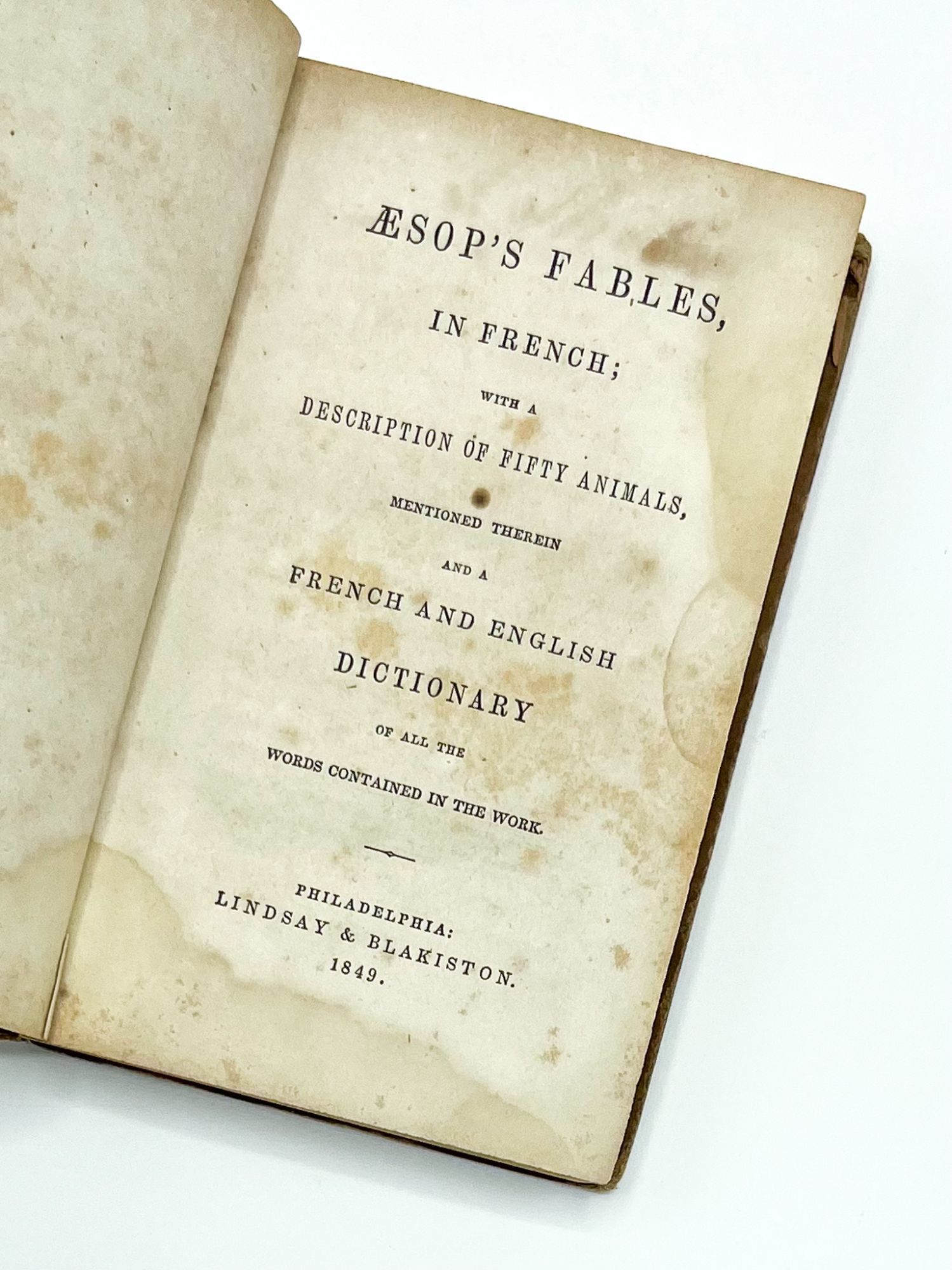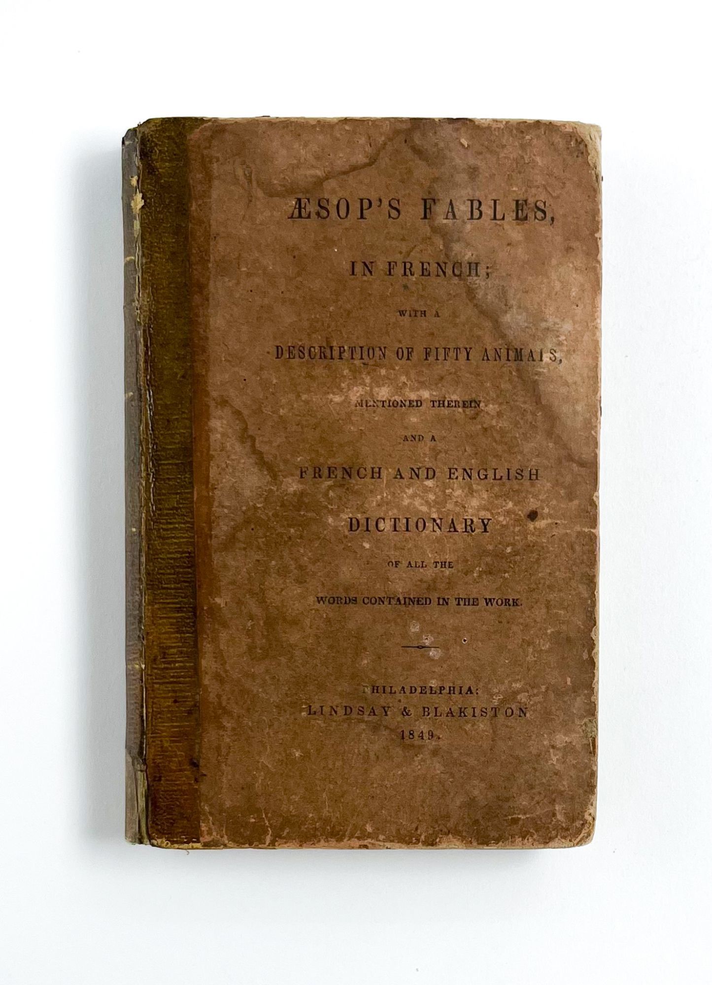 Philadelphia: Lindsay & Blakiston, 1849. Very good.. Early edition of this French reader for young US learners, published as the cracks that would lead to the Civil War began to form. The world economic status of the US in 1849 was strong, due in no small part to the country's ability to produce cotton cheaply through the labor of enslaved people. With the rise of Industrial Revolution technology, people were able to move around the globe faster than every before – an urban American student learning French in this period was not only engaging in mental stimulation, but actually stood a chance of using their skills to eventually converse with a real French person. ÆSOP'S FABLES, IN FRENCH was published during this period, offering moral anecdotes alongside "those idiomatic forms of speech" that "characterize a language" (Advertisement).