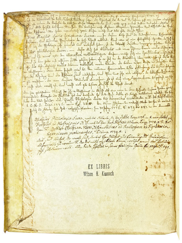 Substantial work of biblical scholarship divided into five sections, the latter three devoted to the grammar and rhetoric of biblical Hebrew. Reprinted in the lifetime of the German author Salomon Glass (1593-1656), the 18th century editions such as this one were published under the editorship of the German Lutheran theologian Johann Franz Buddeus (1666-1729).