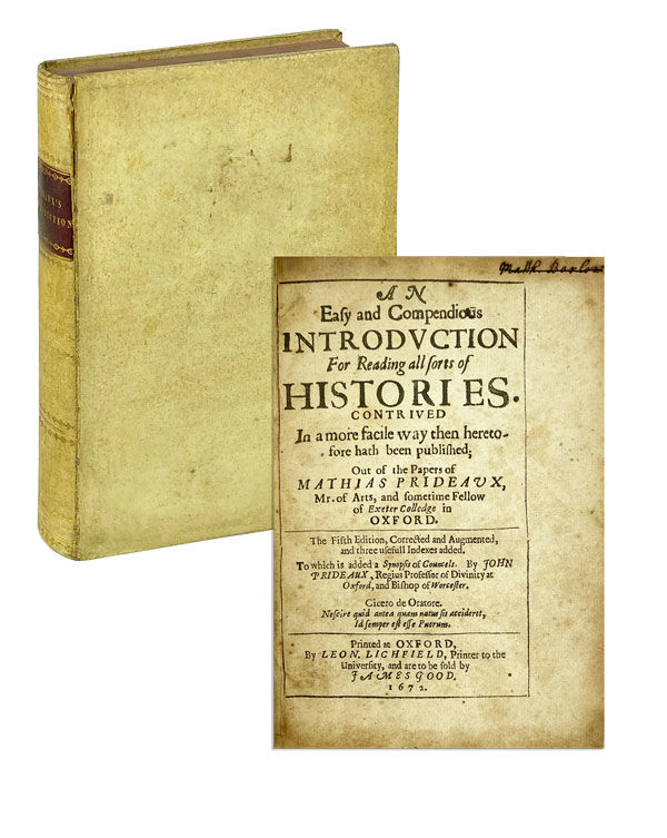 Compilation of three titles (see below) of historiography compiled from the papers of the late Mathias Prideaux (1622-1646?) to which is appended his father John Prideaux's work "Synopsis of Councels" (title page dated 1671). Each title issued with a separate title page, though only the final work has separate pagination. The latter two works in this volume by Mathias Prideaux include: "Of Political History in General, deduced from Nimrod" (title page dated 1669); and "Of the History of Successions, in states, countries, and families" (title page dated 1670).