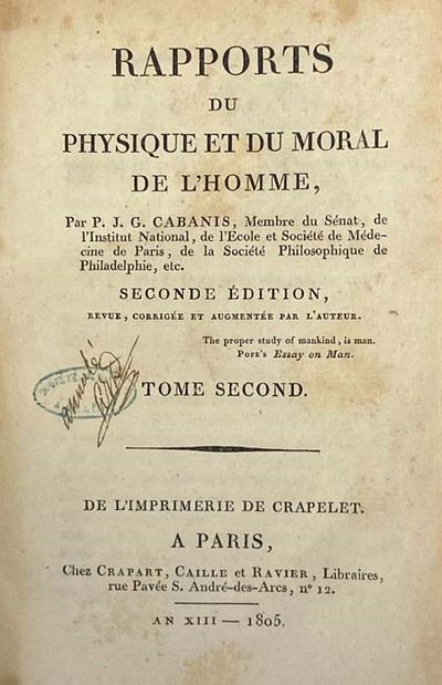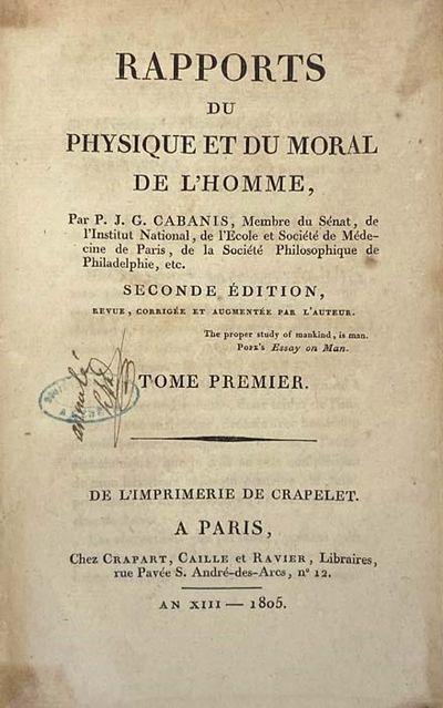 Paris: Chez Crapart, Caille et Ravier, Libraires, 1805. Second Edition. Full-Leather. Good/No Jacket. Second edition. Spine a bit scuffed, fore edge corners exposed, lightly to moderately foxed throughout, ink names and stamps on endpapers. 1805 Full-Leather. Complete in two volumes. xliii, 569; 720 pp. French text. Brown leather spines and corners over paper-covered boards, gilt titles and rules. A work of materialist philosophy linking psychology and biology; Schopenhauer was a strong proponent of Cabanis's work. Cabanis was a freemason and early advocate of evolutionary theory whose writings influenced Lamarck.