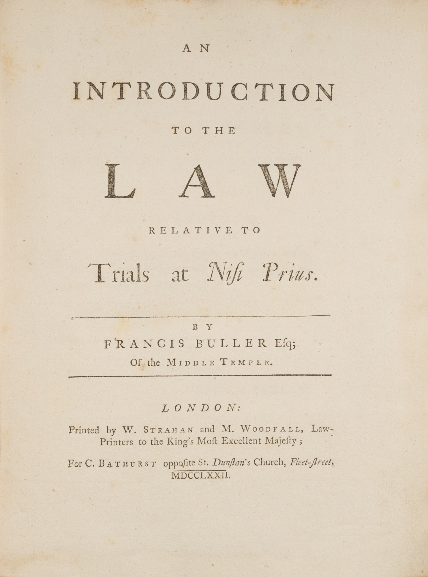 1772. London: W. Straham and M. Woodfall, 1772.. London: W. Straham and M. Woodfall, 1772. Buller's Guide to the Circuits [C] [Buller, Sir Francis [1746-1800]. An Introduction to the Law Relative to Trials at Nisi Prius. London: Printed by W. Straham and M. Woodfall, 1772. vii, [1], 330, [42] pp. Quarto (10-1/2" x 9"). Contemporary calf, blind rules to boards, blind fillets along joints, raised bands and lettering piece to spine, blind tooling to board edges. Light rubbing and a few minor scuffs and spots to boards, which are beginning to separate but secure, moderate rubbing to extremities, chipping to spine ends, minor nicks to spine, corners bumped and moderately worn. Moderate toning to interior, light foxing to a few leaves, offsetting to margins of endleaves, location number in tiny early hand to front pastedown. $450. * Second edition. First published in 1767, Buller's treatise on trial practice in rural places is derived from a collection of trials by his uncle, Bathurst, who is sometimes listed as the author. The second edition is considerably enlarged with original material. A standard work for decades, it went though several reissues and seven editions, the last in 1817. Writing in the late 1840s, Marvin notes that it was "still useful because it contains some authorities not elsewhere to be met with." Marvin, Legal Bibliography 158. English Short-Title Catalogue T101058.