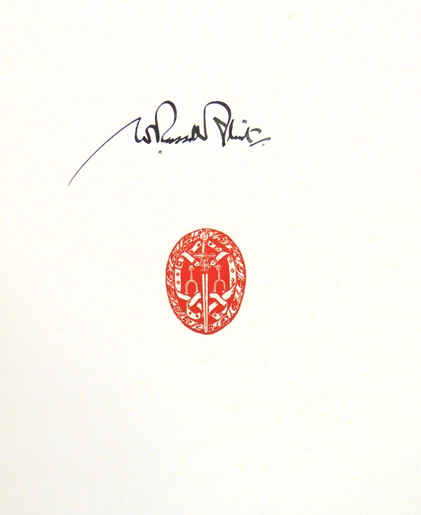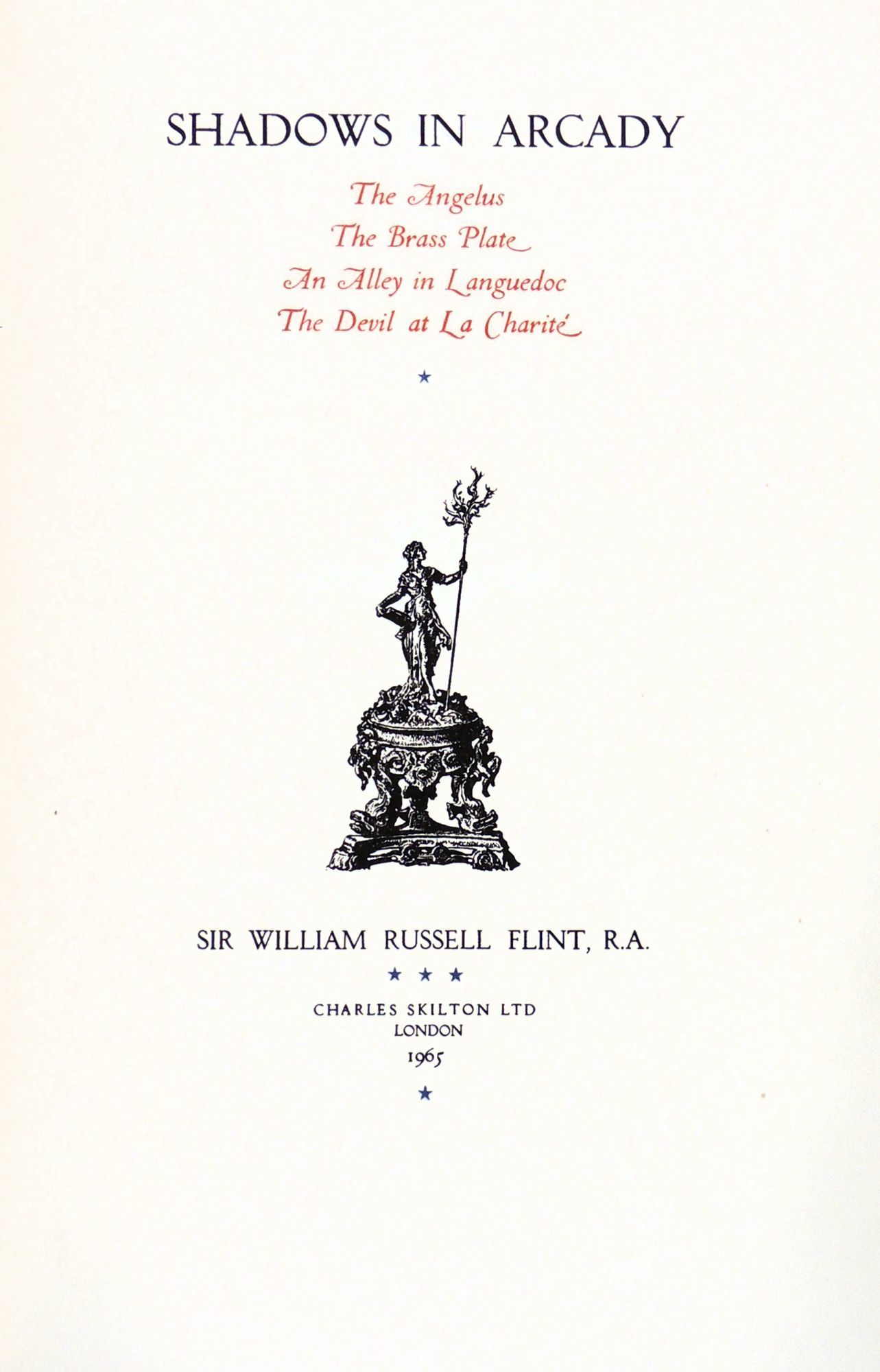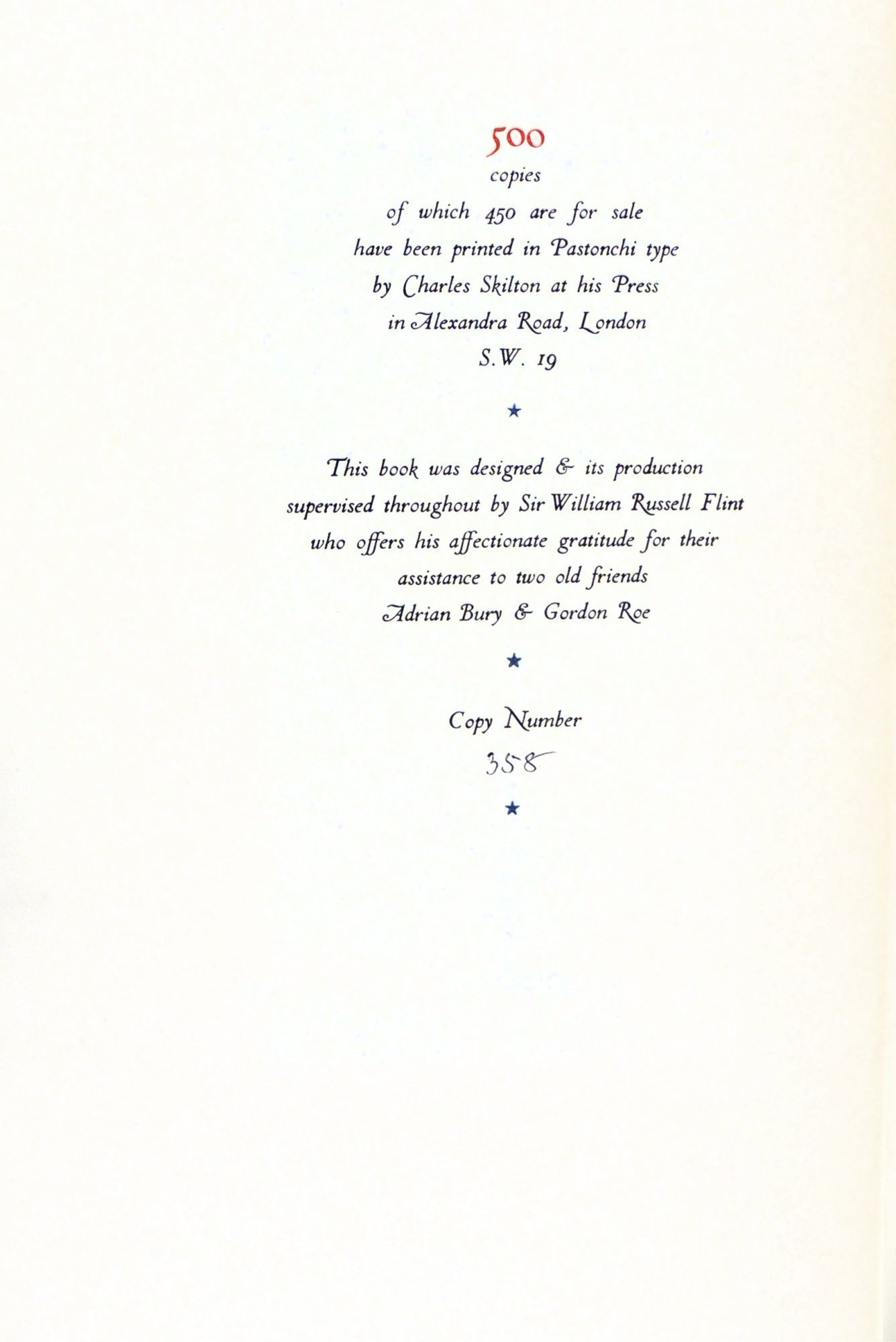 London: Charles Skilton Ltd, 1965. Hardcover. Very Good. Hardcover. Number 358 of 500 copies, signed by Sir Russell Flint in rear. A collection of four essays, three of which are true and is (according to author) at least half true. Scottish artist and illustrator Sir Russell Fllint (1880 - 1969) is best known for his watercolor paintings of women; although, he also worked in oil, tempura, and created prints. This book has been finely printed in Pastonchi type by Charles Skilton at his press in red, blue, and black inks with notes printed in tan. It is bound in blue cloth backed black cloth covered boards with gilt title to spine and gilt illustration of a key to front board. Light sunning to spine and gentle bumping to corners. Housed in a blue paper covered slipcase. Wear to edges and panels of case with bump to botto corner and split along one seam. Rubbing, sunning, and evidence of removed price label to panels of case. 59 pages. PRI/020923.